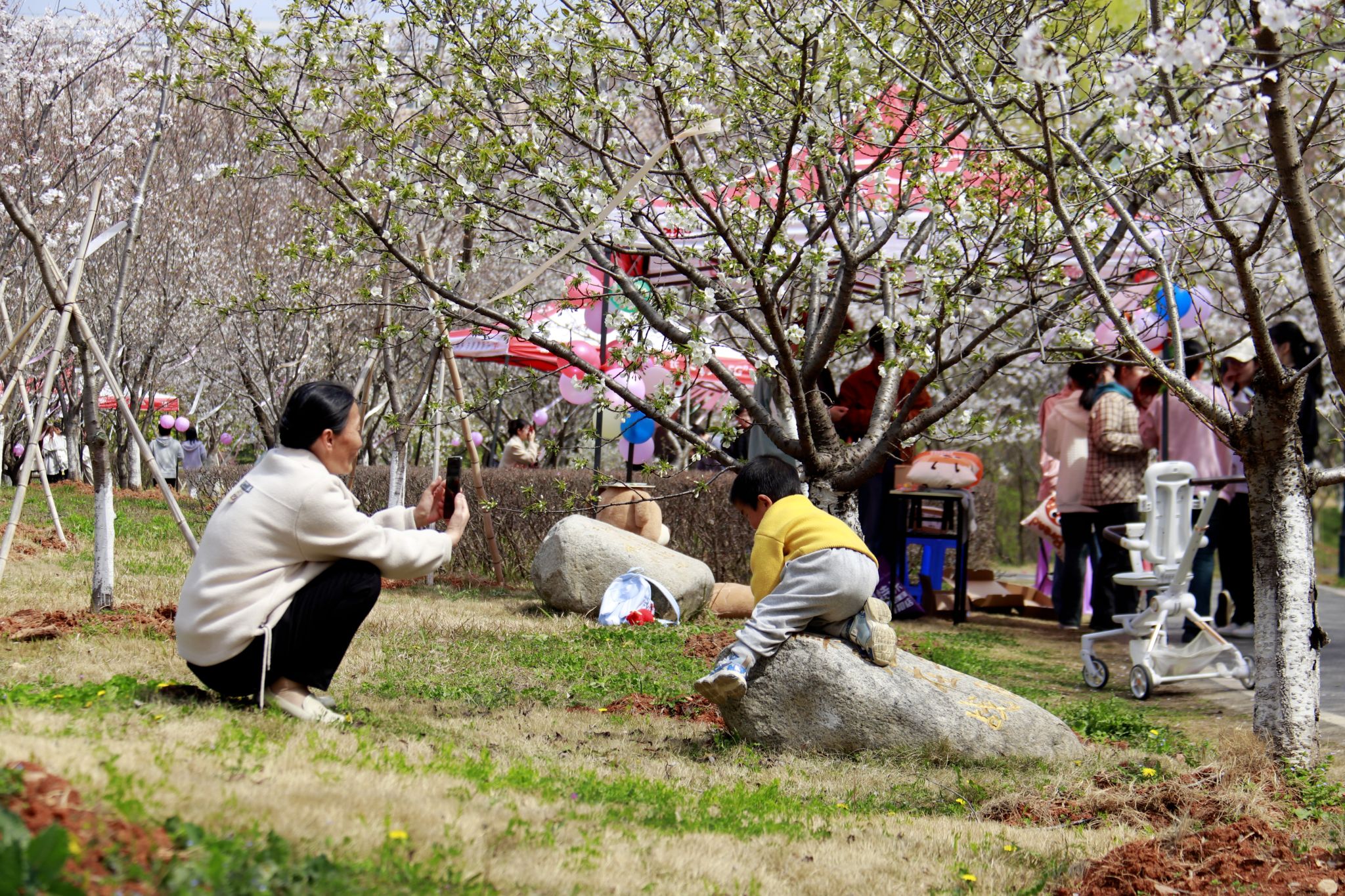 家长记录樱花树下玩耍的小朋友 郭劼摄