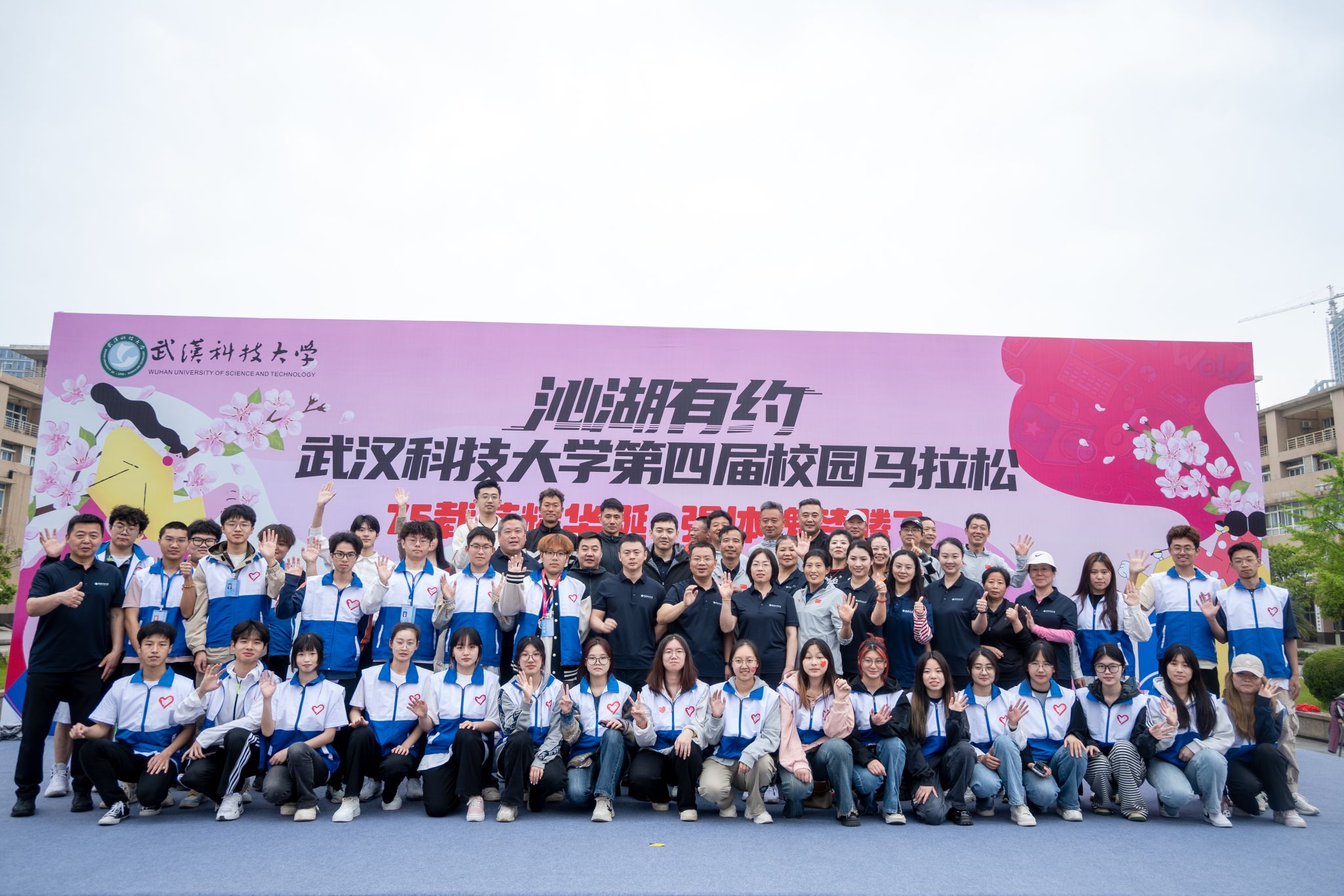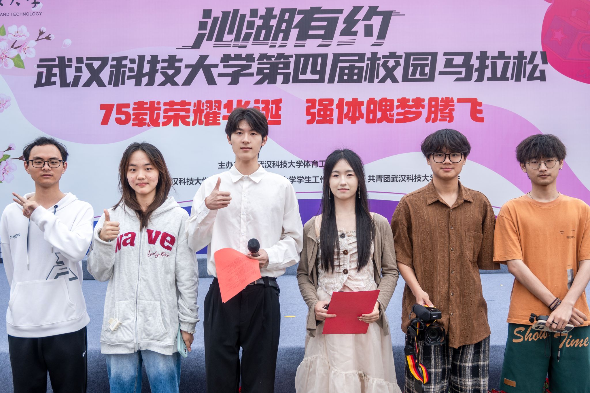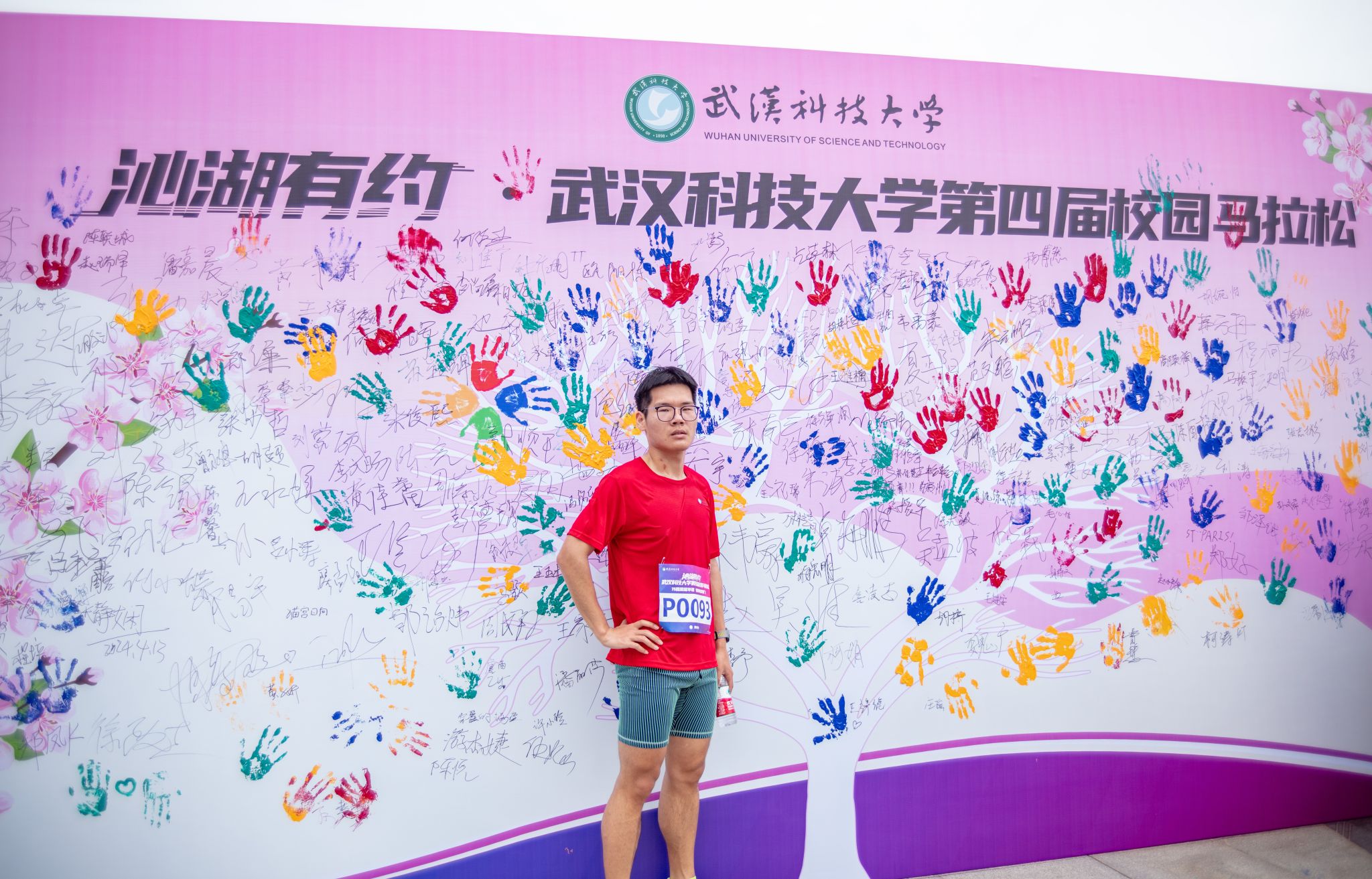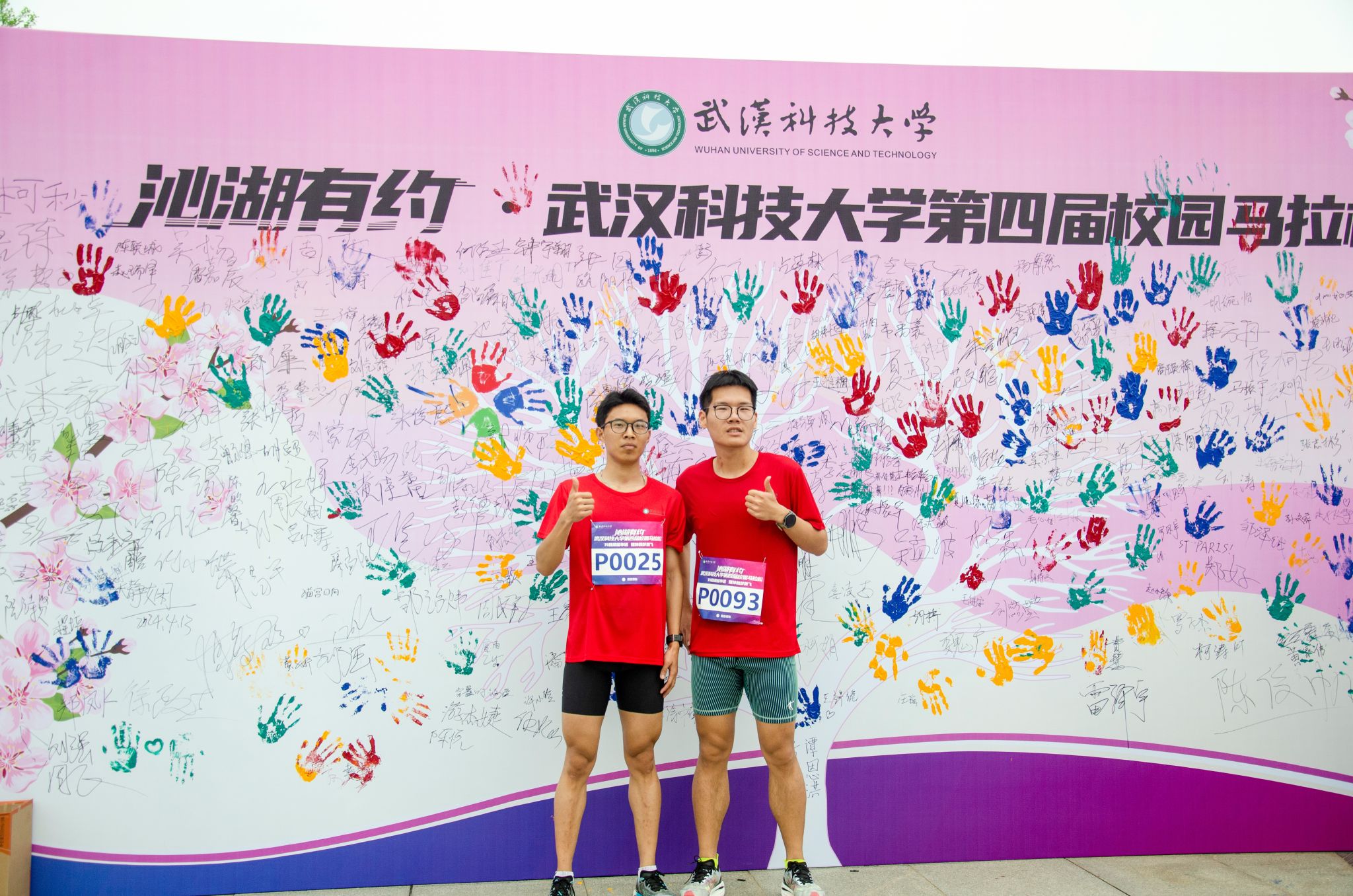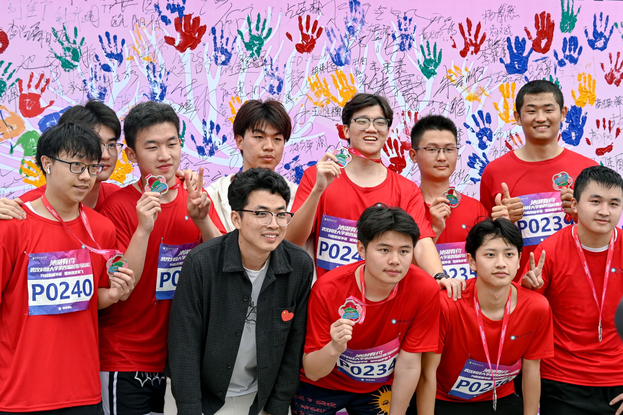参与马拉松的同学签名墙上签名并合影 杨佳伟摄