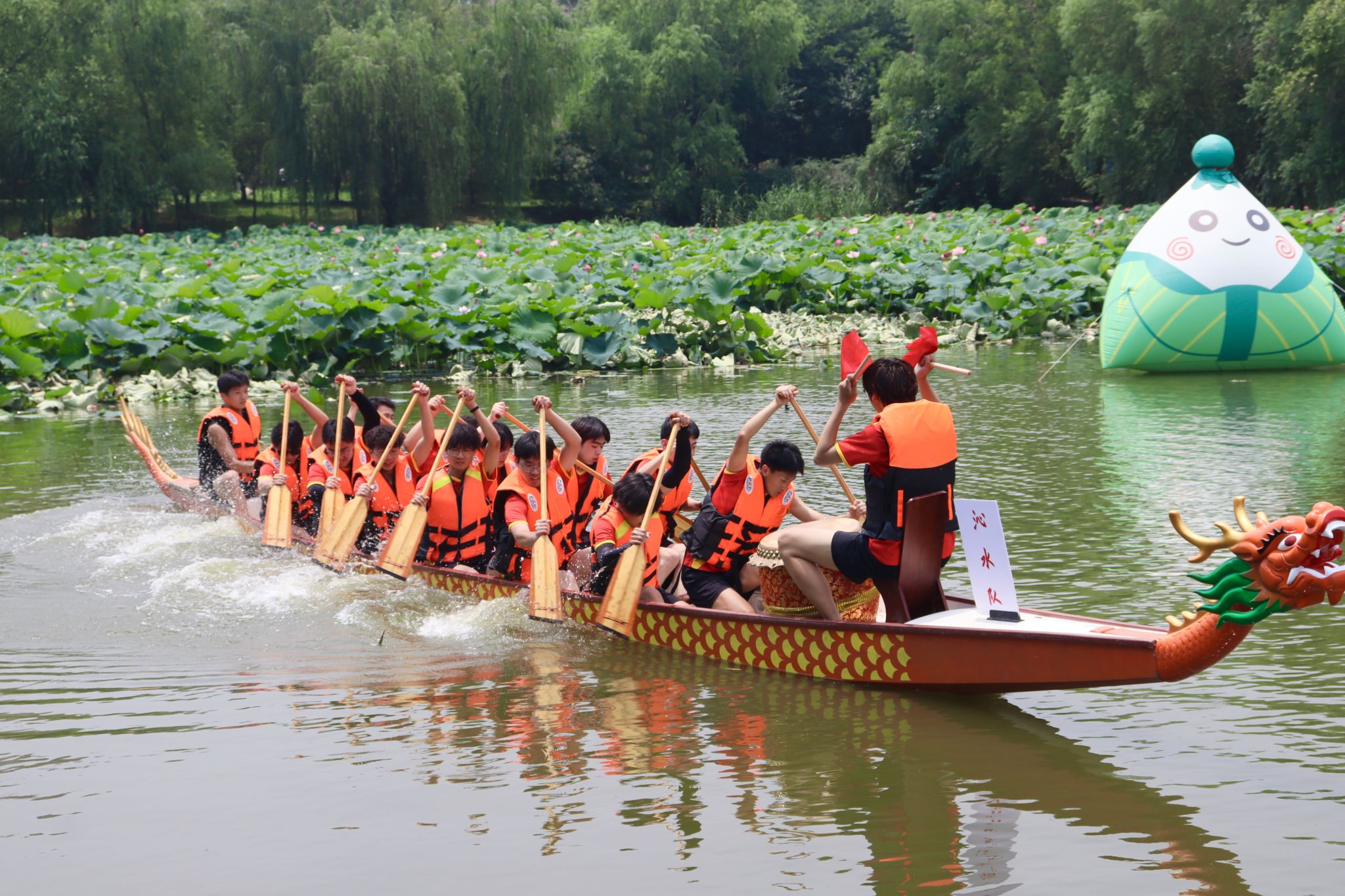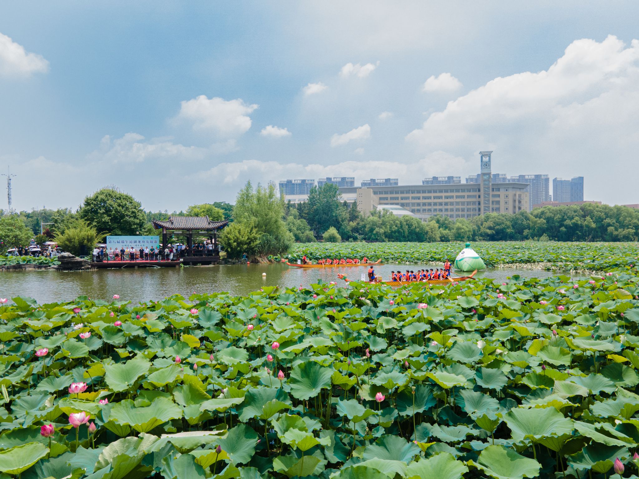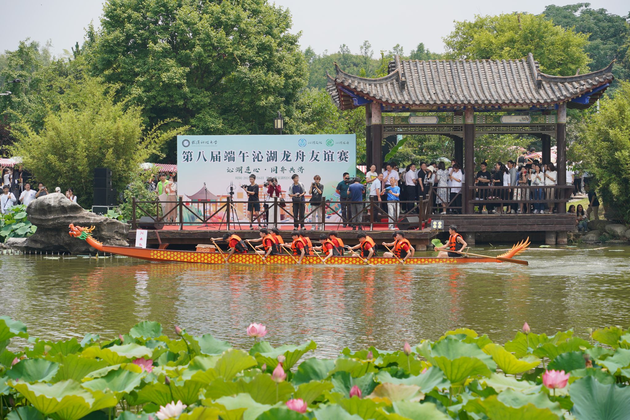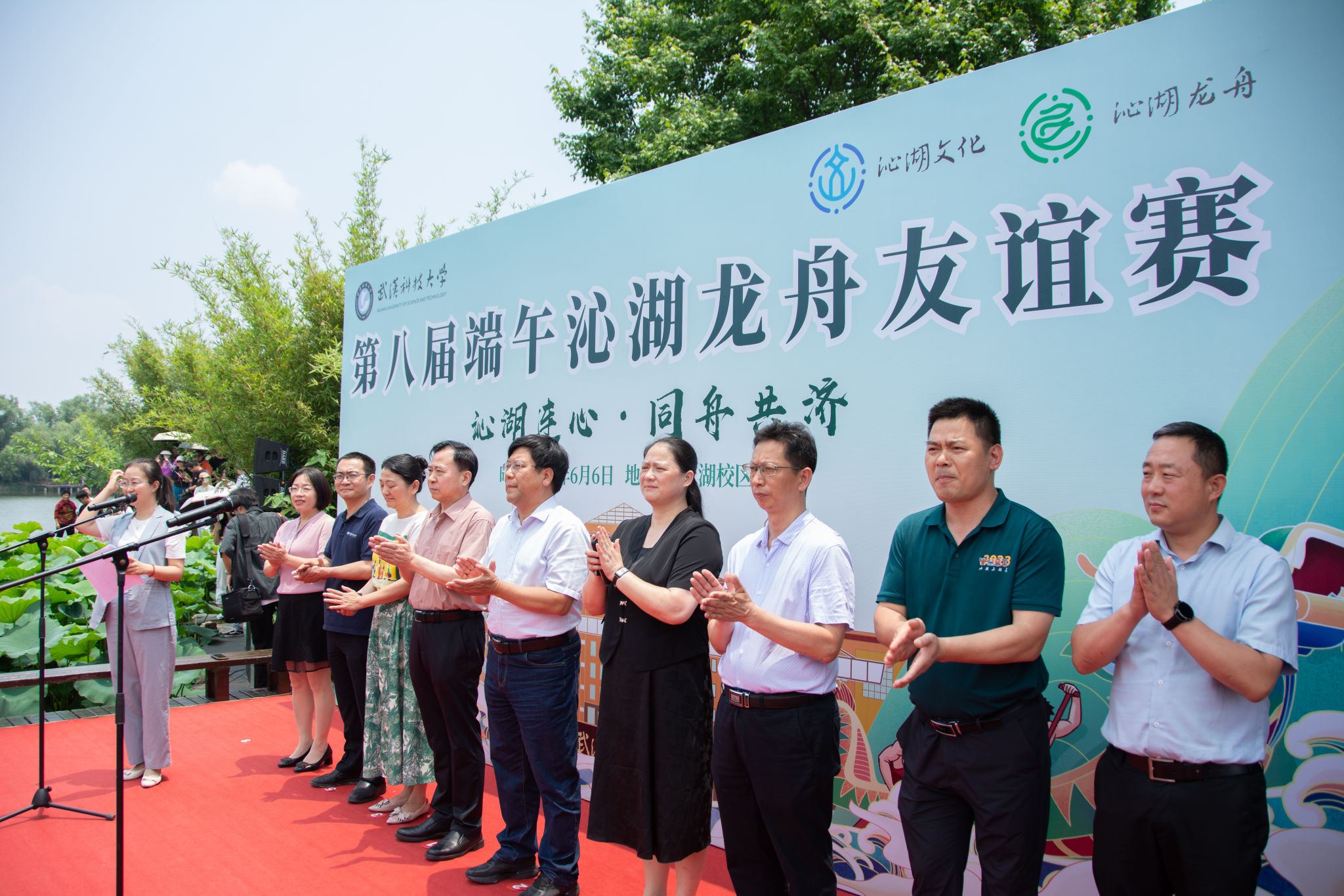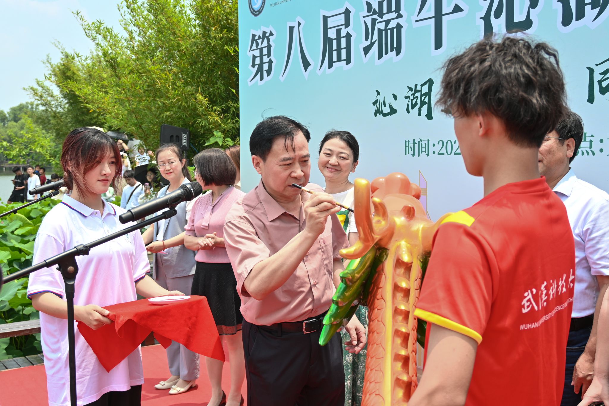 6月6日中午,鸭脖于沁湖畔举办第八届“沁湖连心·同舟共济”端午龙舟友谊赛,副校长沈季伟致辞,校团委副书记向方新宣读赛事竞赛规则、运动员代表宣誓,党委副书记孙国胜为龙舟点睛。由鸭脖龙舟协会成员组成的“沁水”队和由研究生组成的“钢魂”队角逐龙舟总决赛冠军,“沁水”队获胜。现场还设置了系列端午文化主题展演,不少留学生参与包粽子、做艾草,体验端午传统文化。