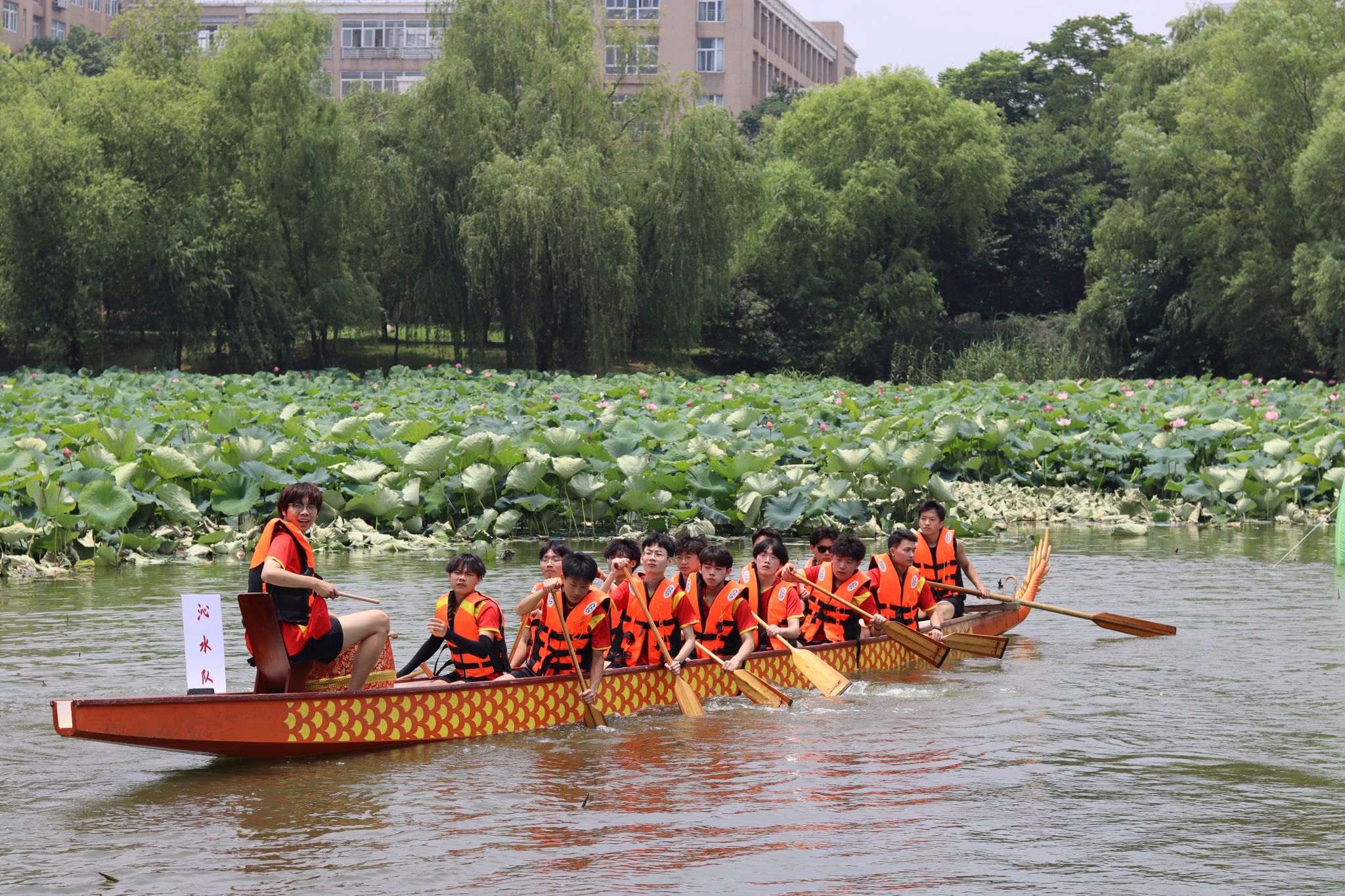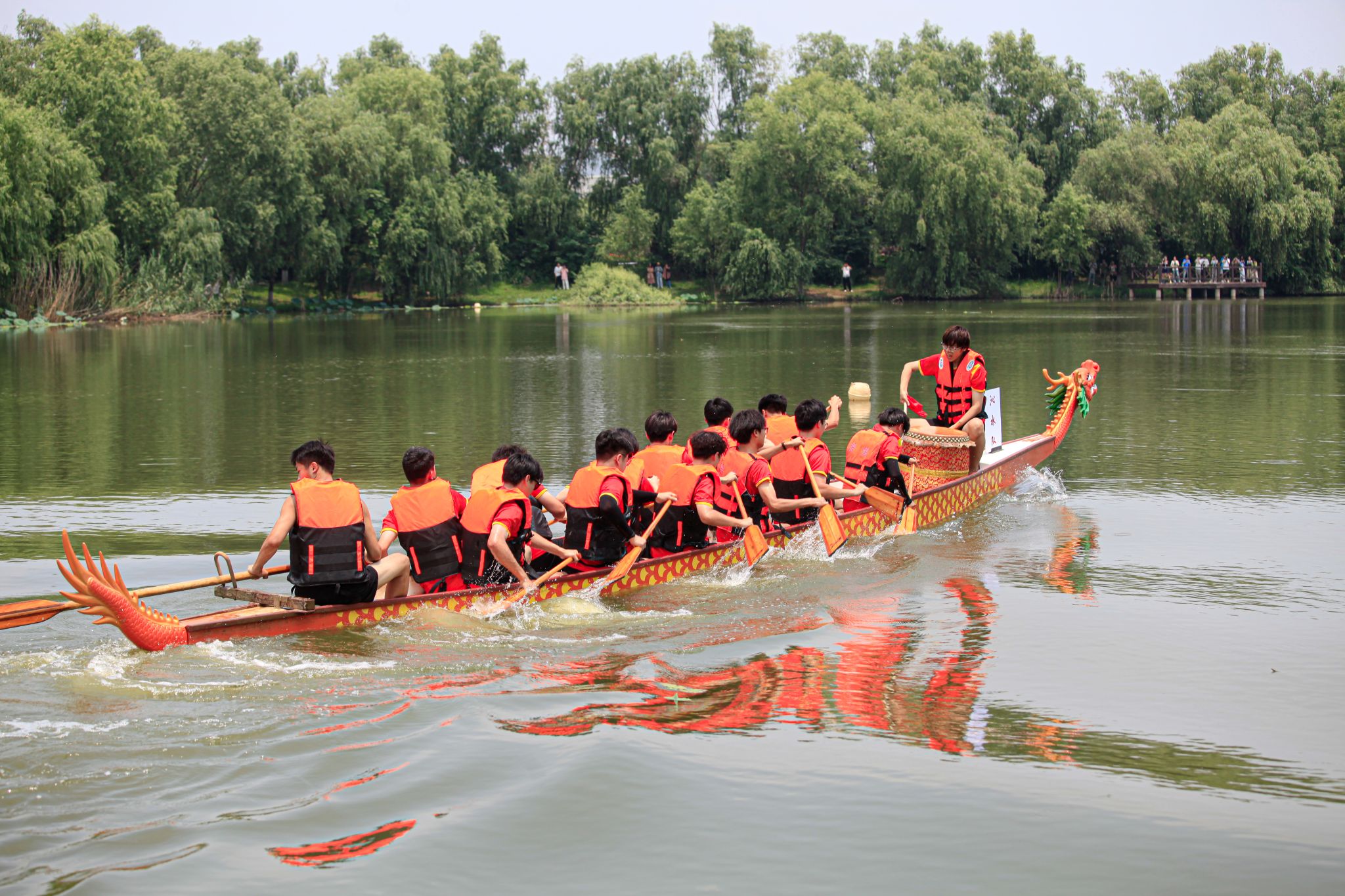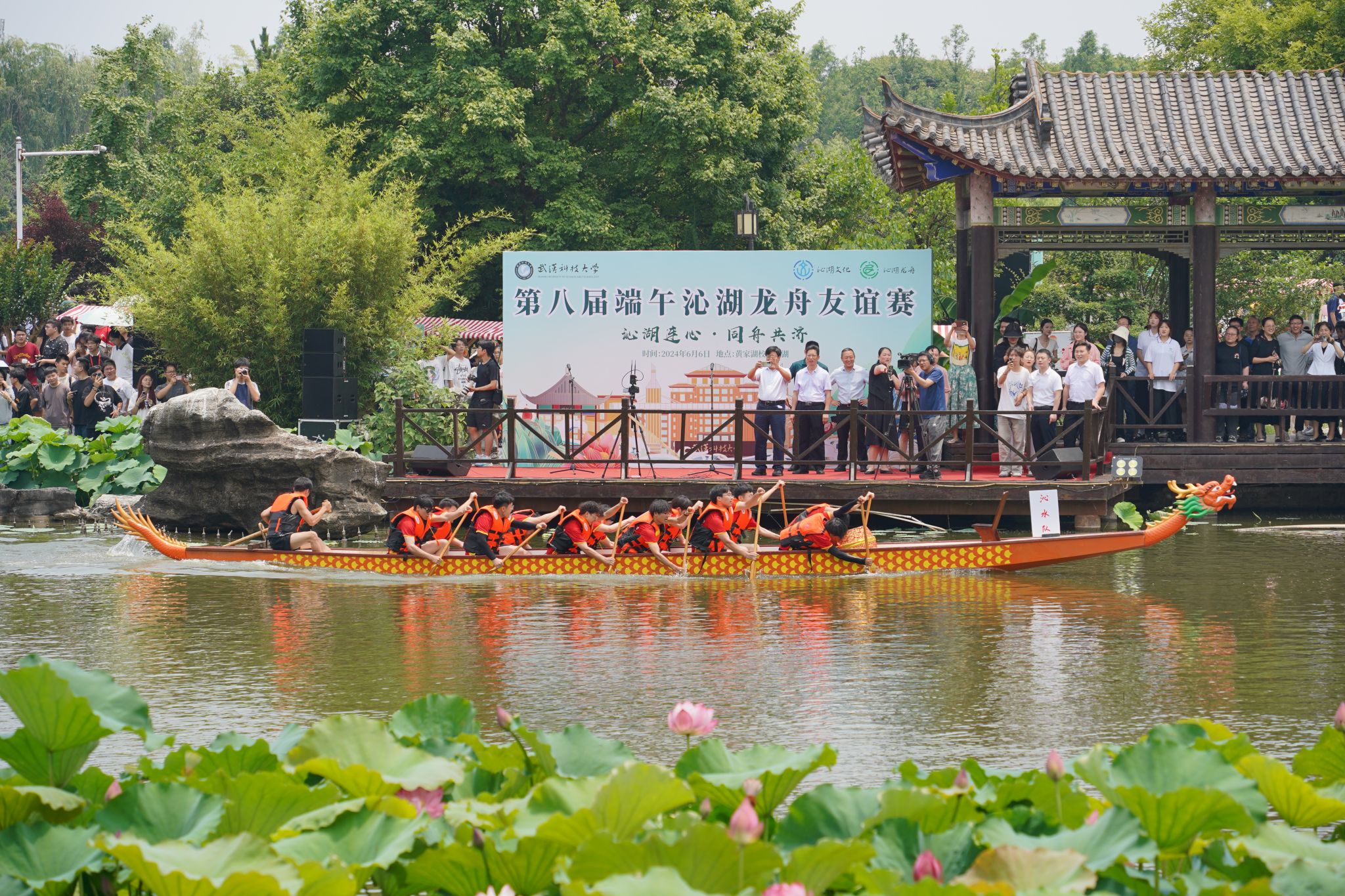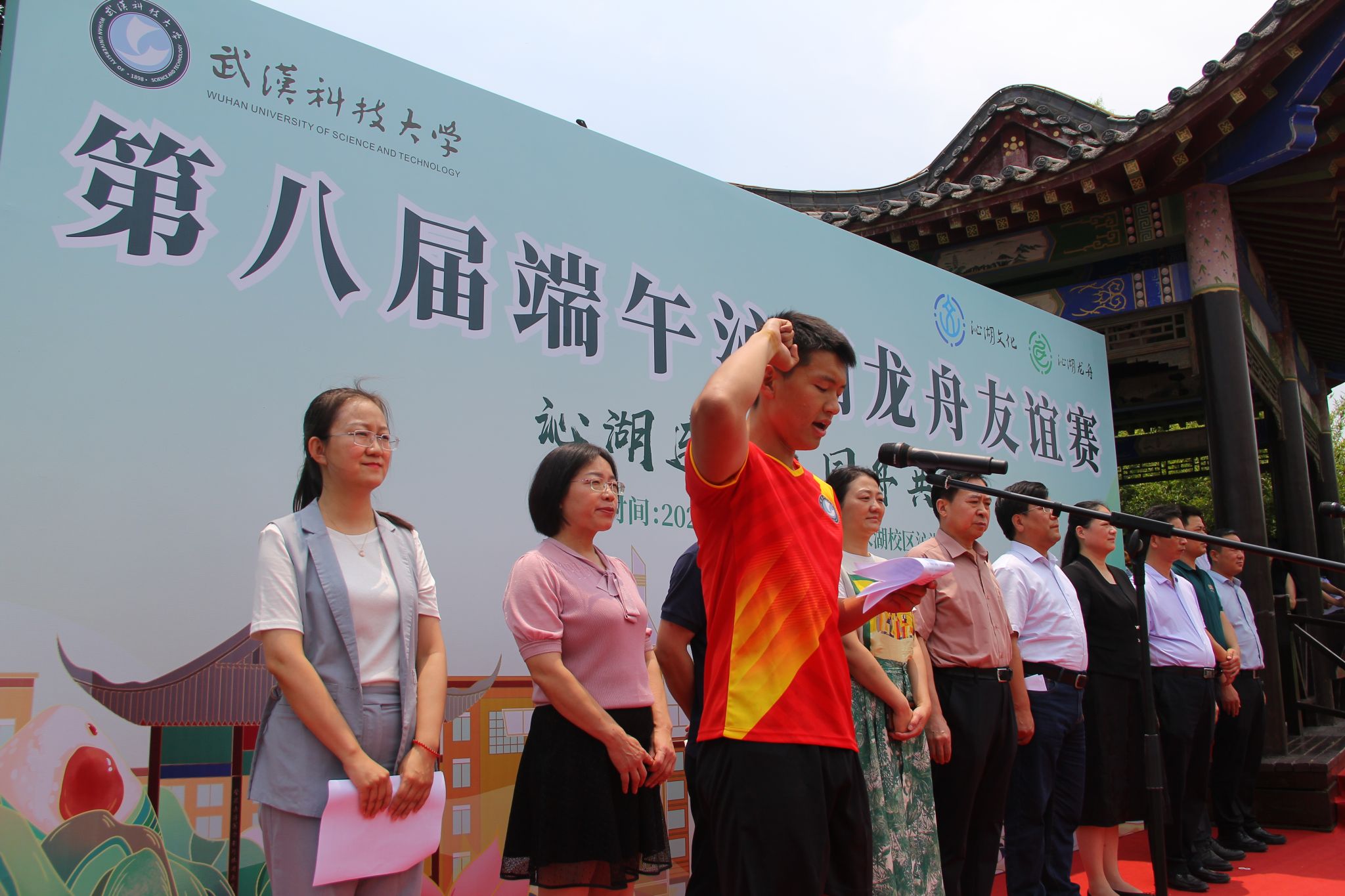 6月6日中午,鸭脖于沁湖畔举办第八届“沁湖连心·同舟共济”端午龙舟友谊赛,副校长沈季伟致辞,校团委副书记向方新宣读赛事竞赛规则、运动员代表宣誓,党委副书记孙国胜为龙舟点睛。由鸭脖龙舟协会成员组成的“沁水”队和由研究生组成的“钢魂”队角逐龙舟总决赛冠军,“沁水”队获胜。现场还设置了系列端午文化主题展演,不少留学生参与包粽子、做艾草,体验端午传统文化。