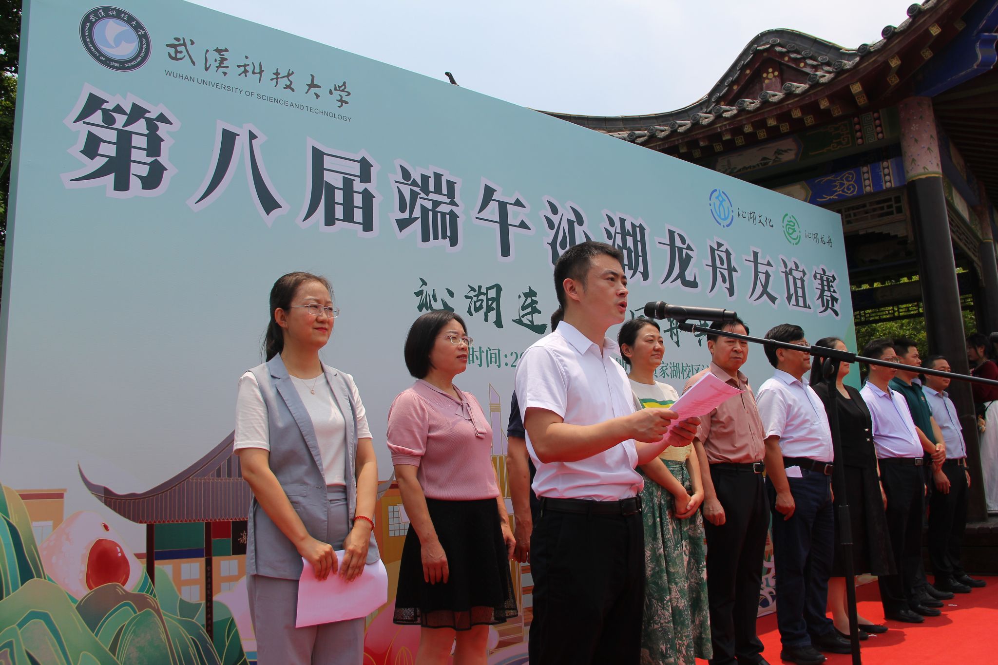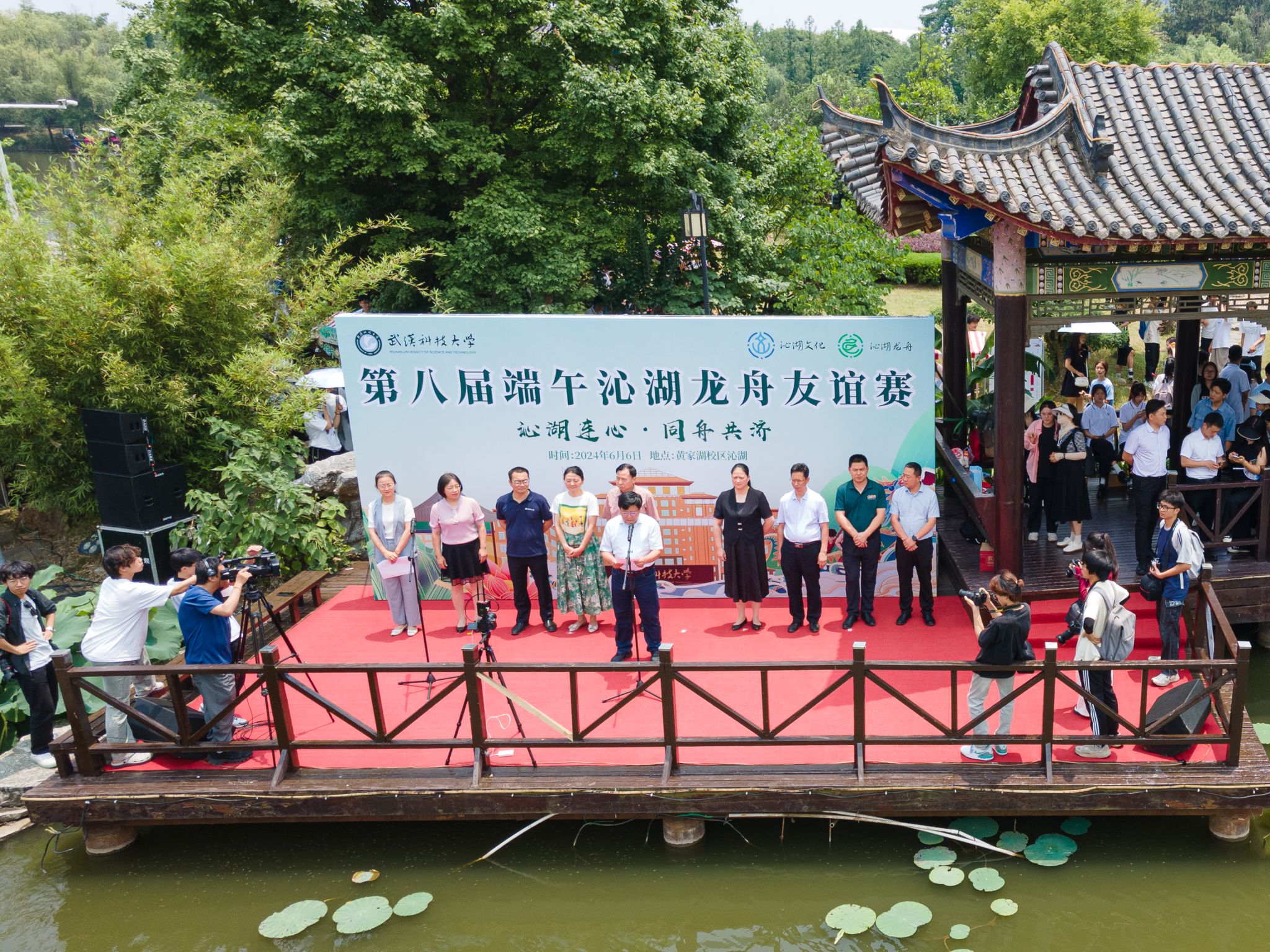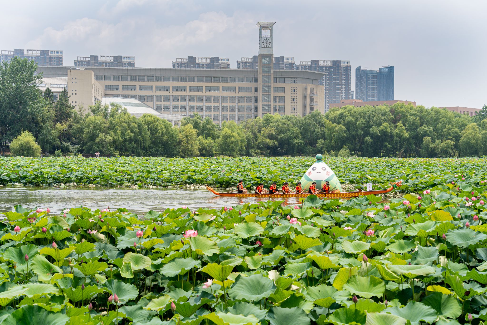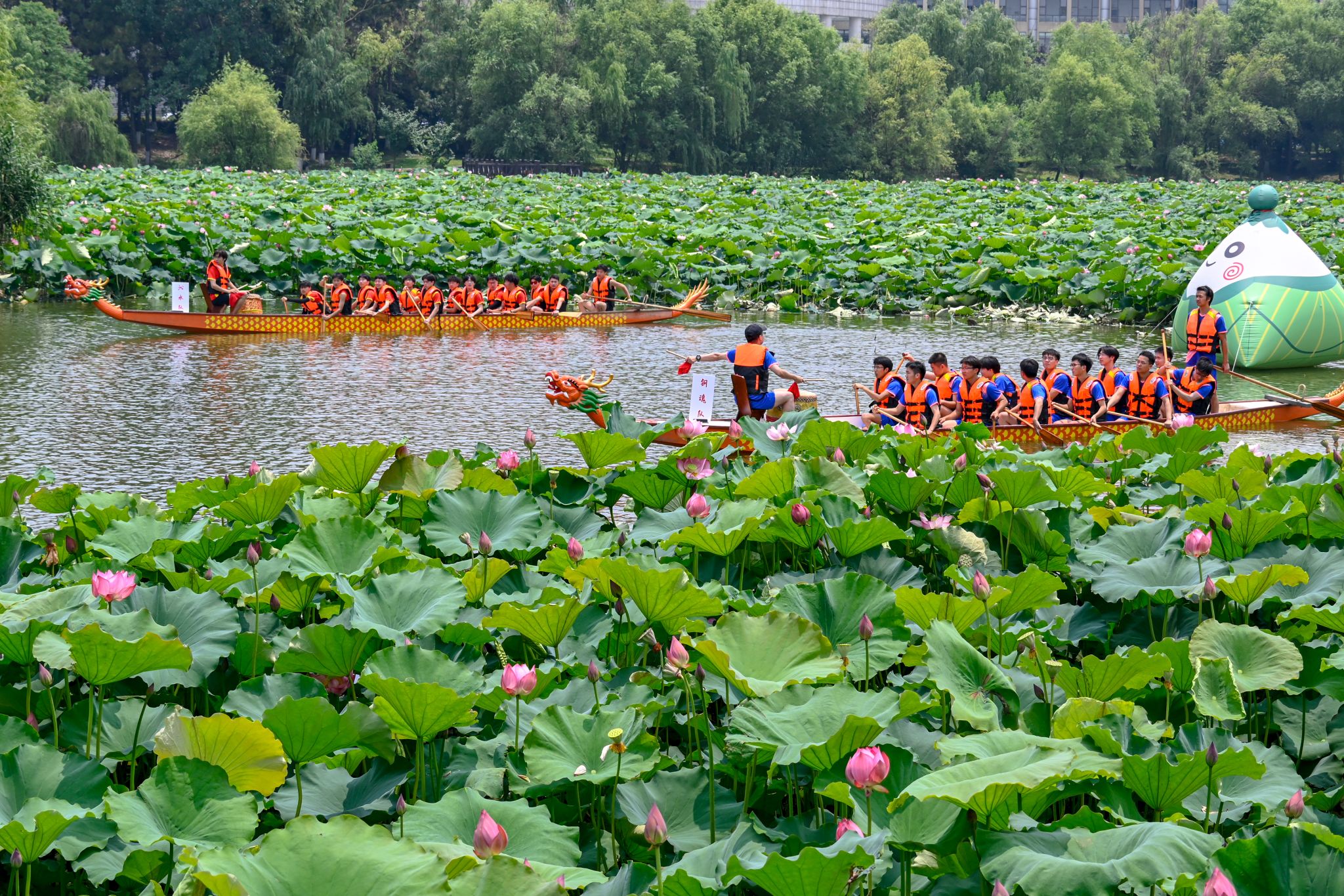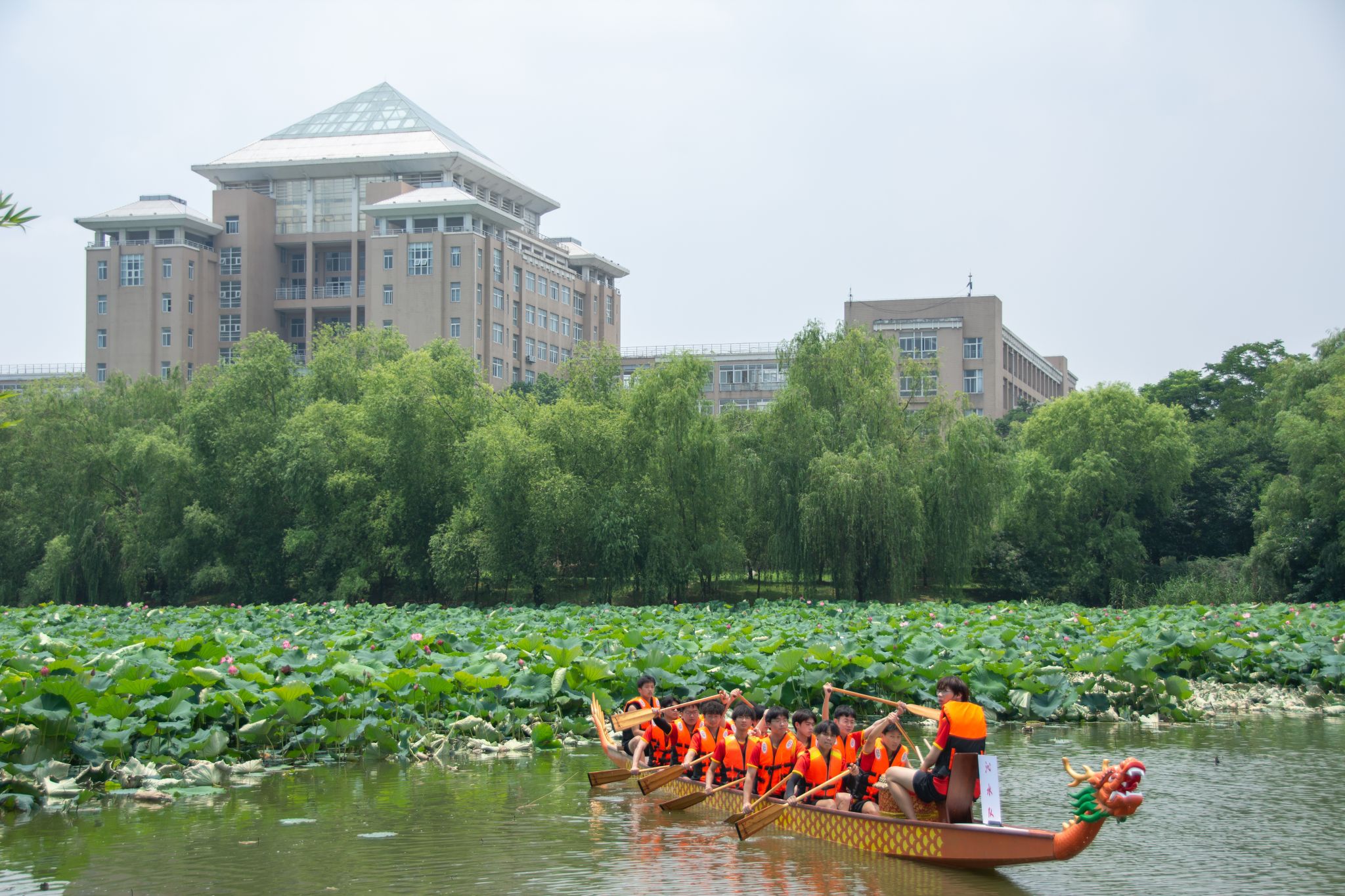 6月6日中午,鸭脖于沁湖畔举办第八届“沁湖连心·同舟共济”端午龙舟友谊赛,副校长沈季伟致辞,校团委副书记向方新宣读赛事竞赛规则、运动员代表宣誓,党委副书记孙国胜为龙舟点睛。由鸭脖龙舟协会成员组成的“沁水”队和由研究生组成的“钢魂”队角逐龙舟总决赛冠军,“沁水”队获胜。现场还设置了系列端午文化主题展演,不少留学生参与包粽子、做艾草,体验端午传统文化。