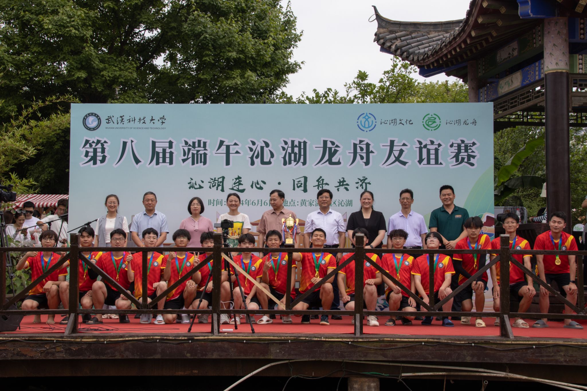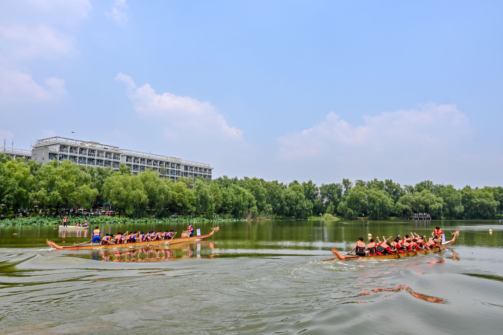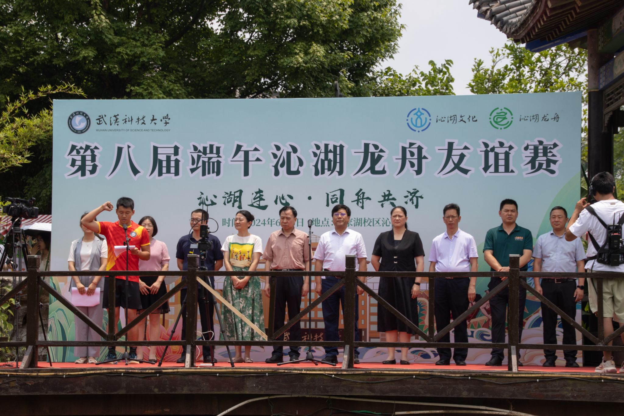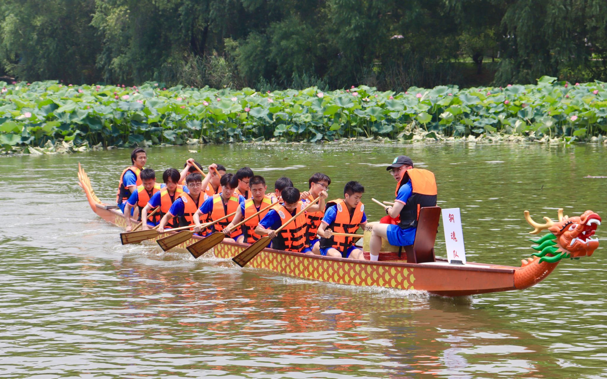 6月6日中午,鸭脖于沁湖畔举办第八届“沁湖连心·同舟共济”端午龙舟友谊赛,副校长沈季伟致辞,校团委副书记向方新宣读赛事竞赛规则、运动员代表宣誓,党委副书记孙国胜为龙舟点睛。由鸭脖龙舟协会成员组成的“沁水”队和由研究生组成的“钢魂”队角逐龙舟总决赛冠军,“沁水”队获胜。现场还设置了系列端午文化主题展演,不少留学生参与包粽子、做艾草,体验端午传统文化。