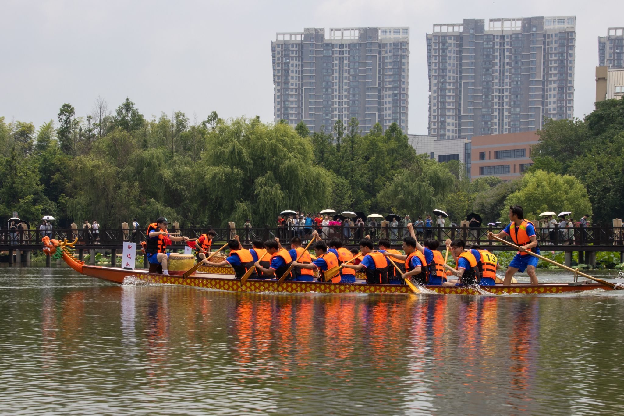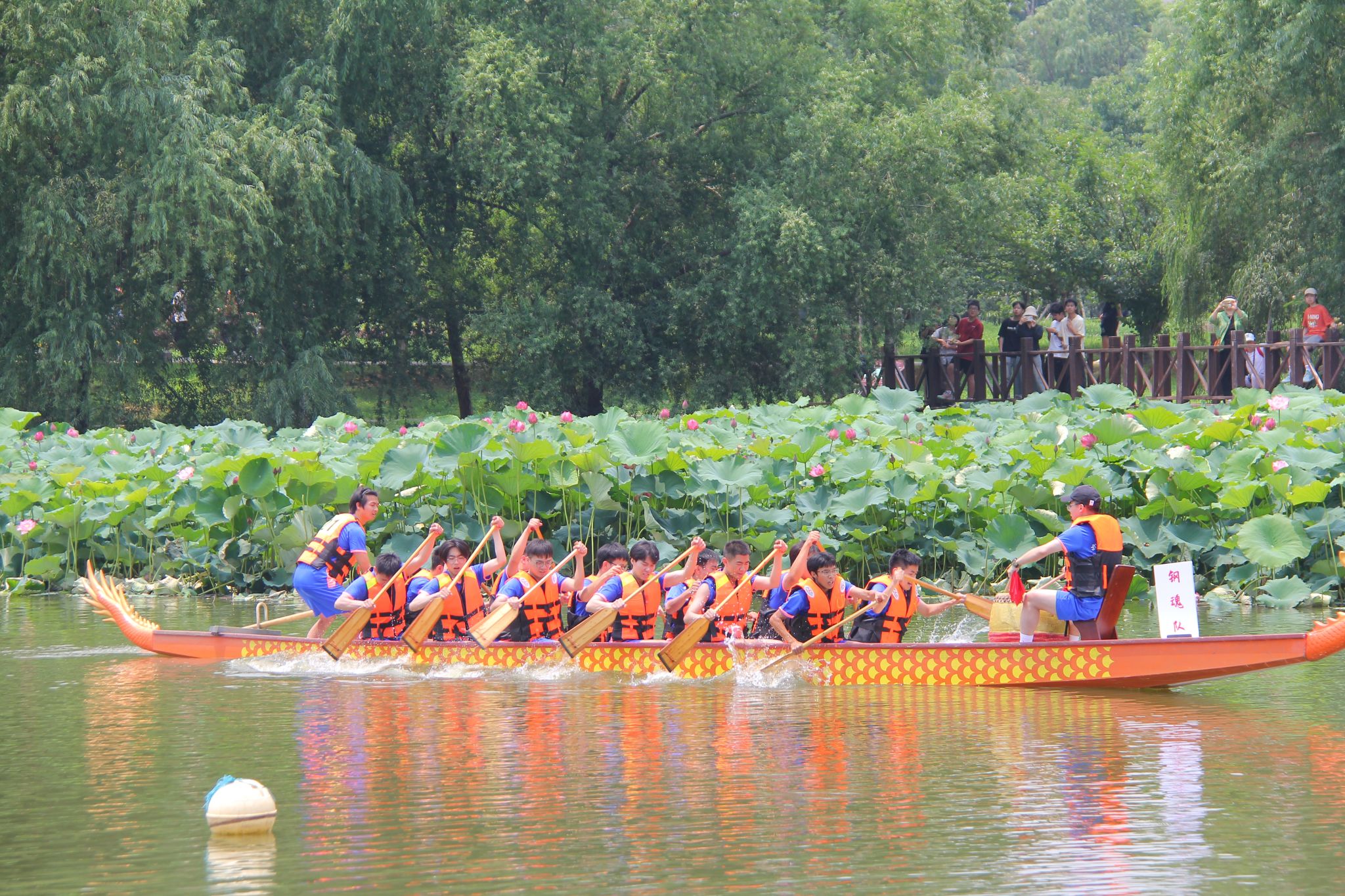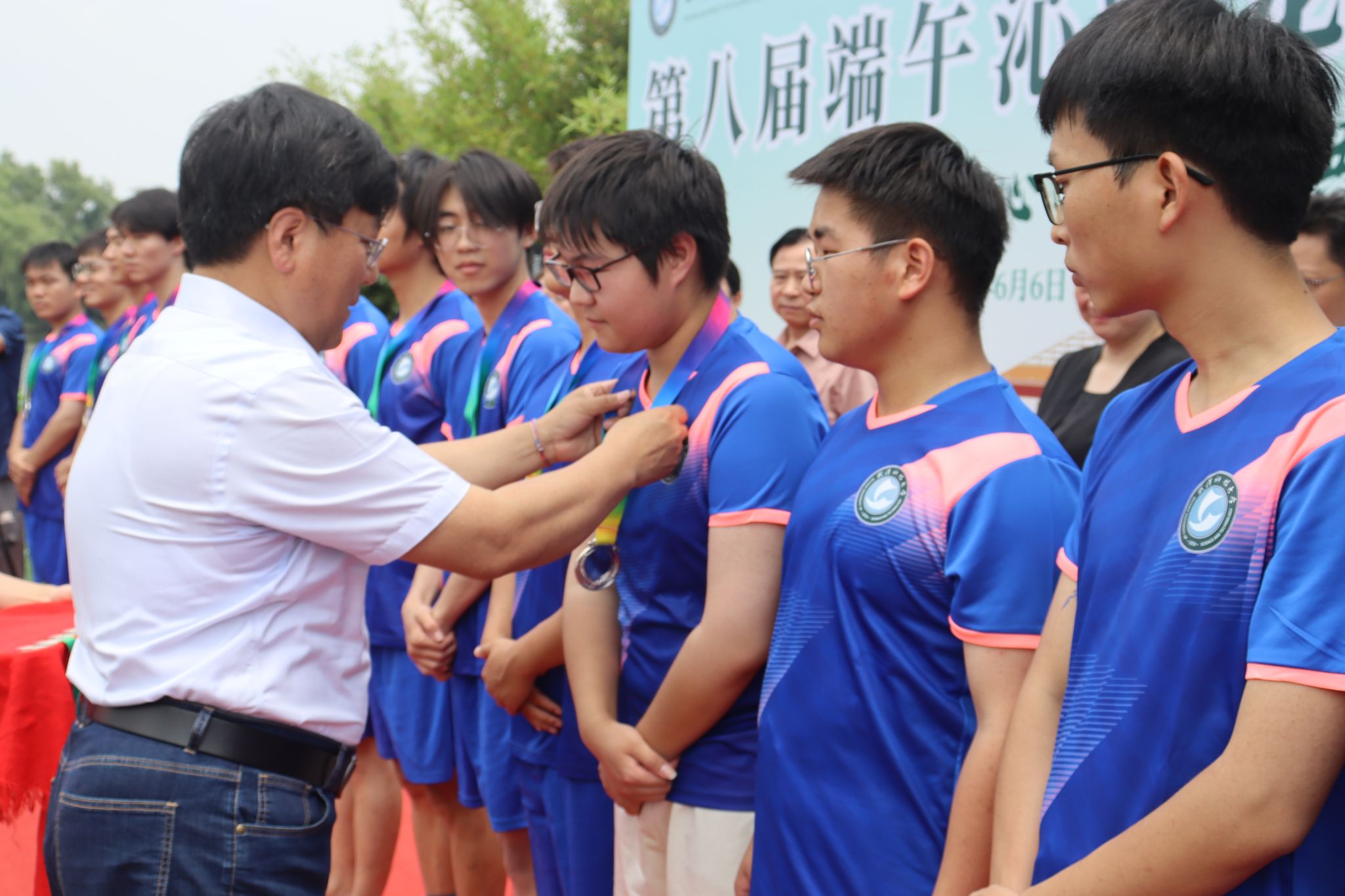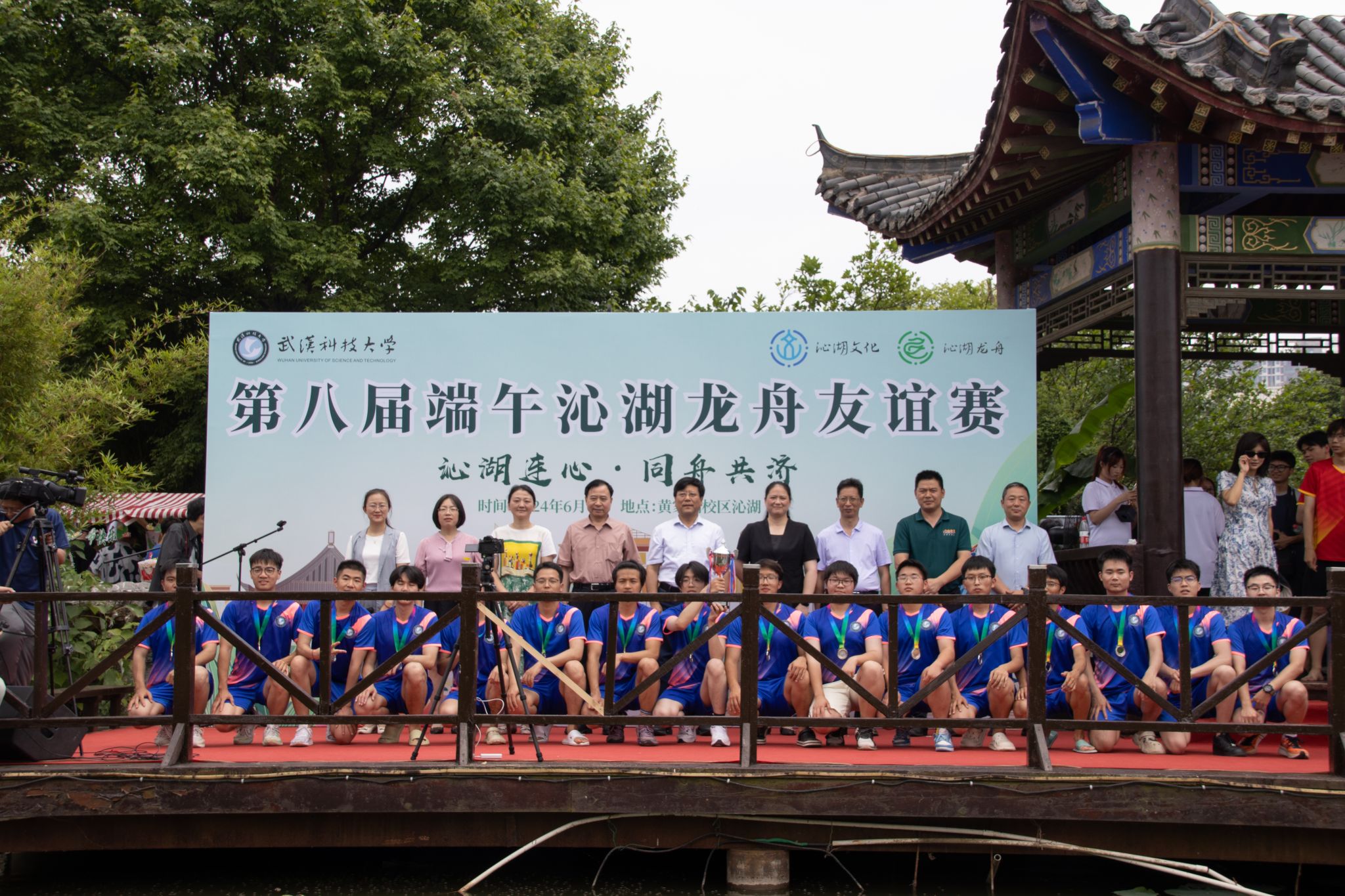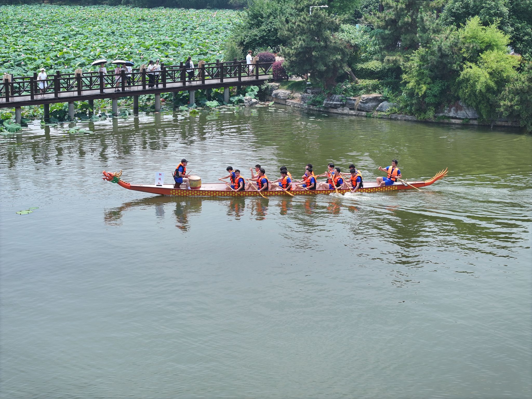6月6日中午,鸭脖于沁湖畔举办第八届“沁湖连心·同舟共济”端午龙舟友谊赛,副校长沈季伟致辞,校团委副书记向方新宣读赛事竞赛规则、运动员代表宣誓,党委副书记孙国胜为龙舟点睛。由鸭脖龙舟协会成员组成的“沁水”队和由研究生组成的“钢魂”队角逐龙舟总决赛冠军,“沁水”队获胜。现场还设置了系列端午文化主题展演,不少留学生参与包粽子、做艾草,体验端午传统文化。