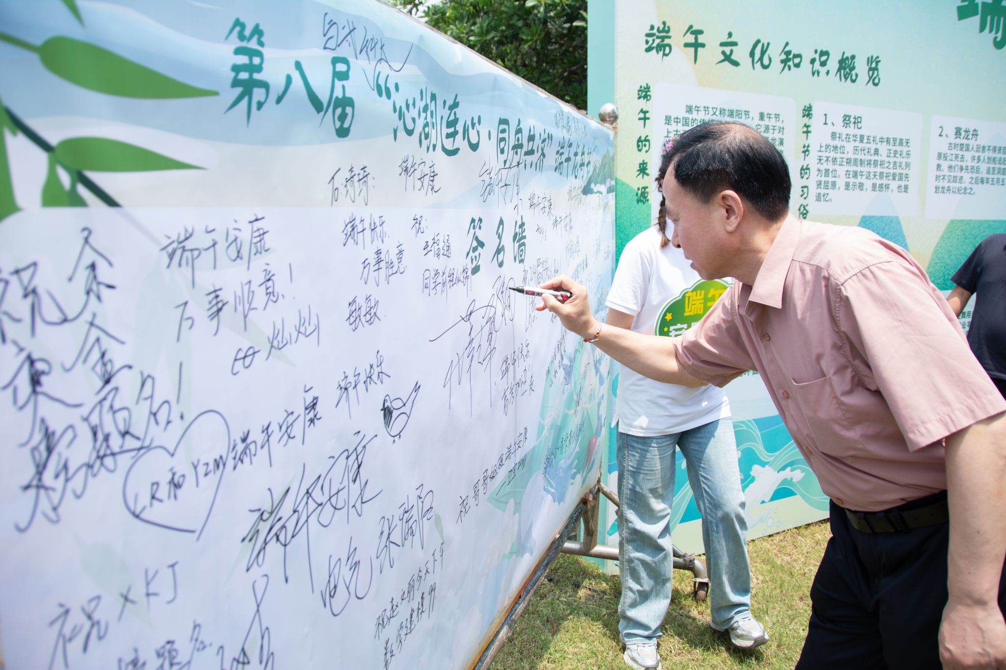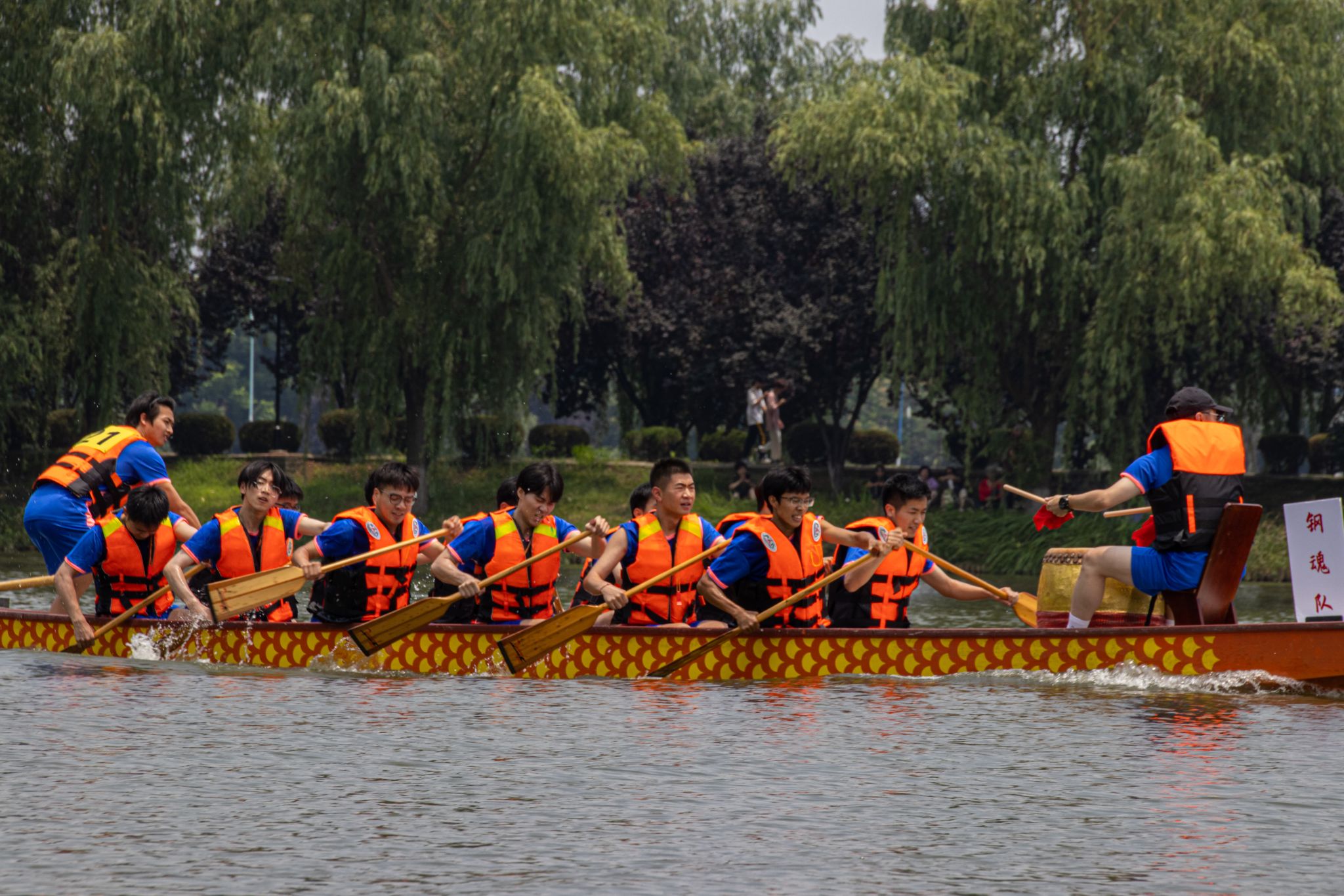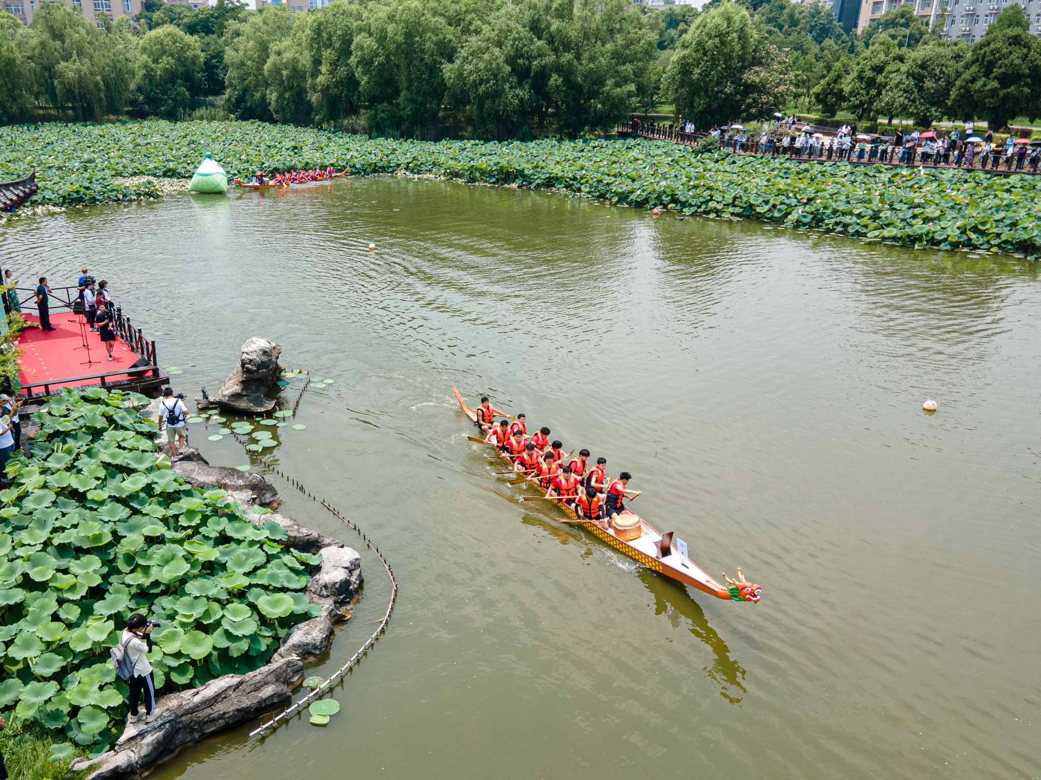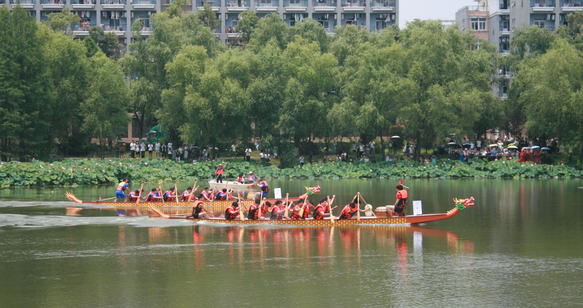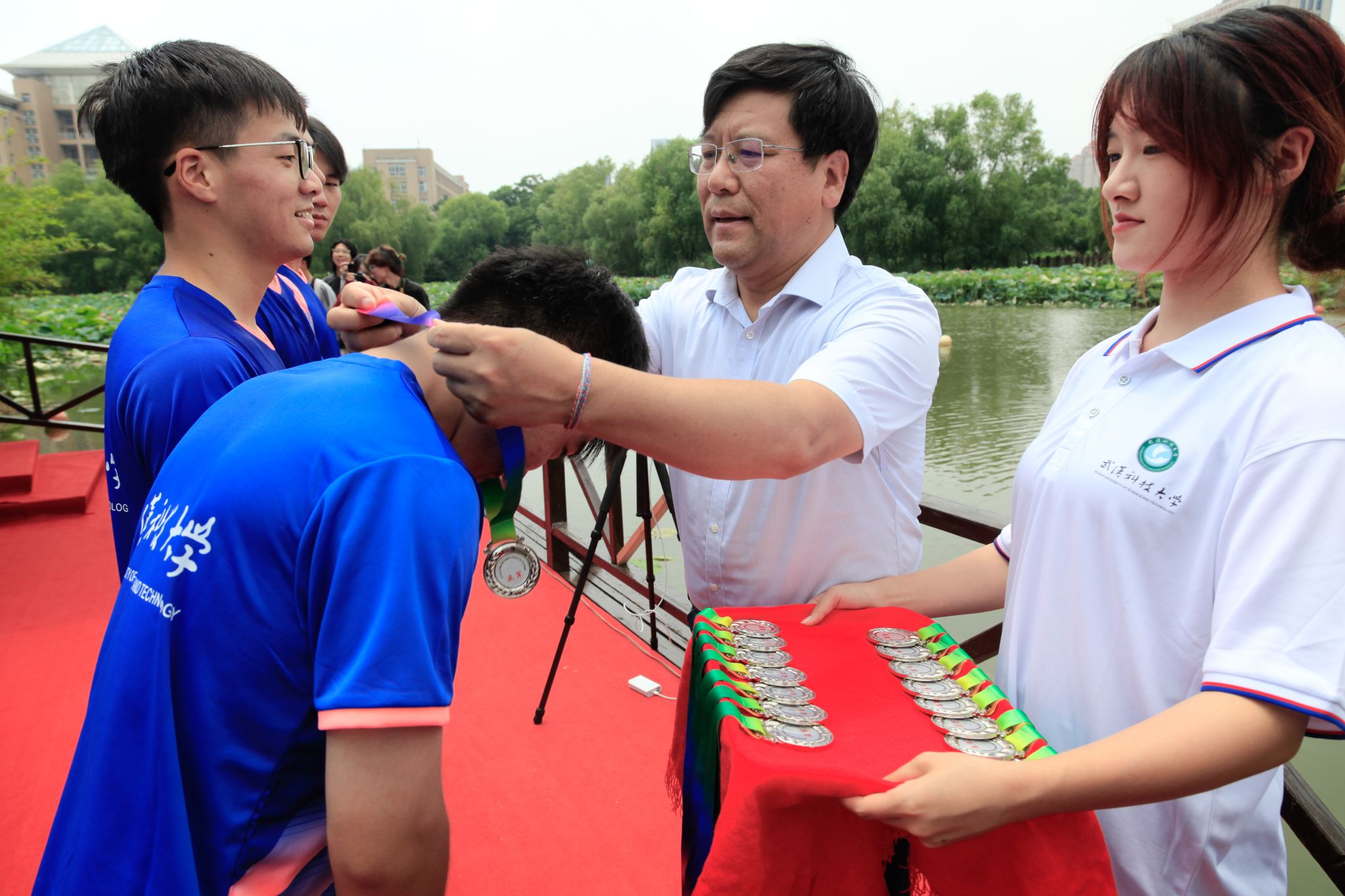 6月6日中午,鸭脖于沁湖畔举办第八届“沁湖连心·同舟共济”端午龙舟友谊赛,副校长沈季伟致辞,校团委副书记向方新宣读赛事竞赛规则、运动员代表宣誓,党委副书记孙国胜为龙舟点睛。由鸭脖龙舟协会成员组成的“沁水”队和由研究生组成的“钢魂”队角逐龙舟总决赛冠军,“沁水”队获胜。现场还设置了系列端午文化主题展演,不少留学生参与包粽子、做艾草,体验端午传统文化。