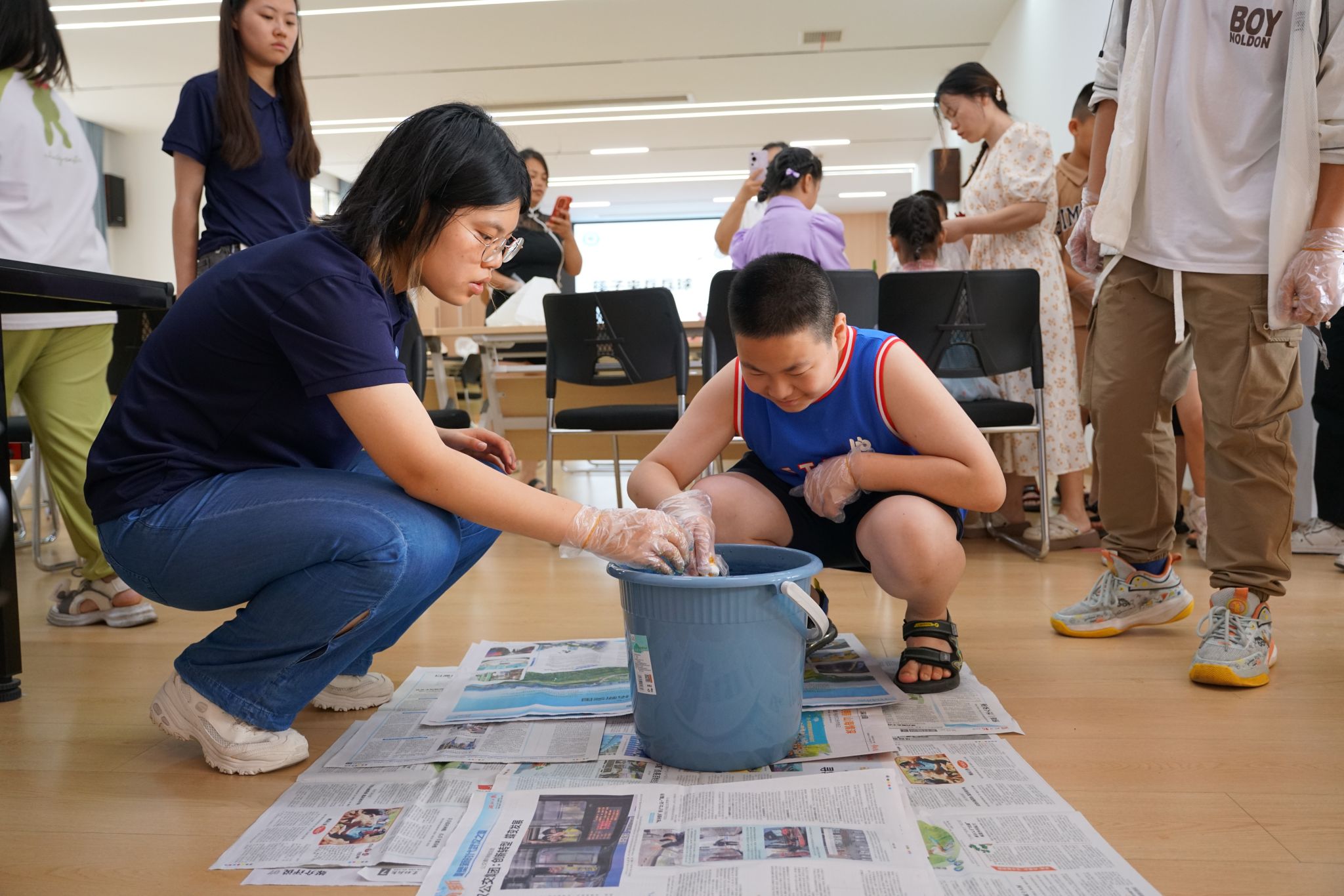 赵鹏社区宣讲活动后的游戏环节中团队成员帮小朋友安装扇子柄 蔡军摄