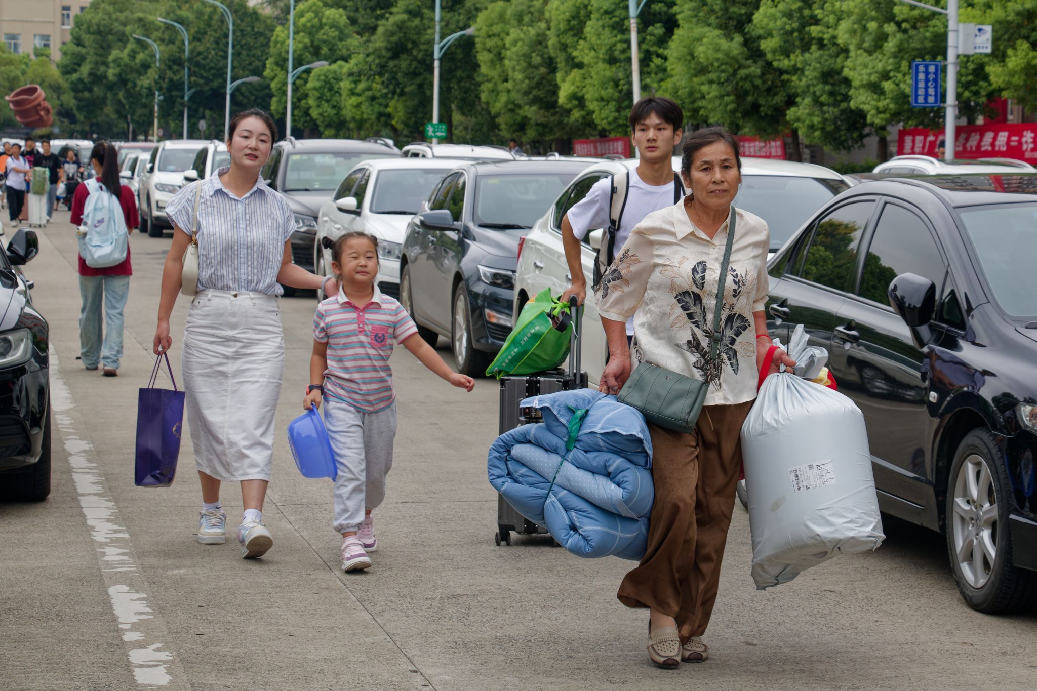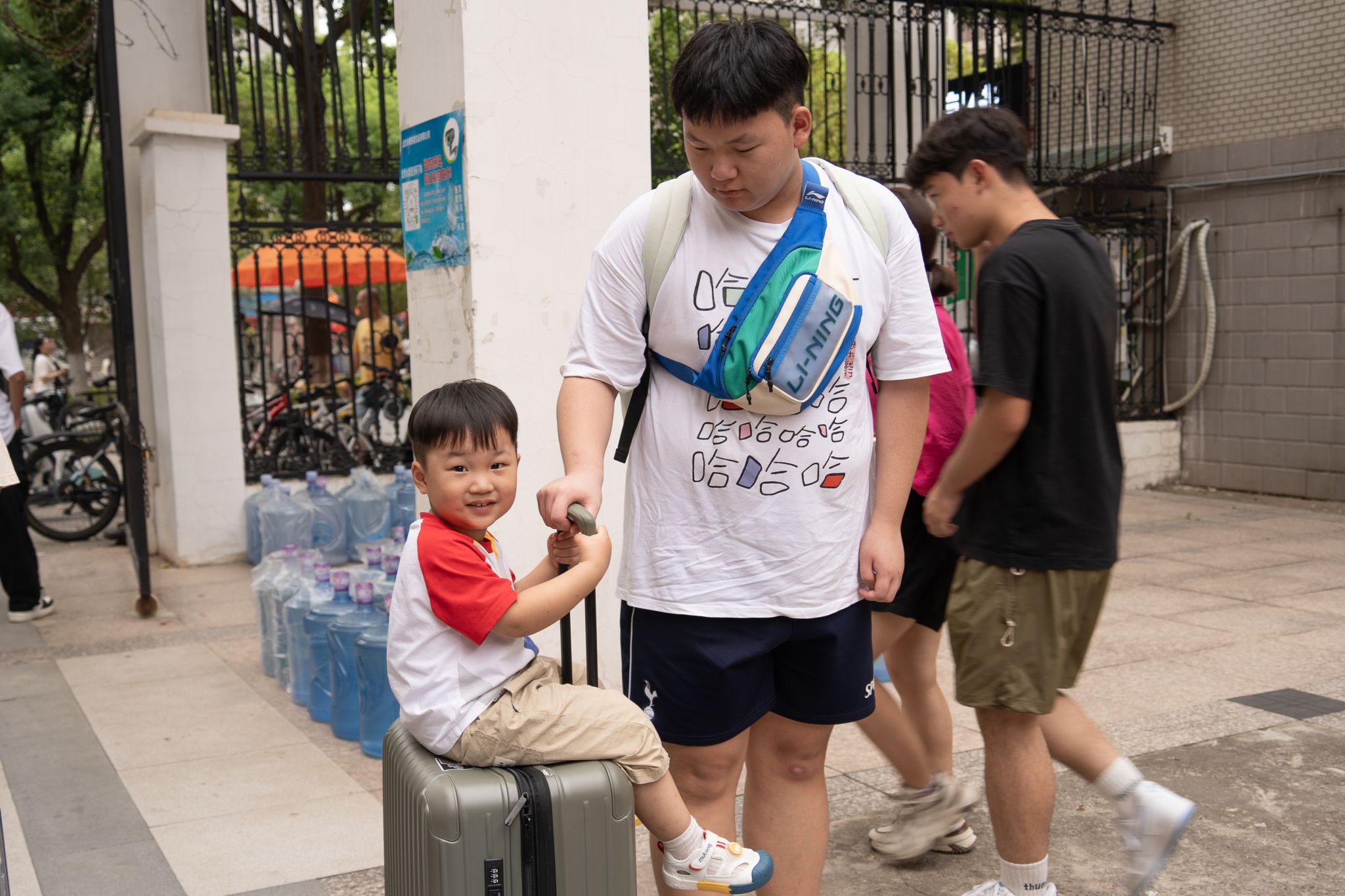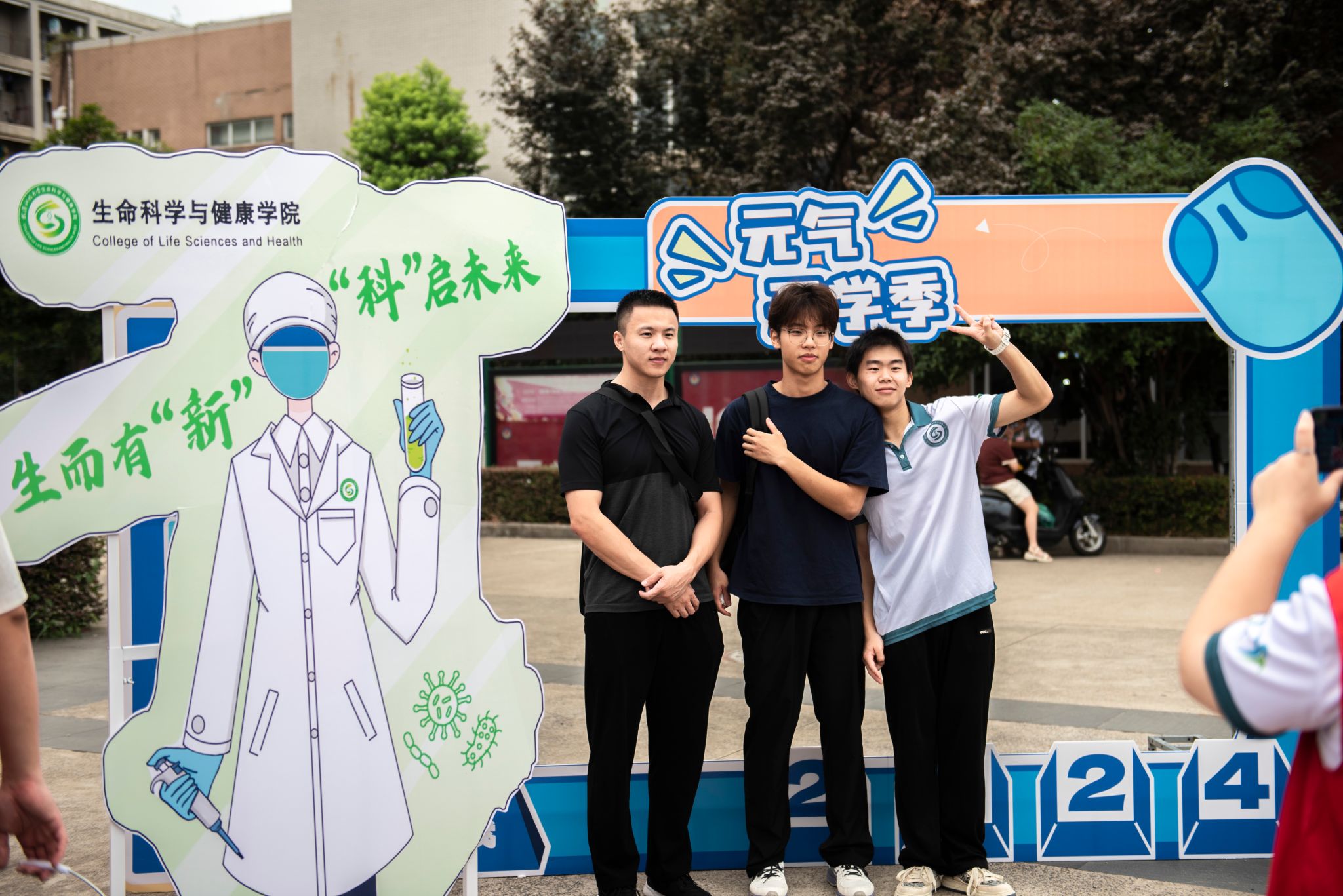 陪同新生报道的小朋友与吉祥物合影 孙奕哲摄