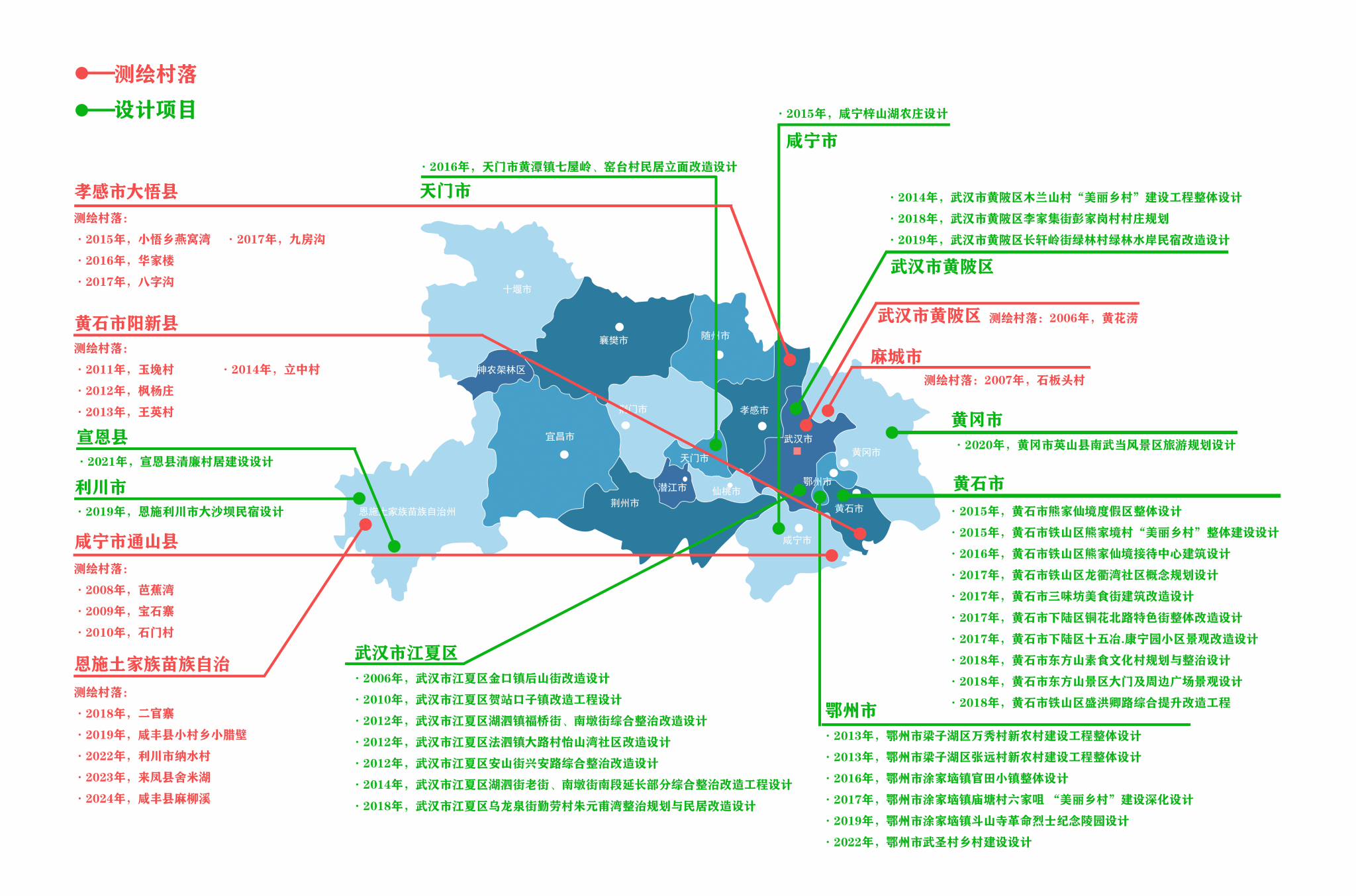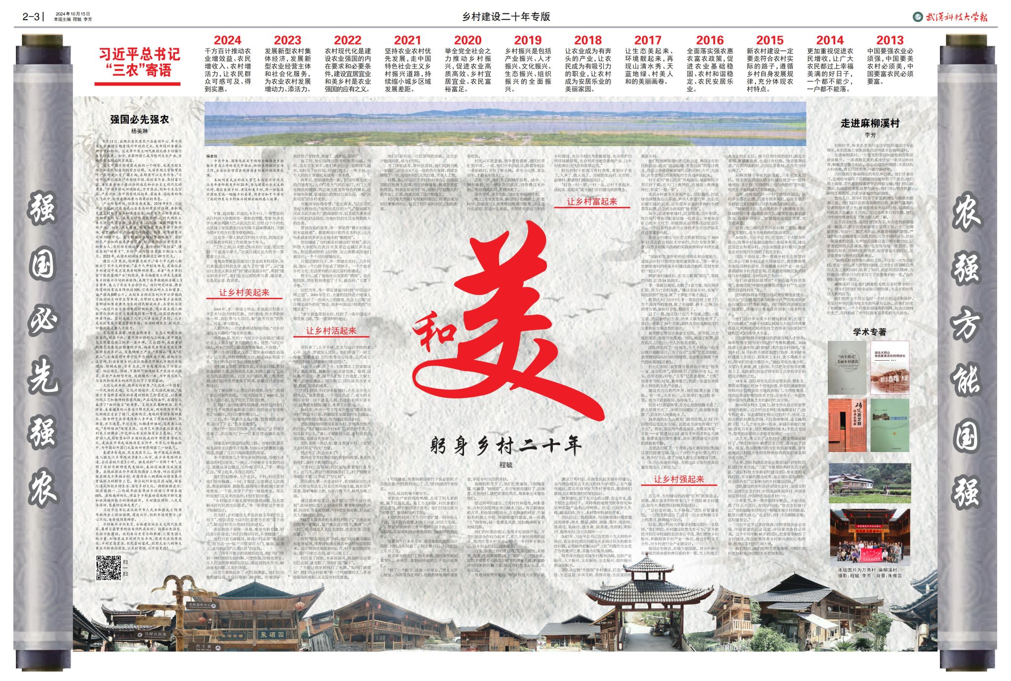 艺术与设计学院李一霏、翁文霞、许洪超等老师躬身乡村20年。他们足迹遍及湖北鄂东南、鄂西南、鄂东北的20多个传统村落,将一张张设计图纸变成一幅幅乡村美景。