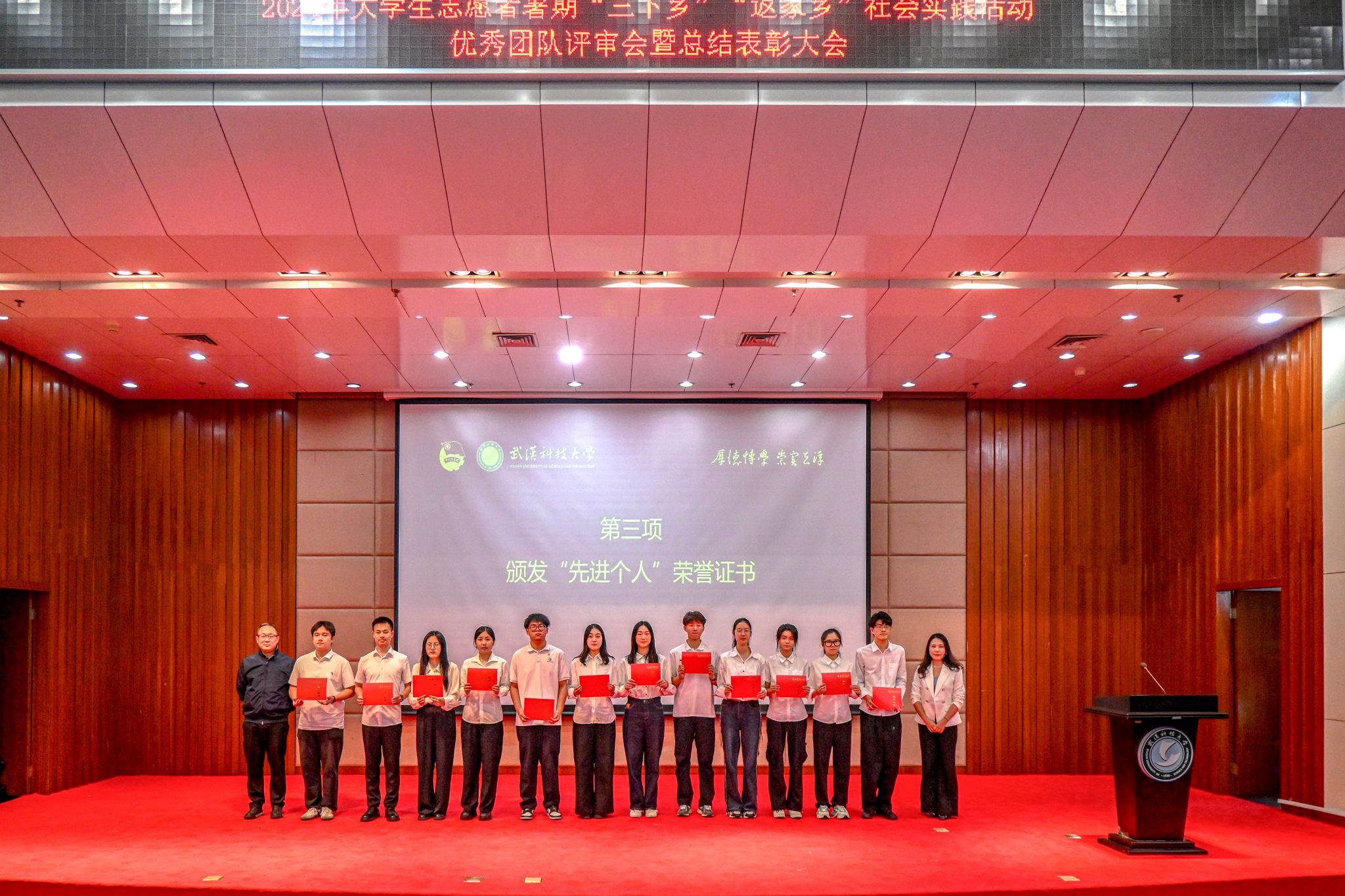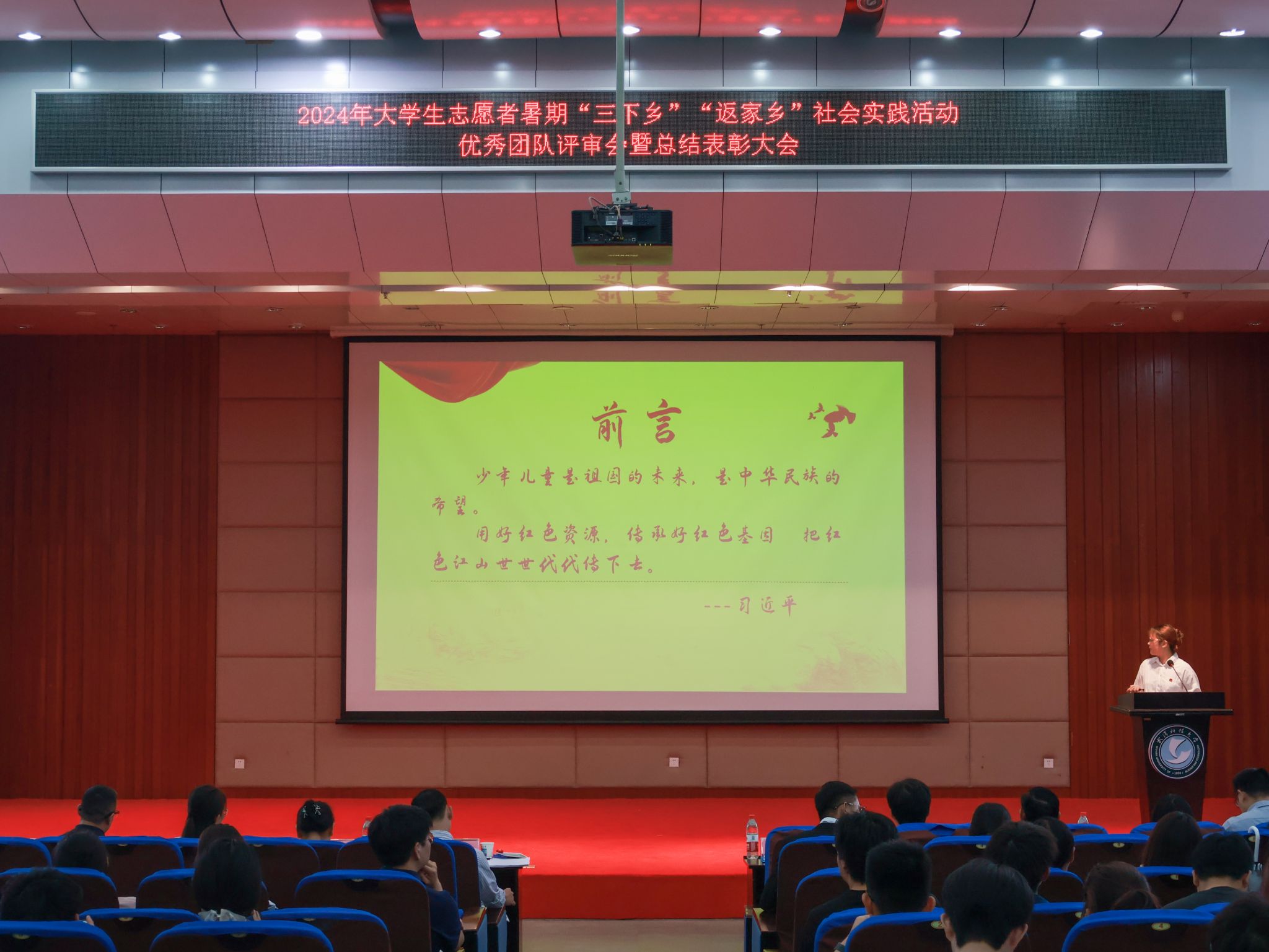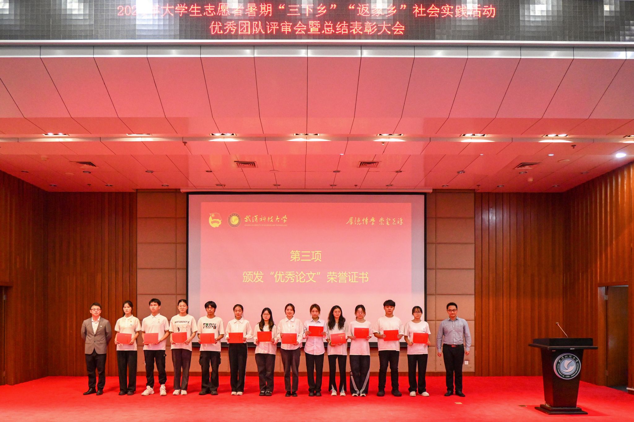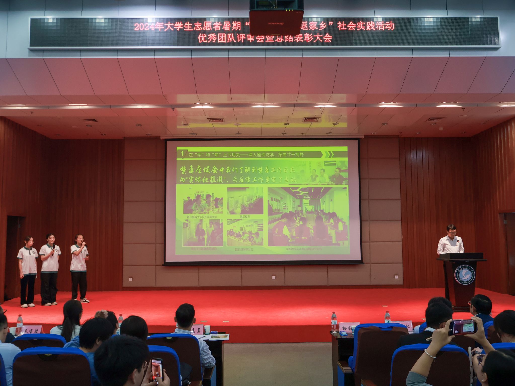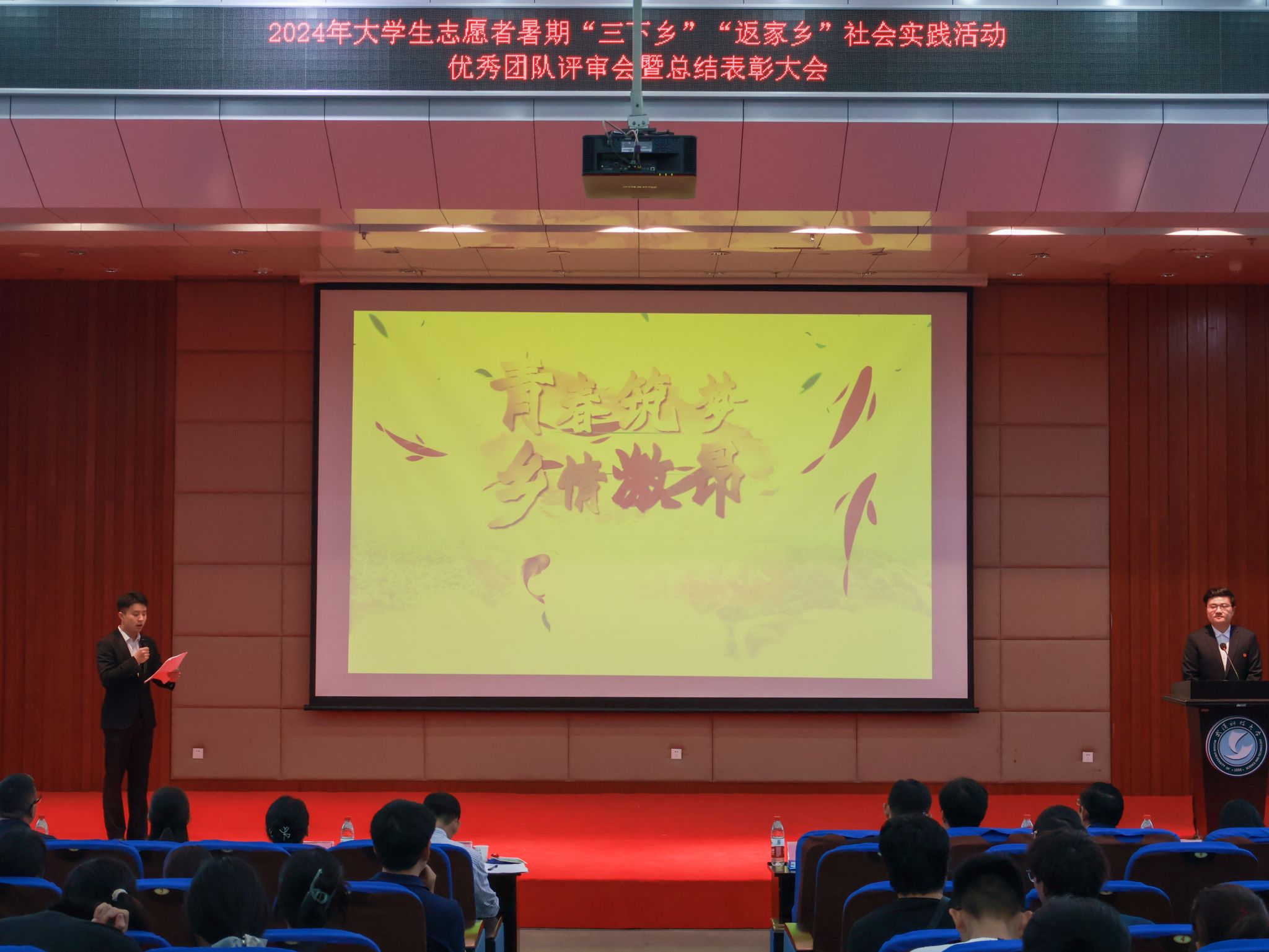 10月17日,鸭脖2024年大学生志愿者暑期“三下乡”“返家乡”社会实践活动优秀团队总结表彰大会在崇实会堂举行。校党委副书记孙国胜讲话,来自校“青马工程”、各学院的18支优秀团队上台答辩,从调研经历、项目内容、社会效应及活动意义等方面展示实践团队的风采现场。现场颁发优秀论文、先进个人、先进工作者、优秀团队、优秀组织单位荣誉证书,材料学部“钢魂铸梦”实践团队学生代表付熙哲作为团队代表发言。