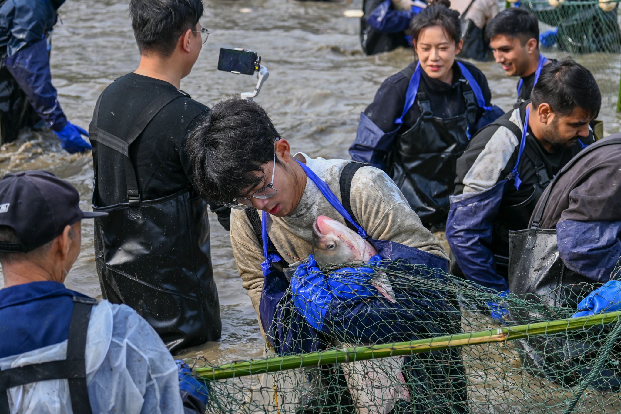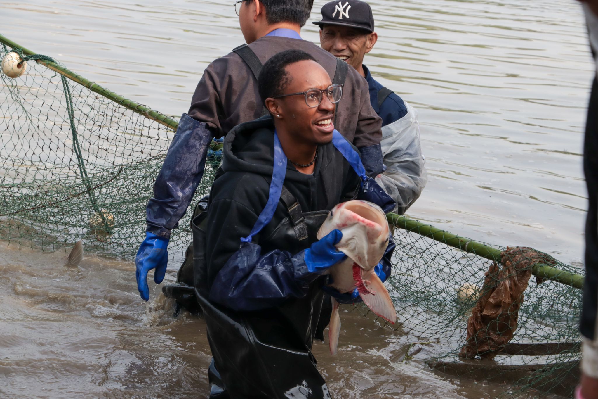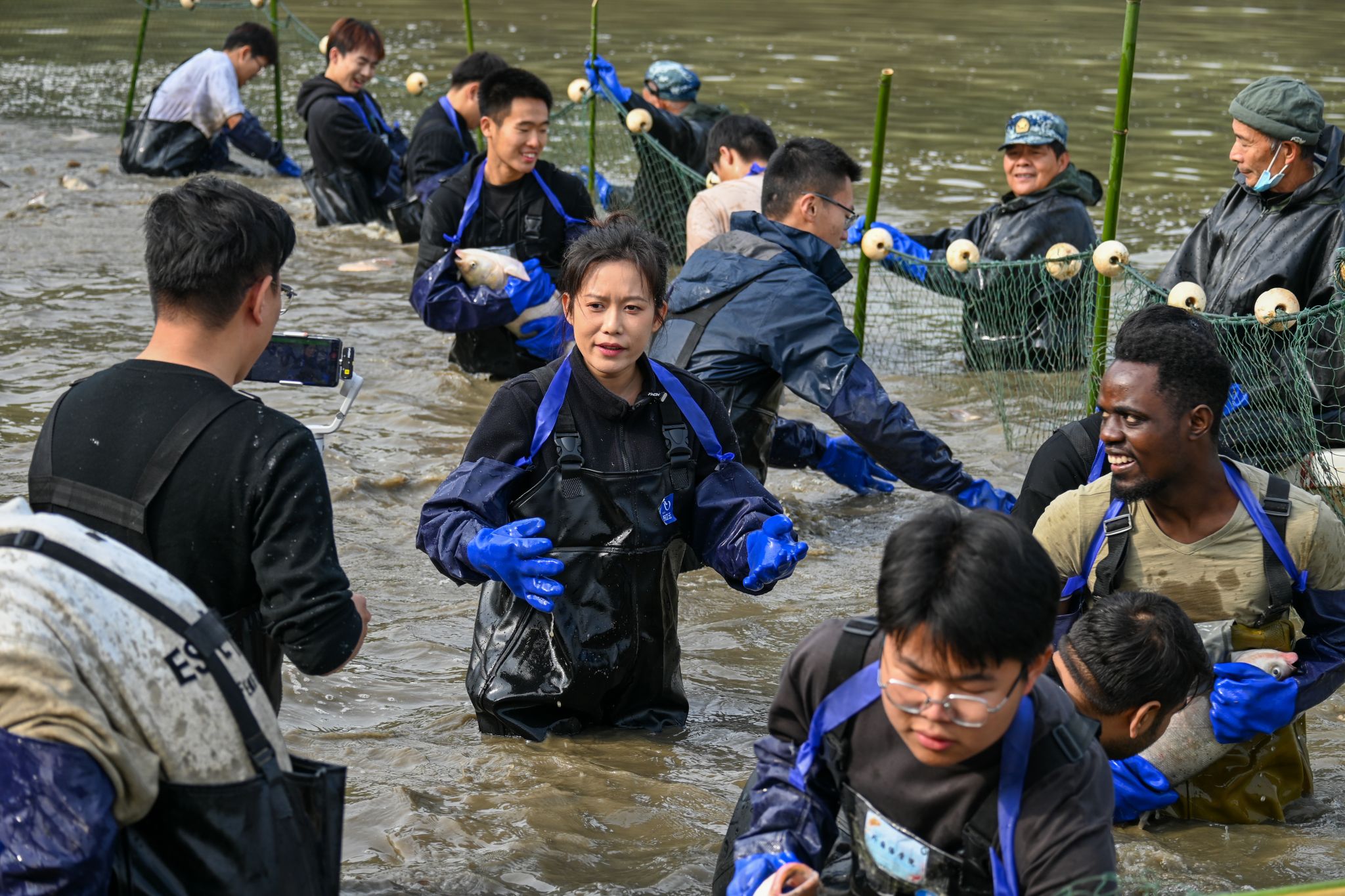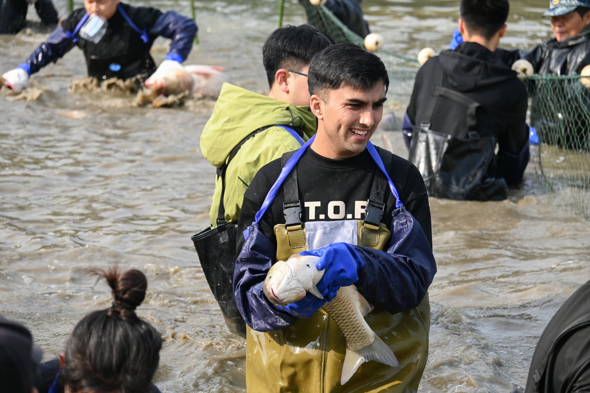 留学生拉网特写 王铭浩摄
