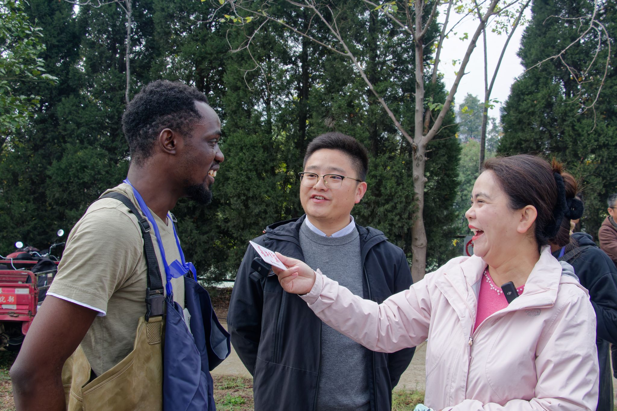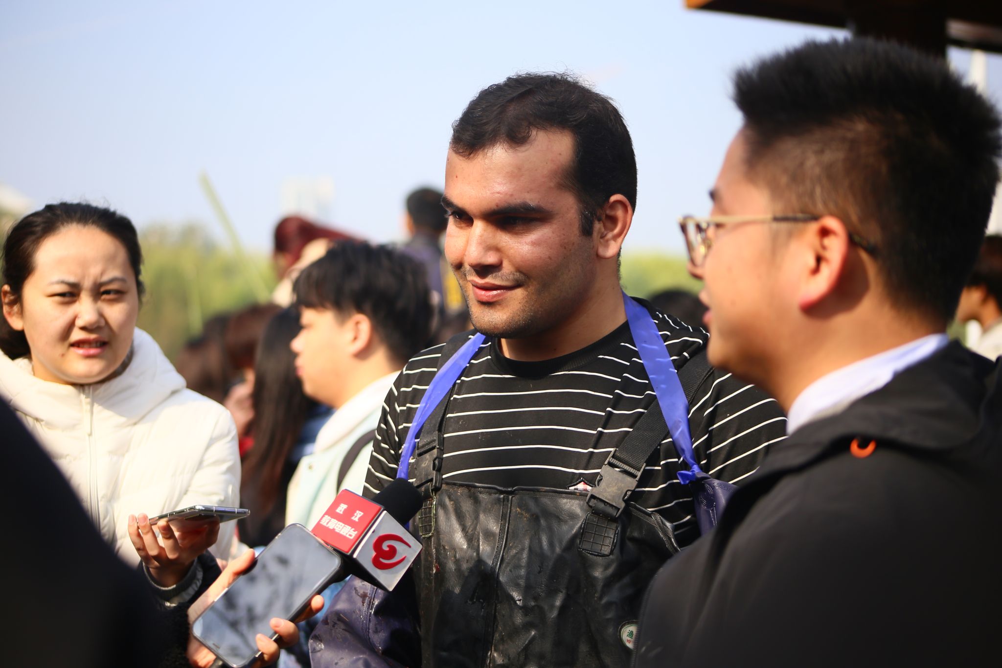 观众和留学生捕鱼选手合影 黄宏杰摄