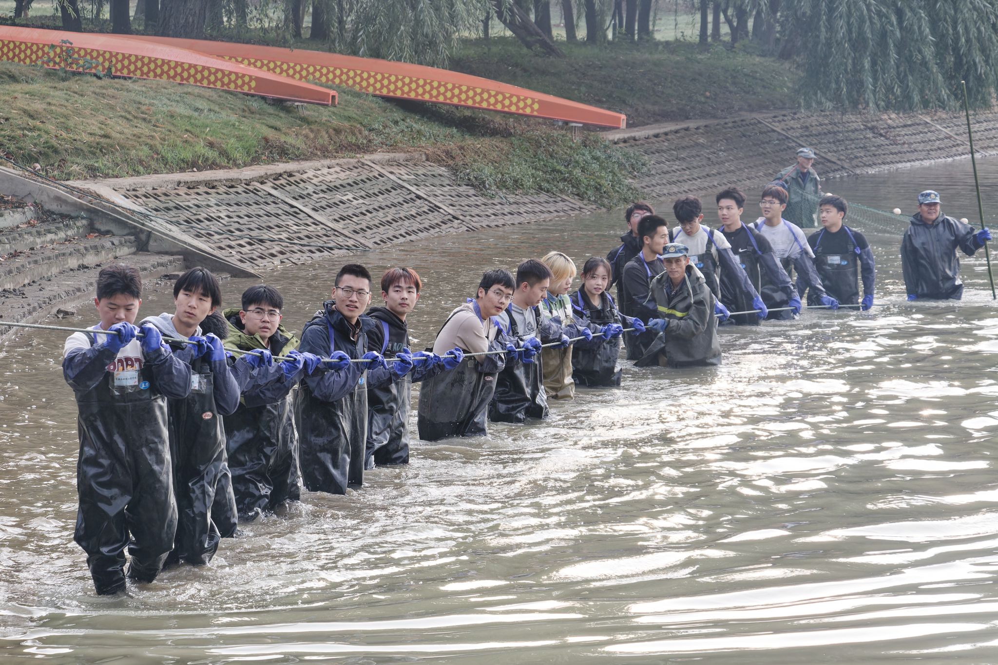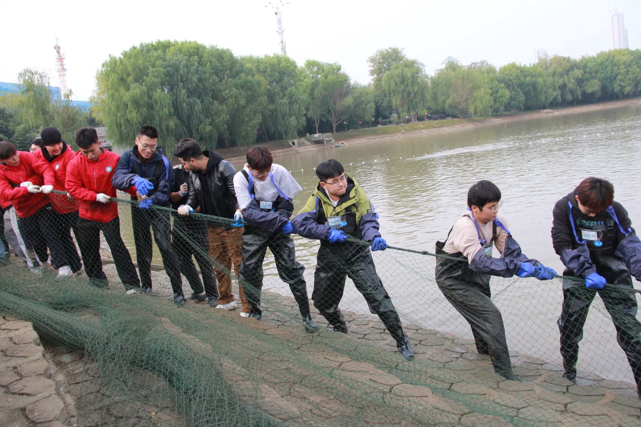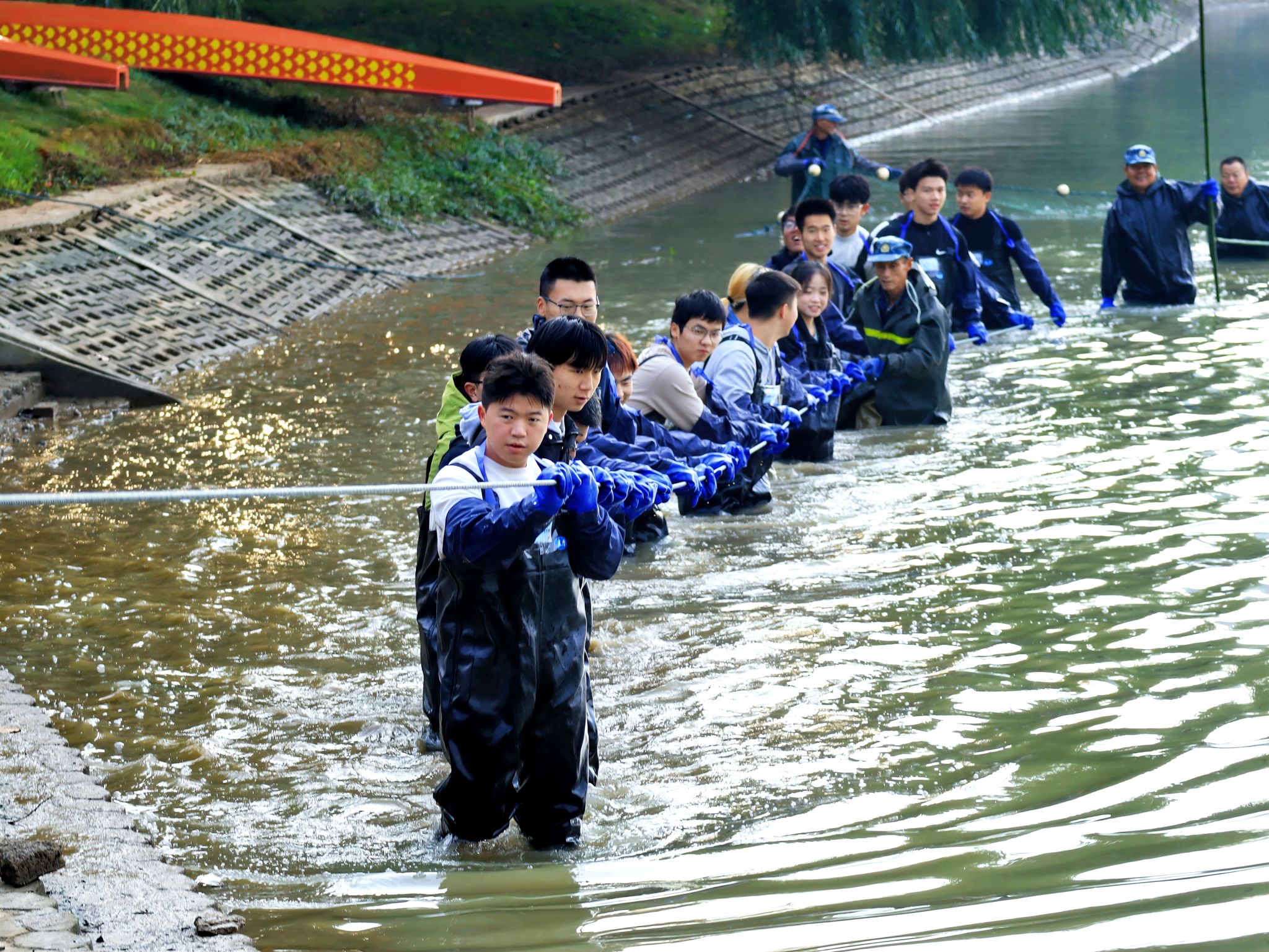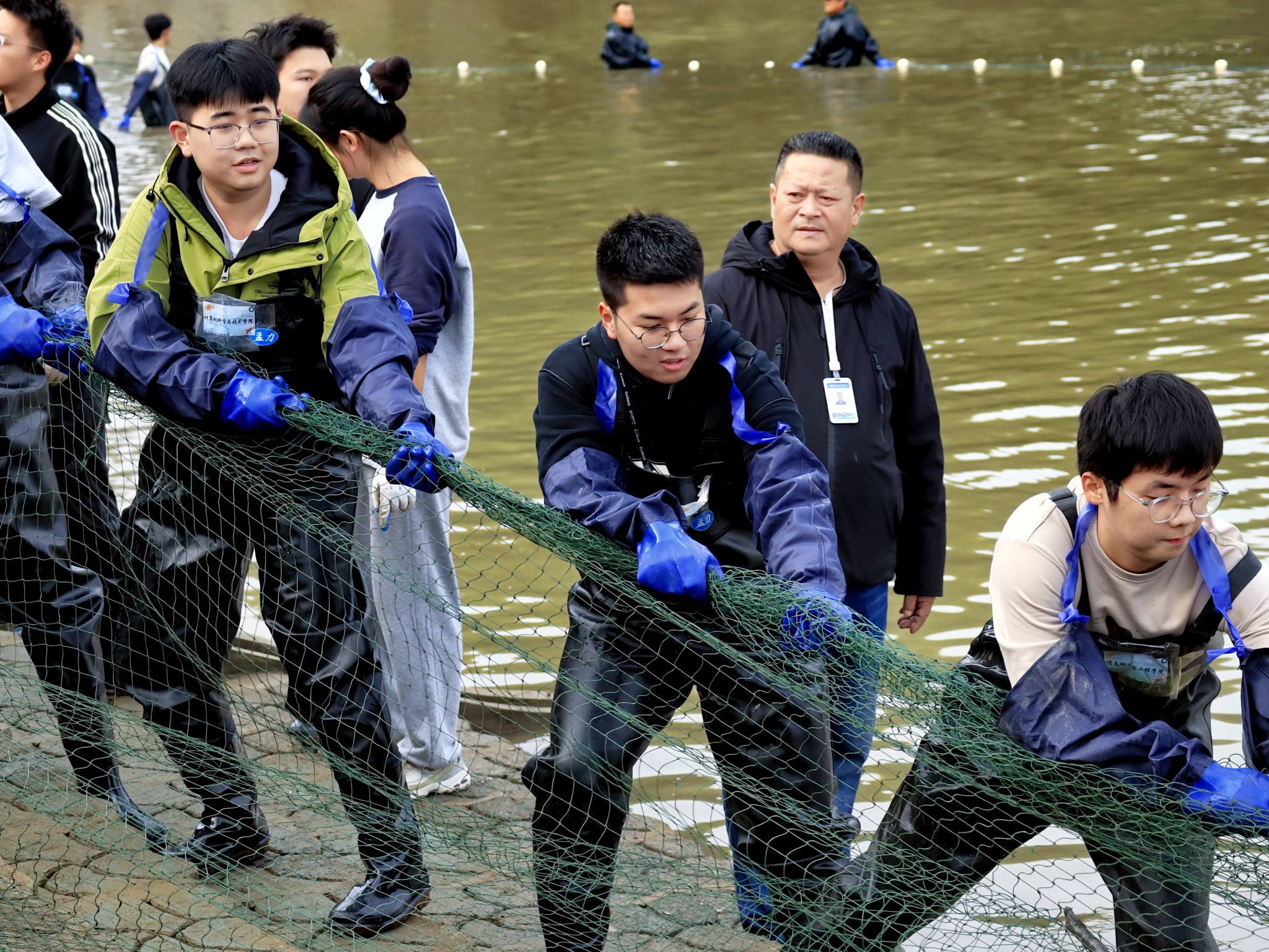 同学们喊号子捞鱼 吴毅萌摄