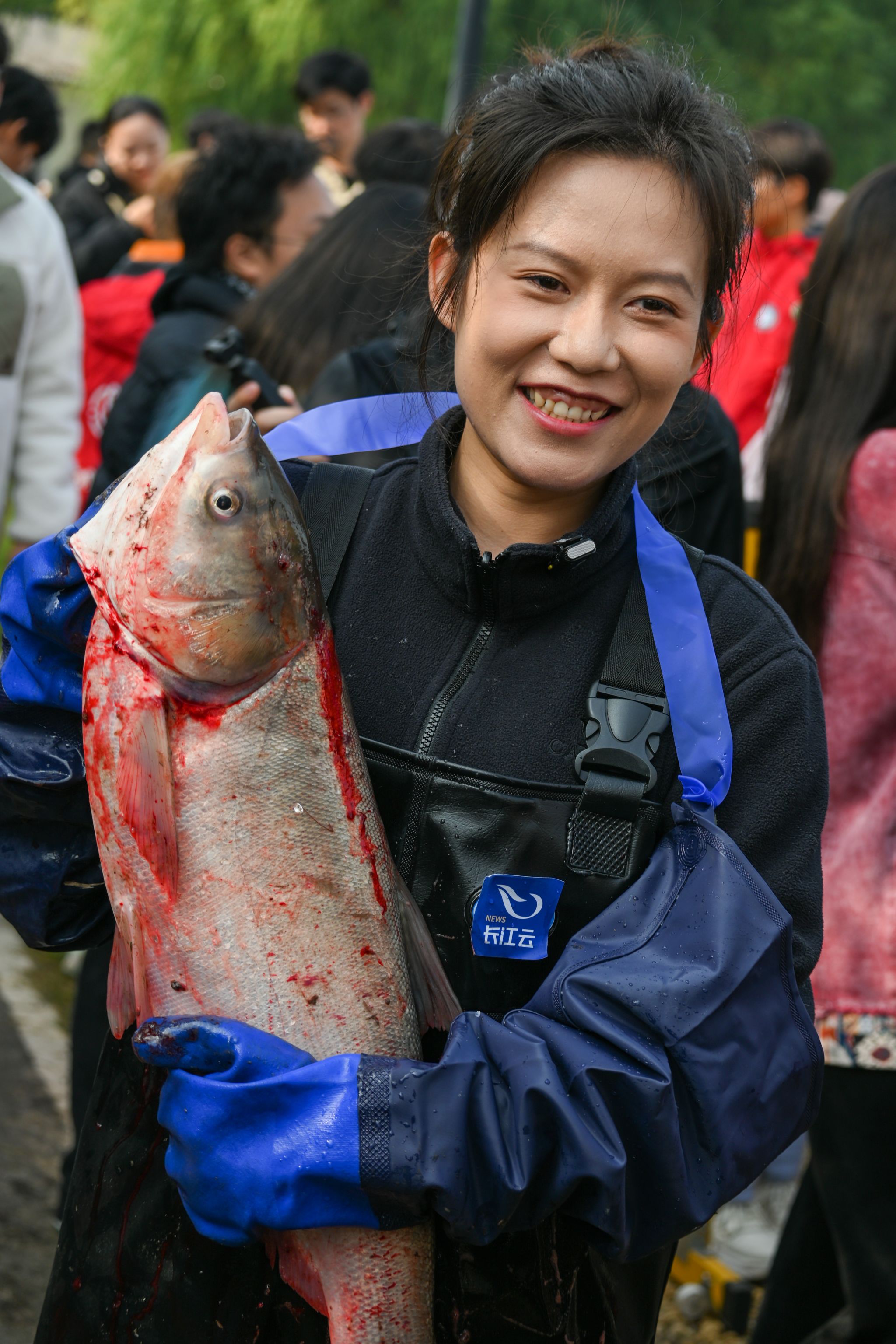女捕鱼选手和鱼合照 黄宏杰摄