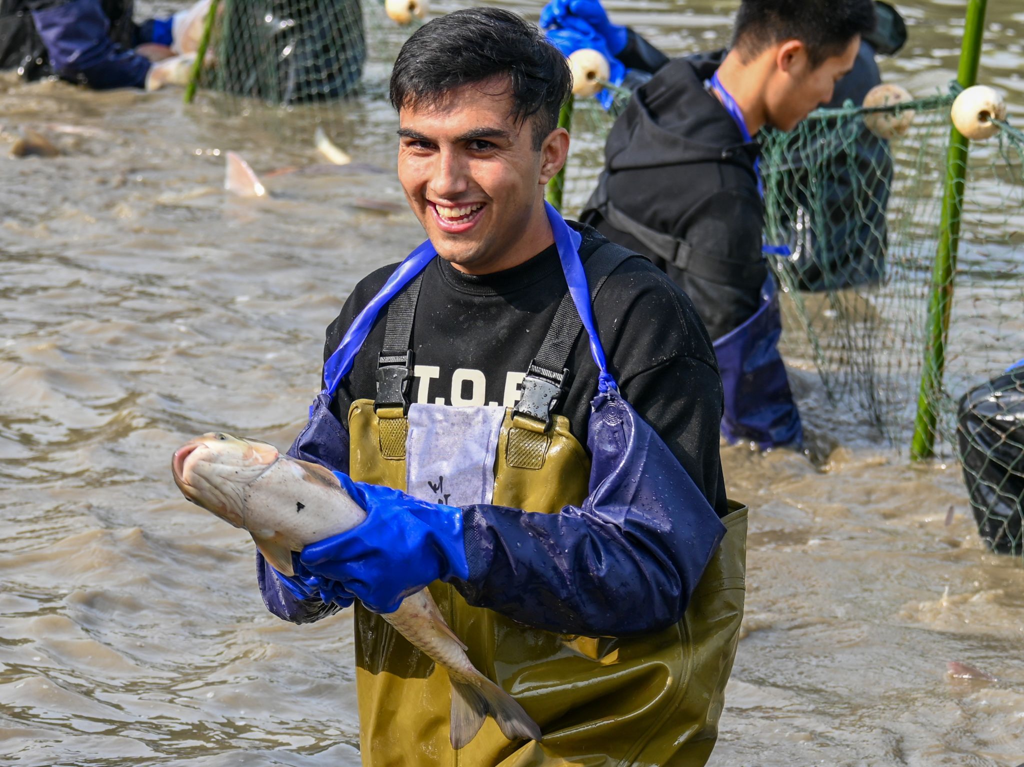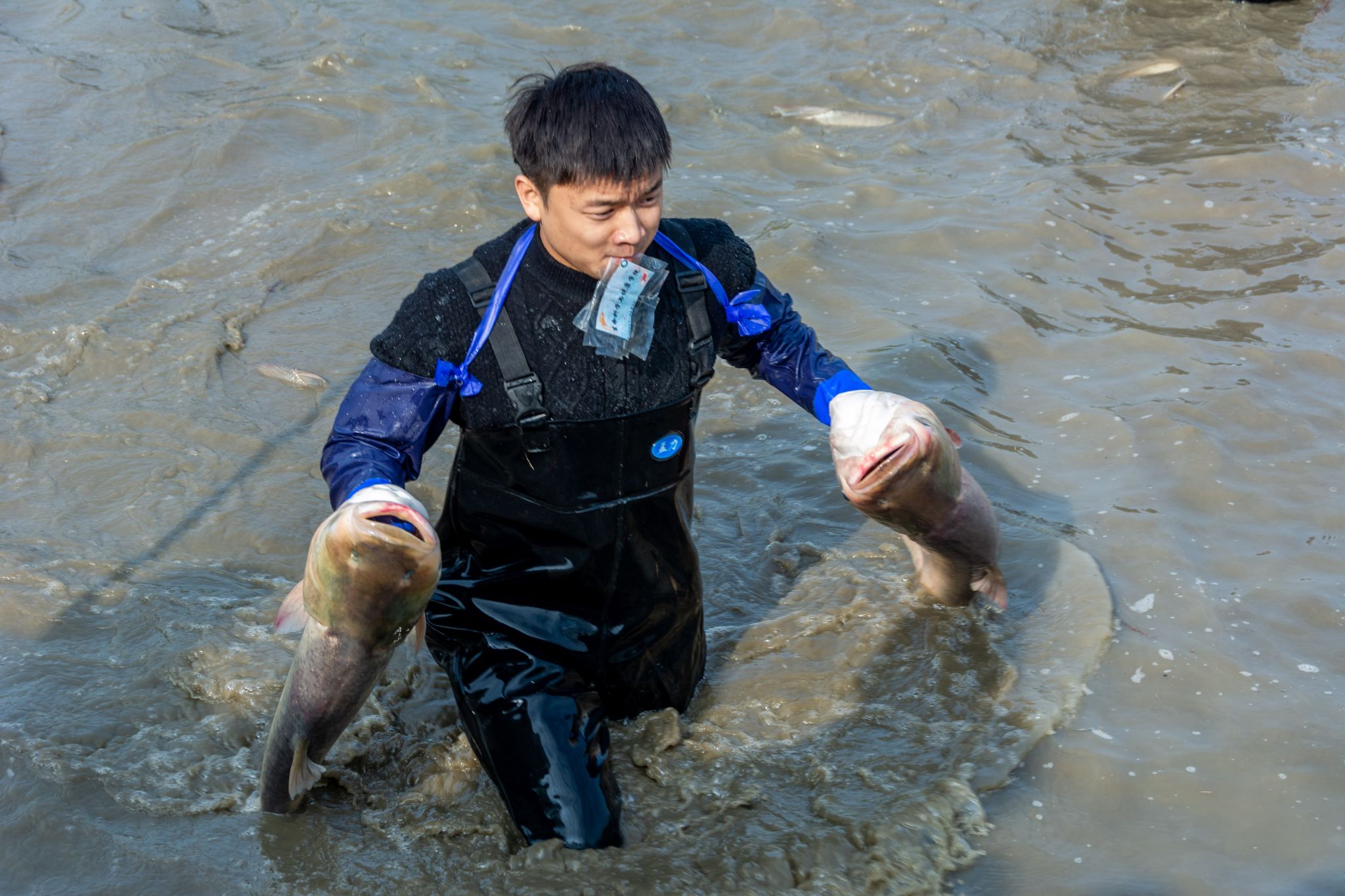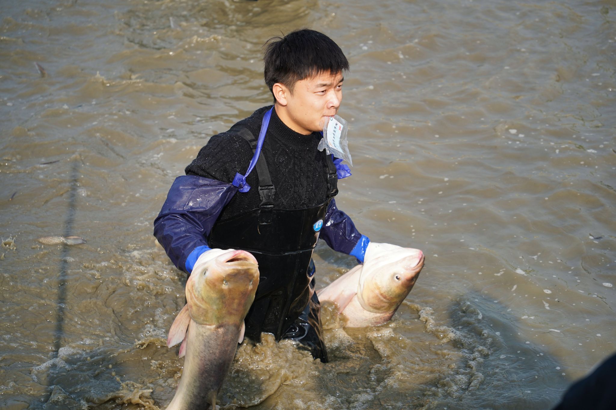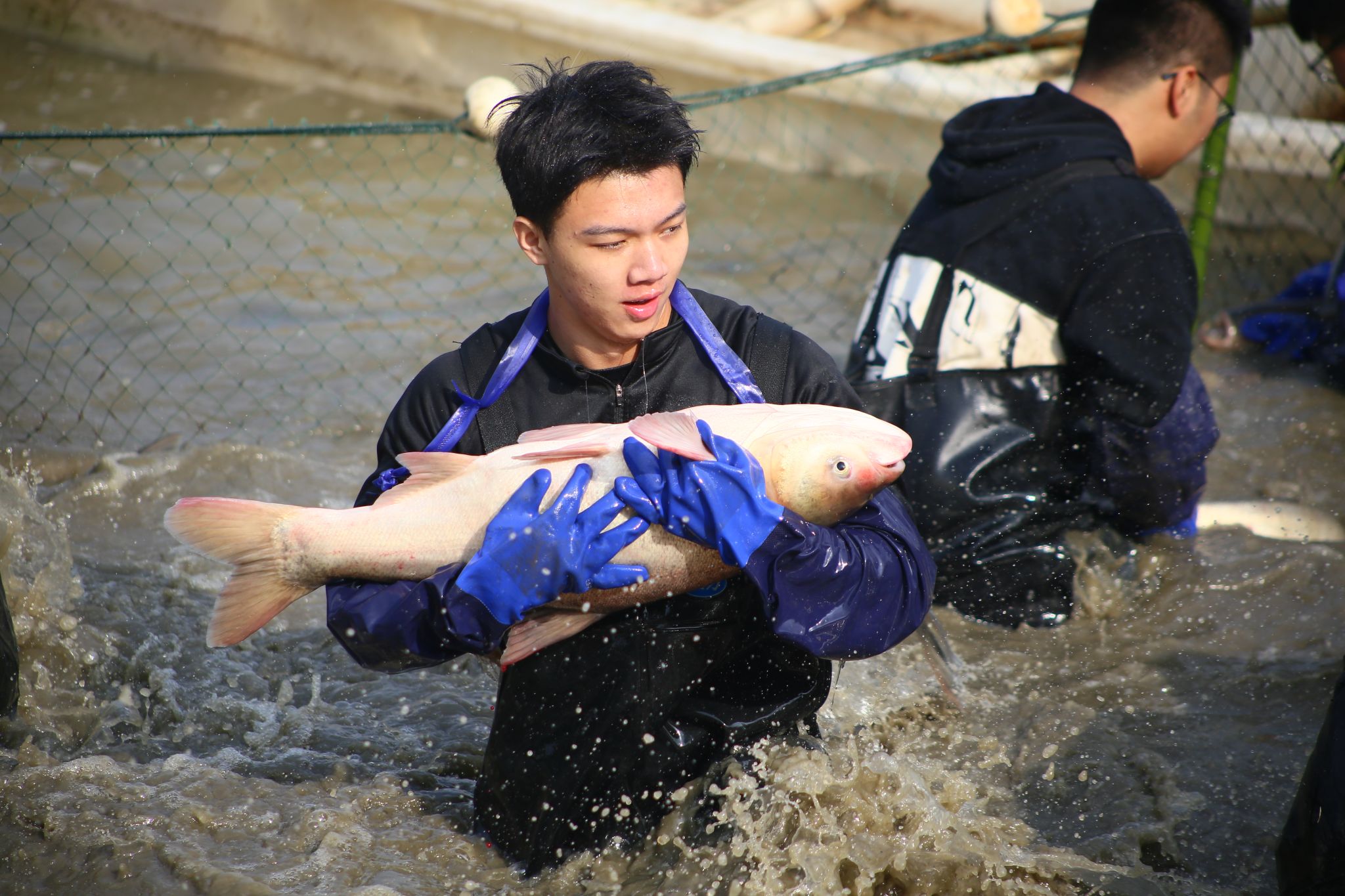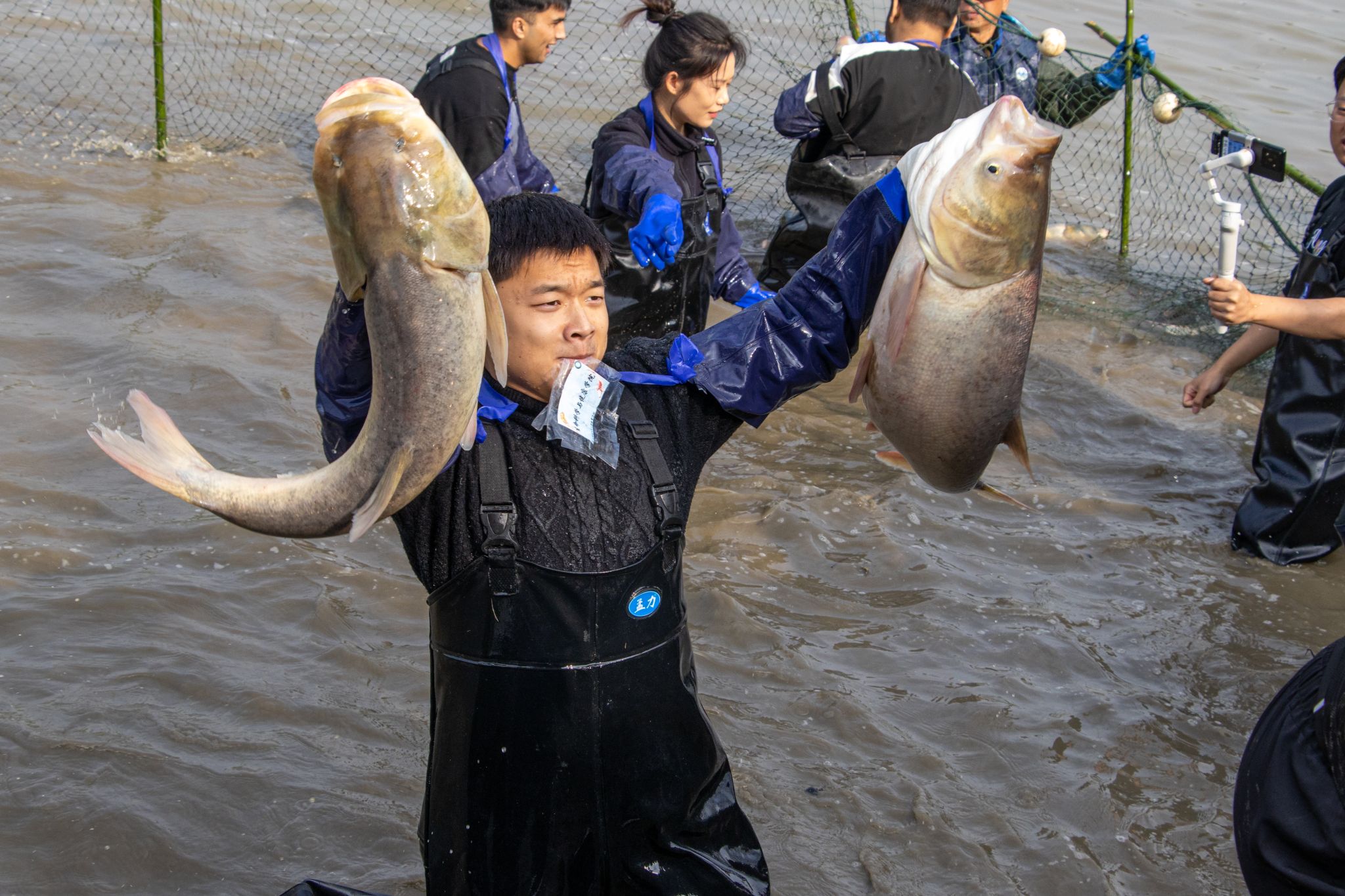 后勤工作人员展示鱼 姜永鸿摄
