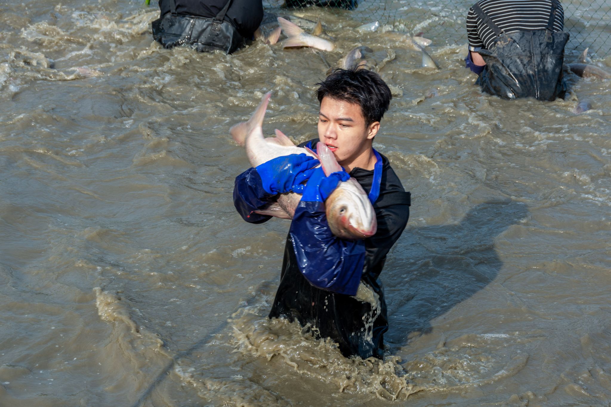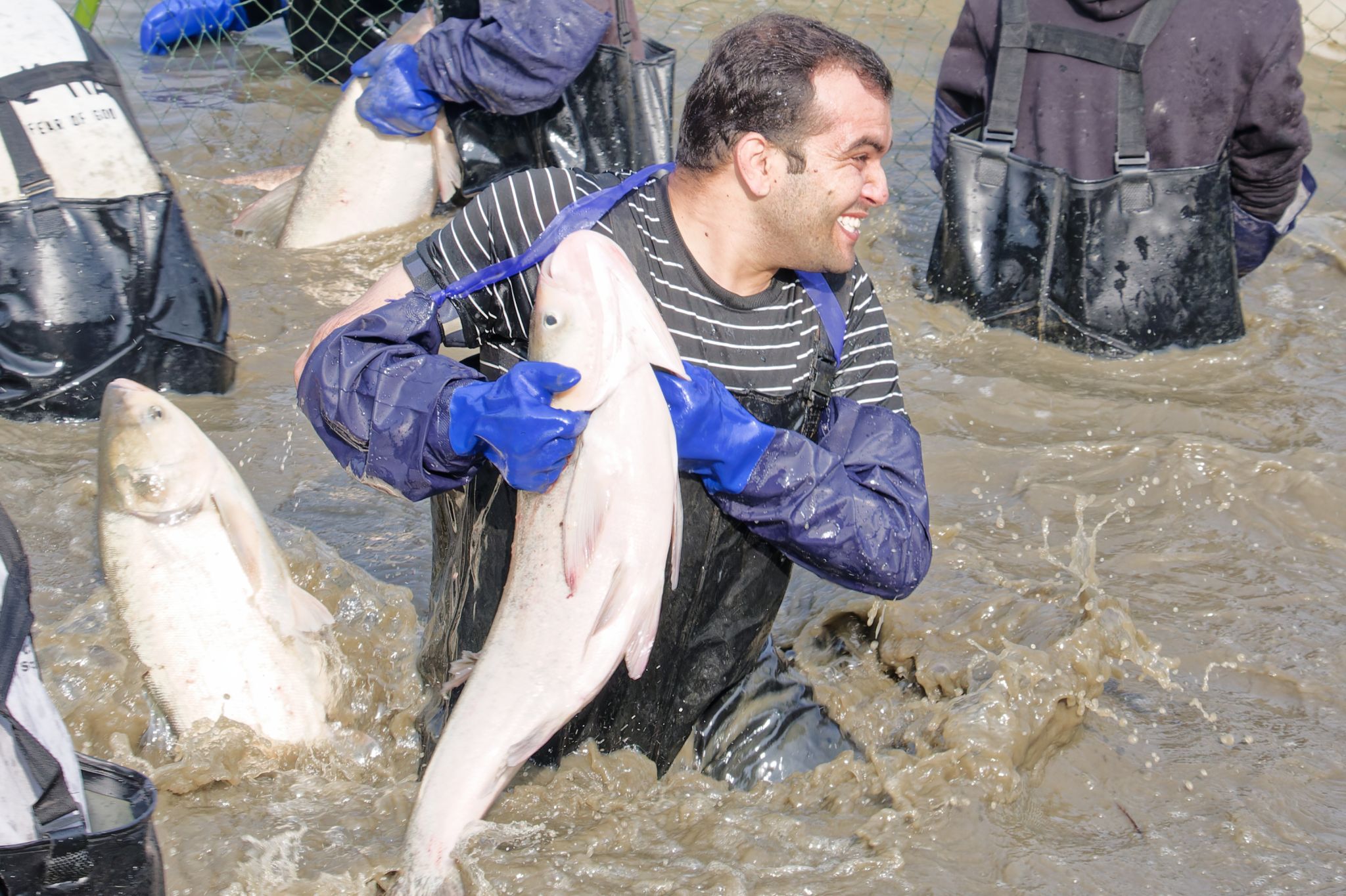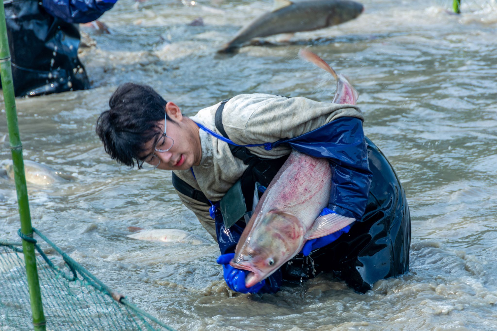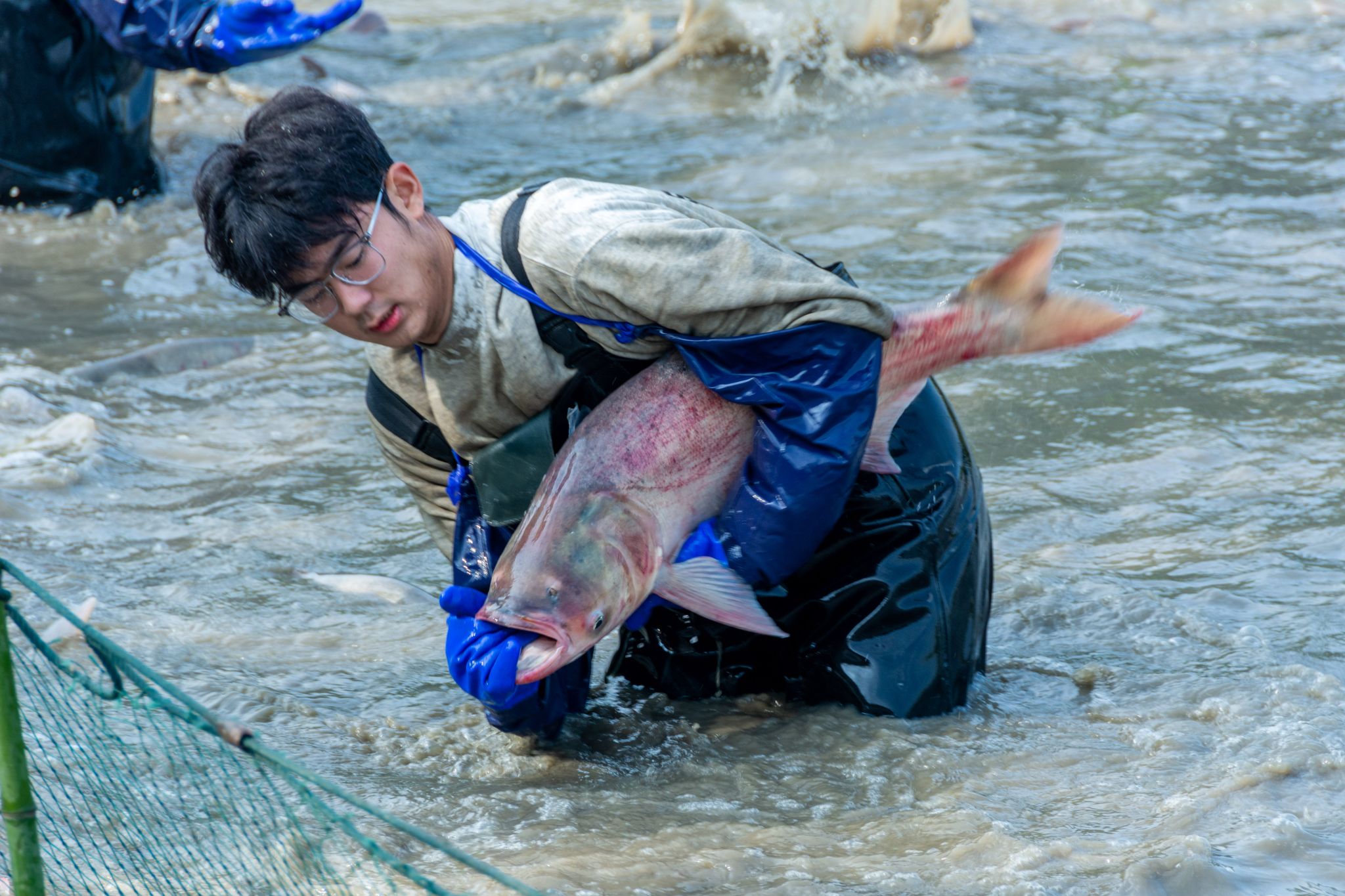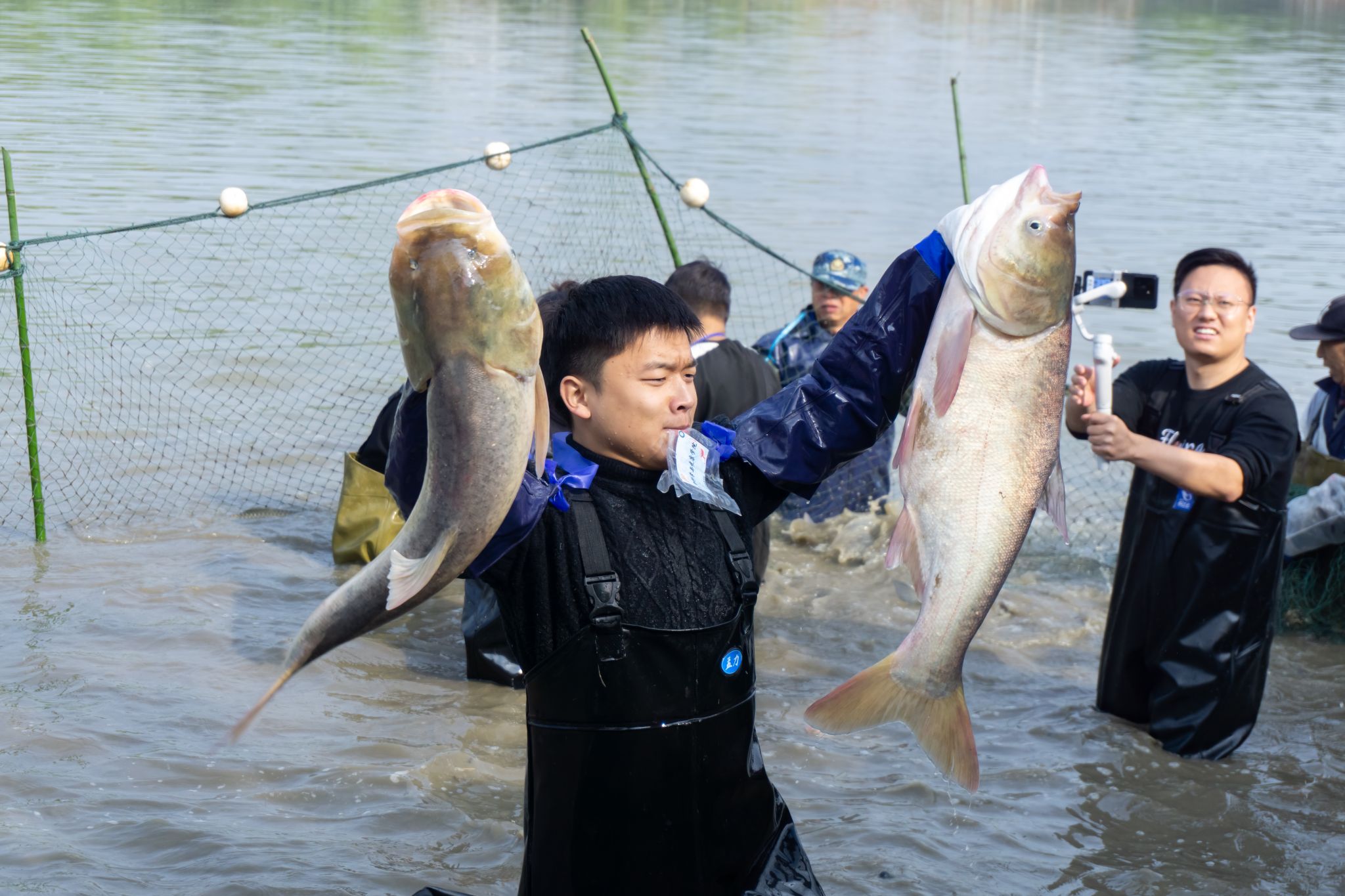 后勤工作人员展示鱼 姜永鸿摄