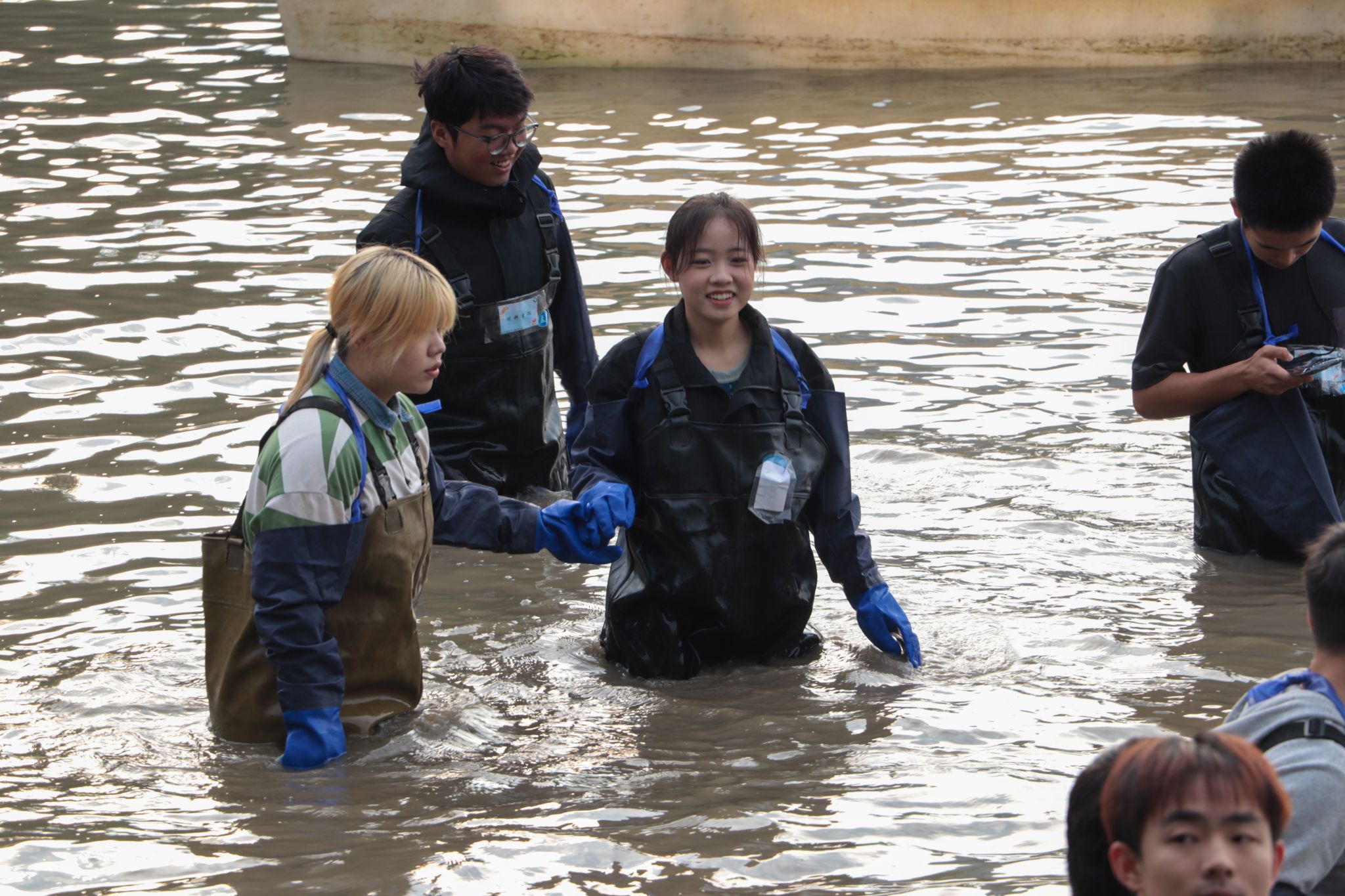 留学生下水捞鱼 吴毅萌摄