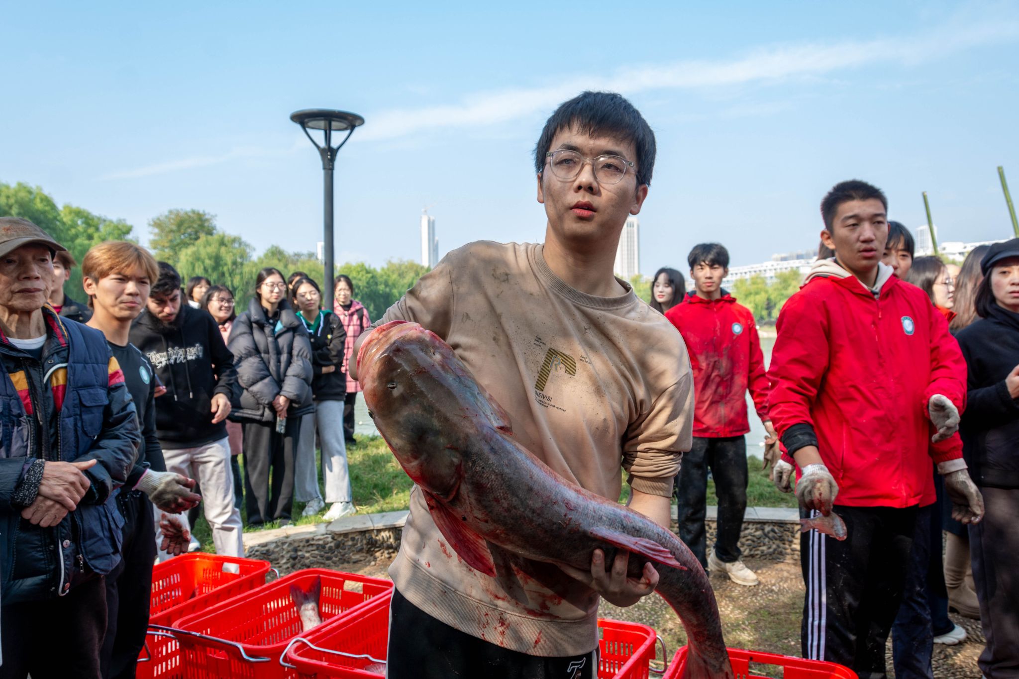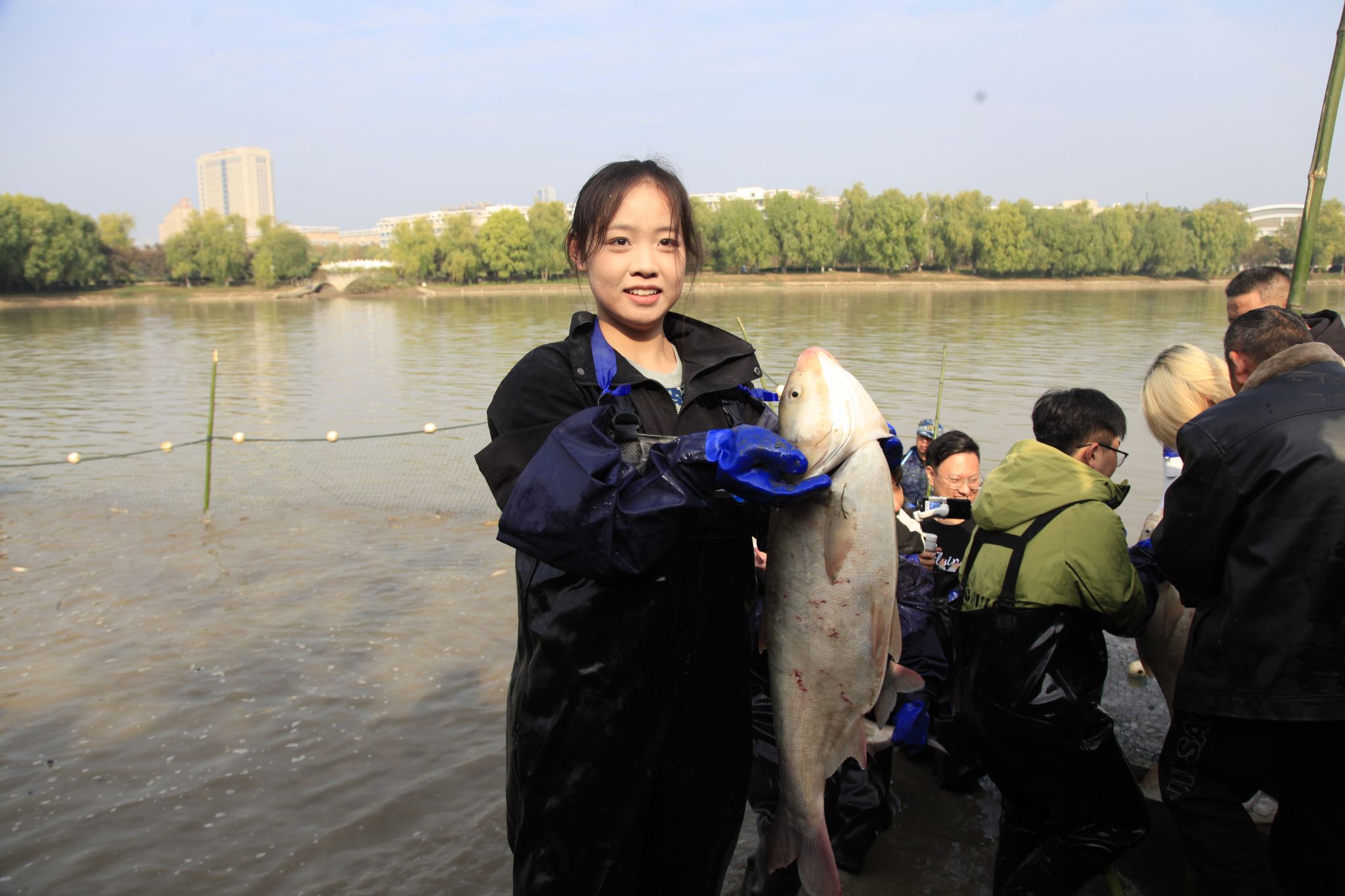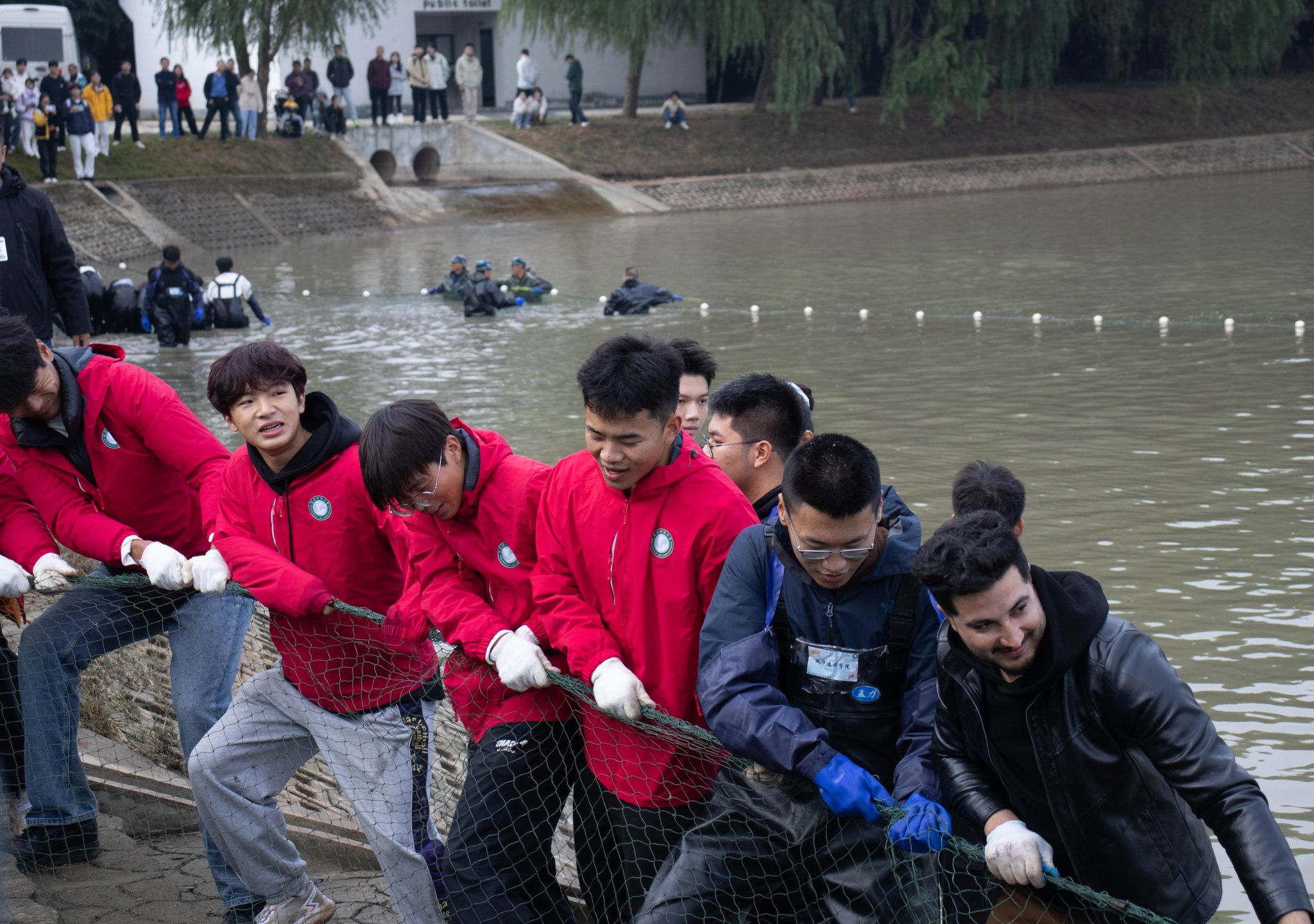 11月21日上午8时,学校近百名中外师生和后勤集团员工身着统一的红色服装,在沁湖边拉开了捕鱼活动的序幕。经过半个多小时的激烈争夺,信息学院徐润收获了一条20.5斤重的大鱼,获得了今年的“捕鱼王”称号。