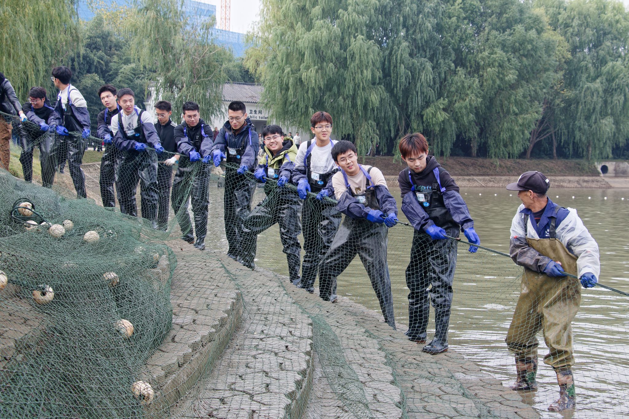 学生共同拉网 杨欣怡摄