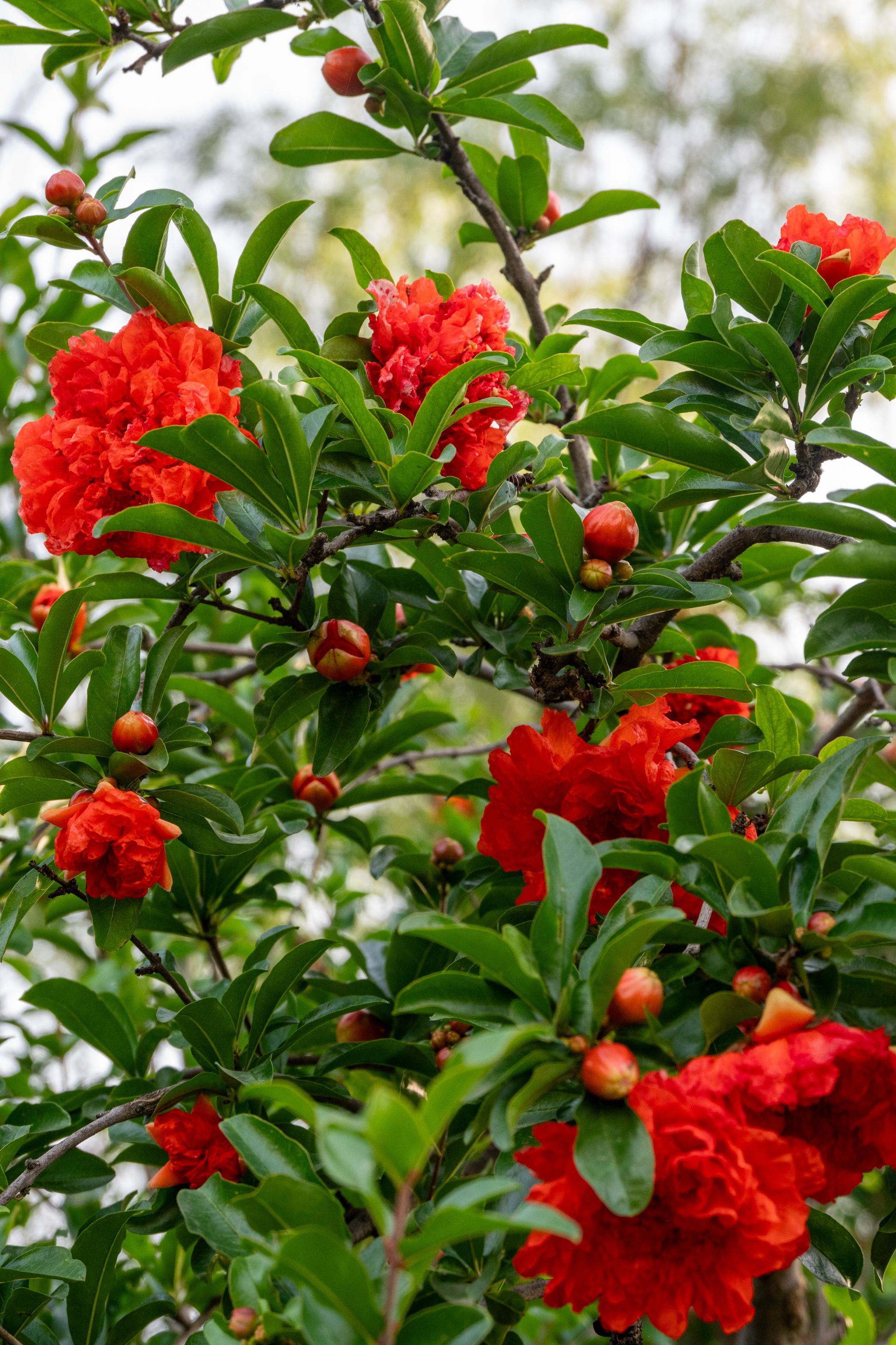 石榴花为石榴科石榴属落叶灌木或小乔木,别名安石榴、丹若。叶片对生或簇生,矩圆形,花朵单生或数朵顶生,花瓣肉质,有鲜红、粉红等色,花萼钟形,艳丽夺目。它喜温暖向阳,适合在阳台、庭院种植。石榴花的花语是“成熟的美丽”与“多子多福”,因其果实饱满、籽粒众多,象征着家族兴旺。除观赏外,石榴花可泡茶,果实富含维生素 C,具有较高的食用价值。花期在5-6月,鸭脖百花园、沁心岛周边、国际学院附近可见。