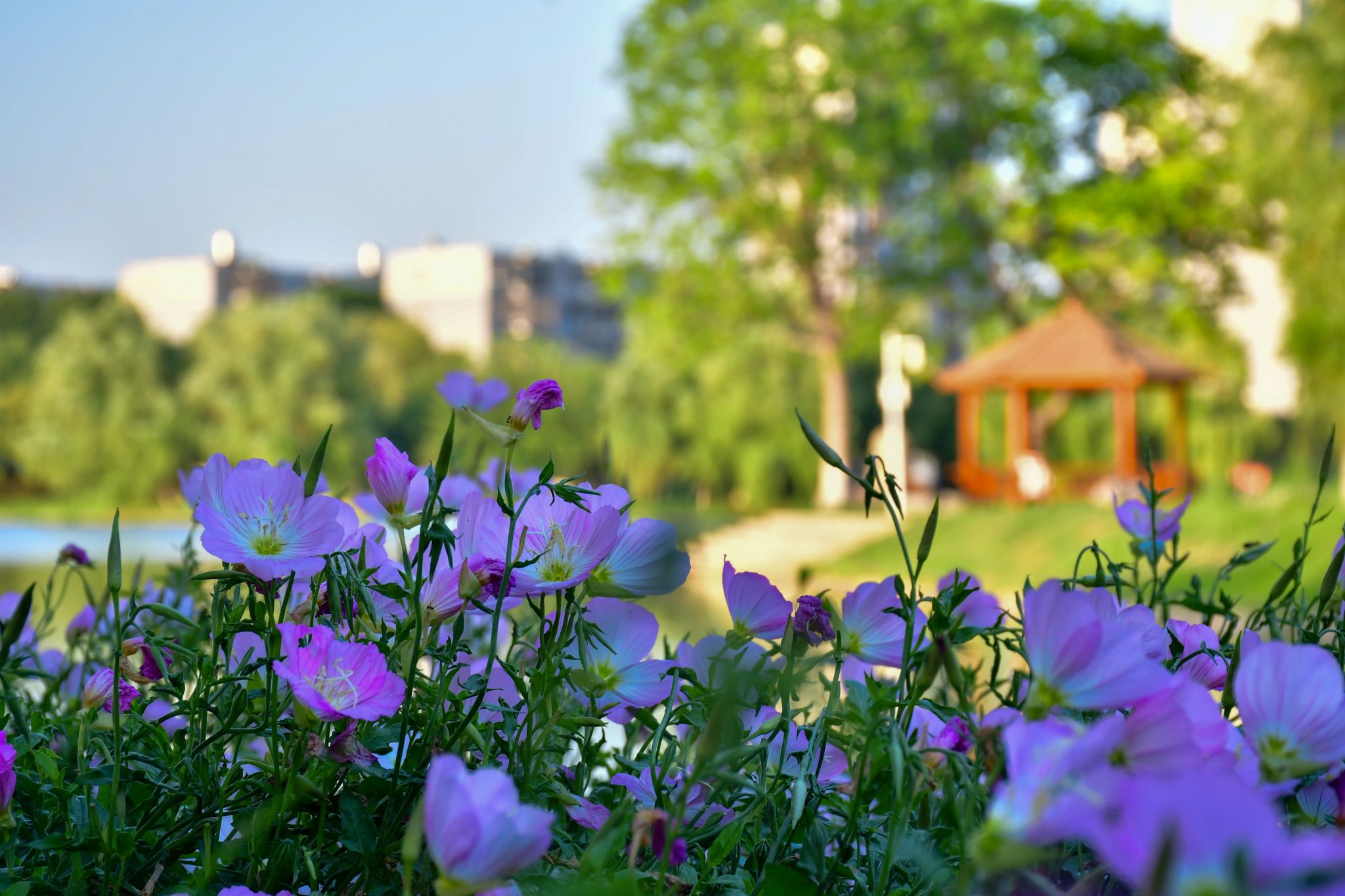 沁湖边的美丽月见草与小亭子 陈楷林摄