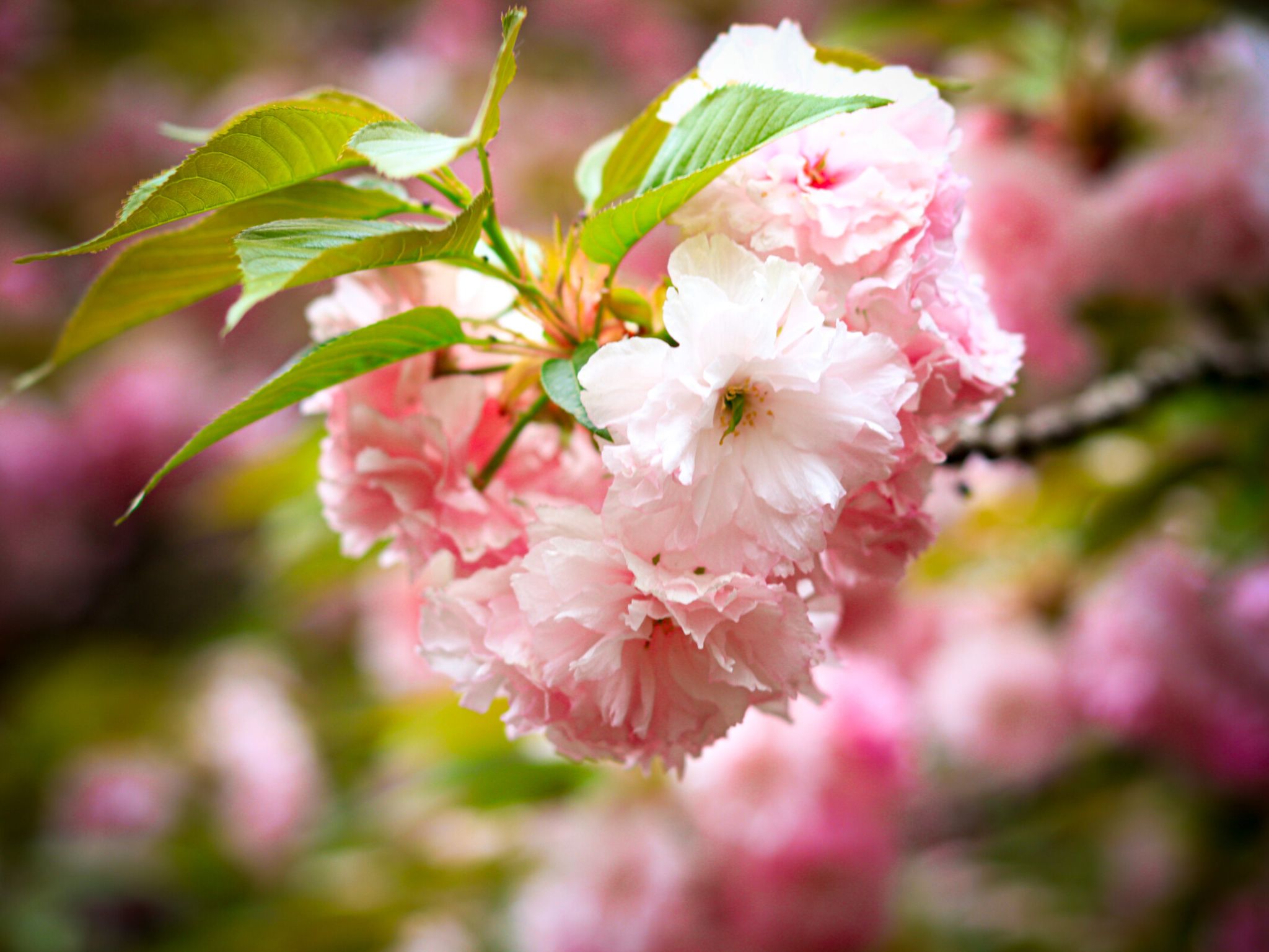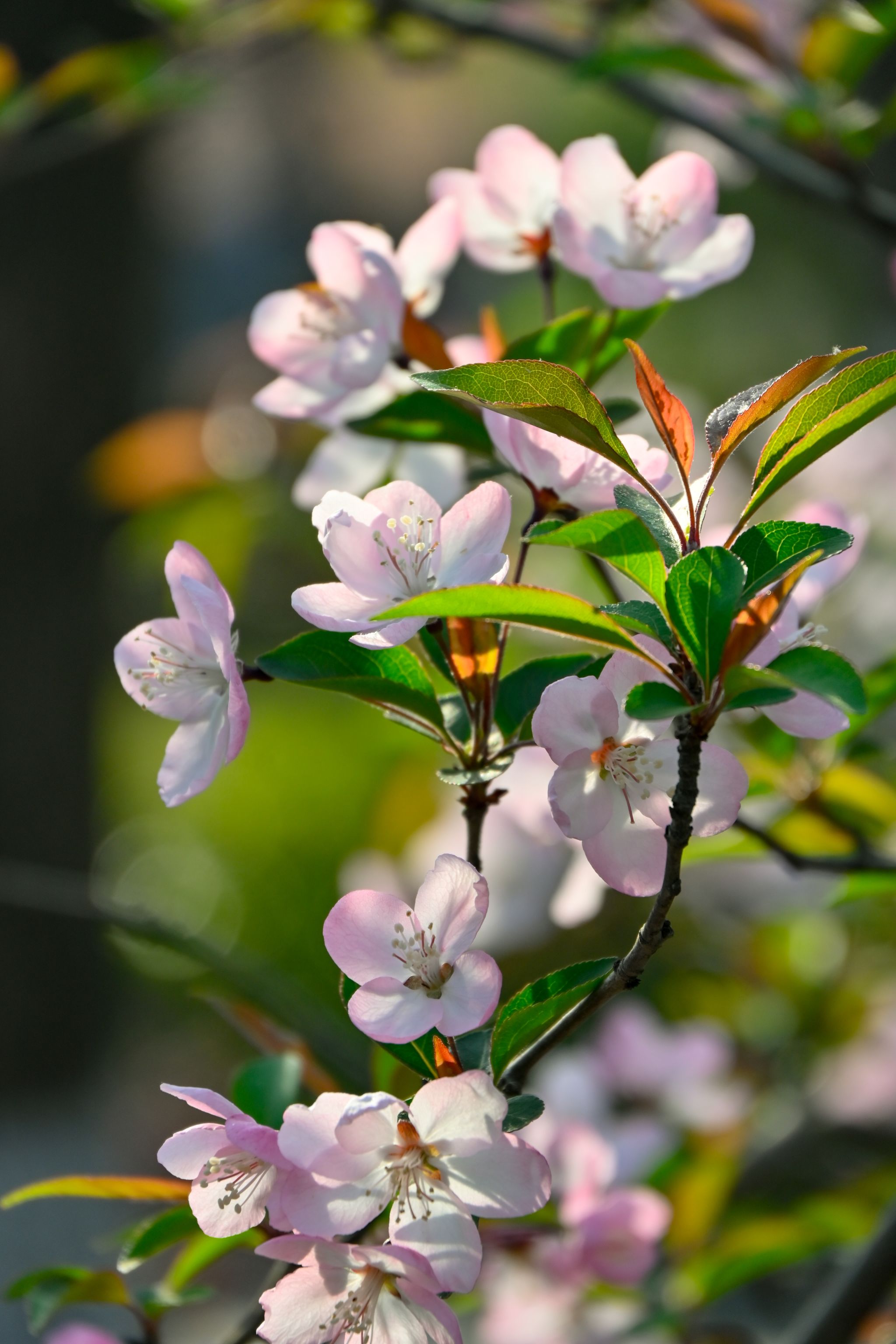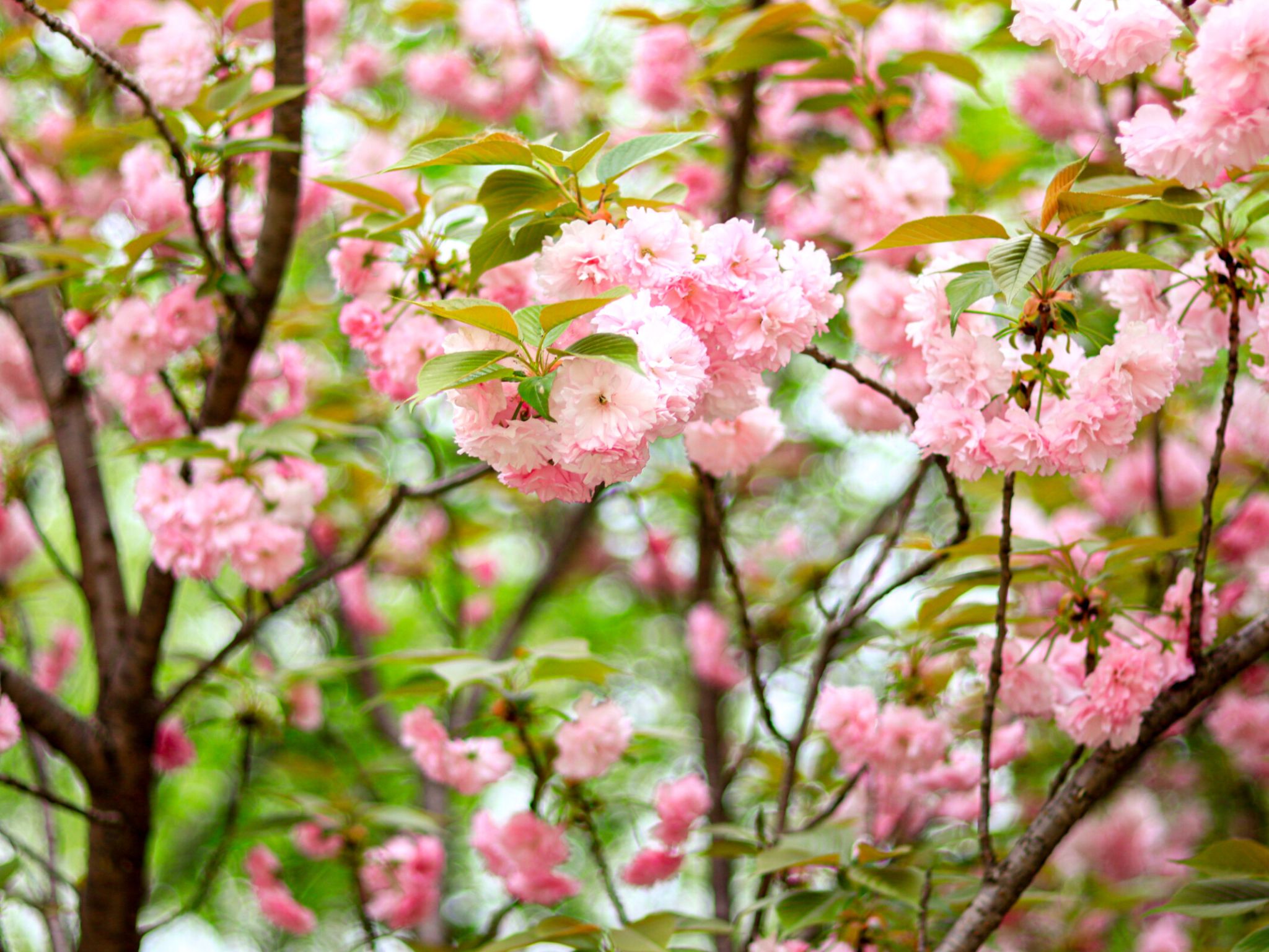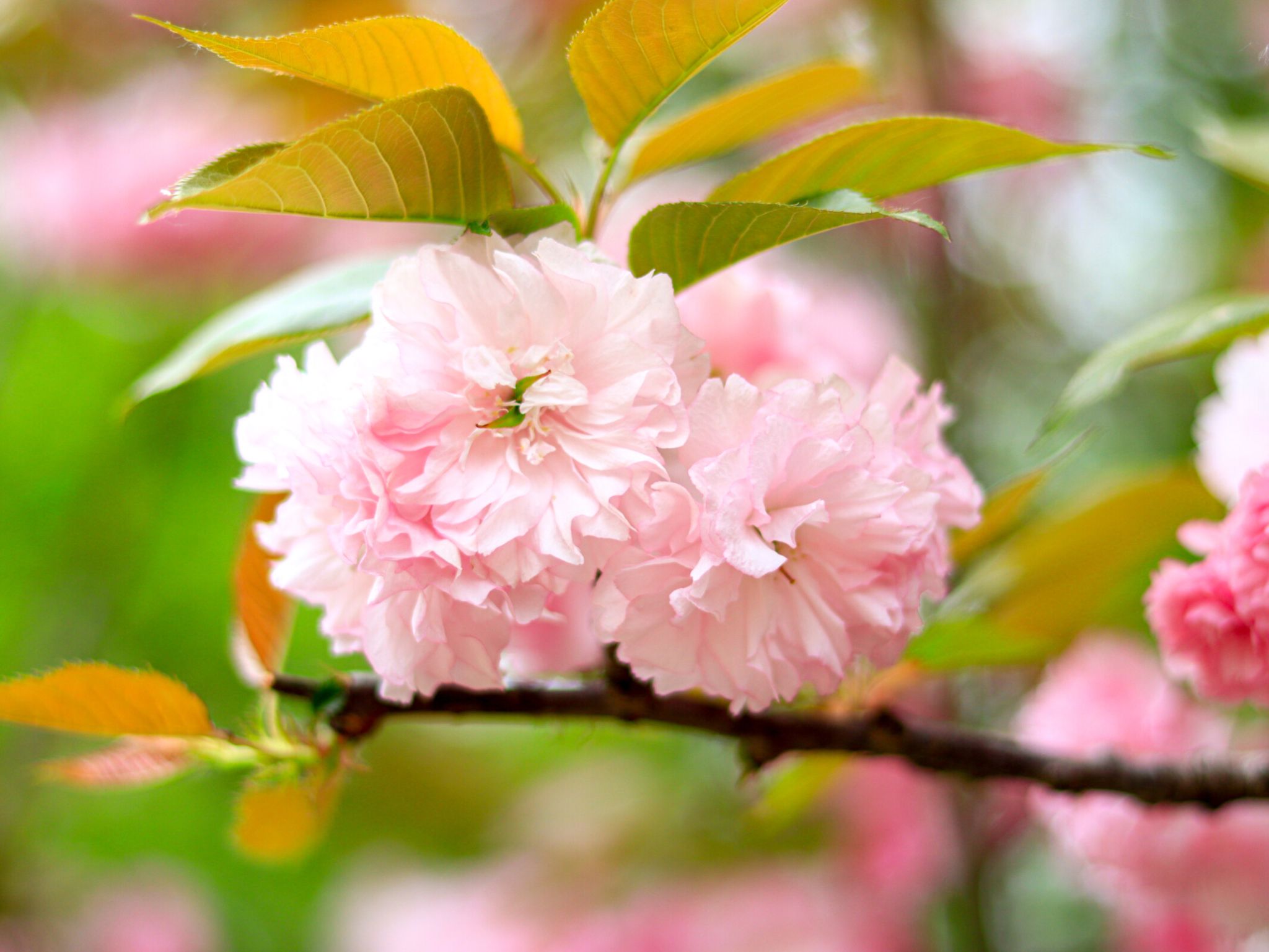 晚樱属于蔷薇科樱属落叶乔木,别名重瓣樱花,是樱花家族中花期较晚的品种。其叶片椭圆状卵形,花朵大而艳丽,花瓣层层叠叠,有粉红、白色等色,盛开时花团锦簇,如云霞般绚烂。晚樱喜阳光充足的环境,耐寒性较强,常作为行道树或园林景观树。晚樱的花语是 “转瞬即逝的美”,象征着美好的事物虽短暂却令人难忘。花期在4月左右,鸭脖樱园、北园研究生宿舍附近可见。