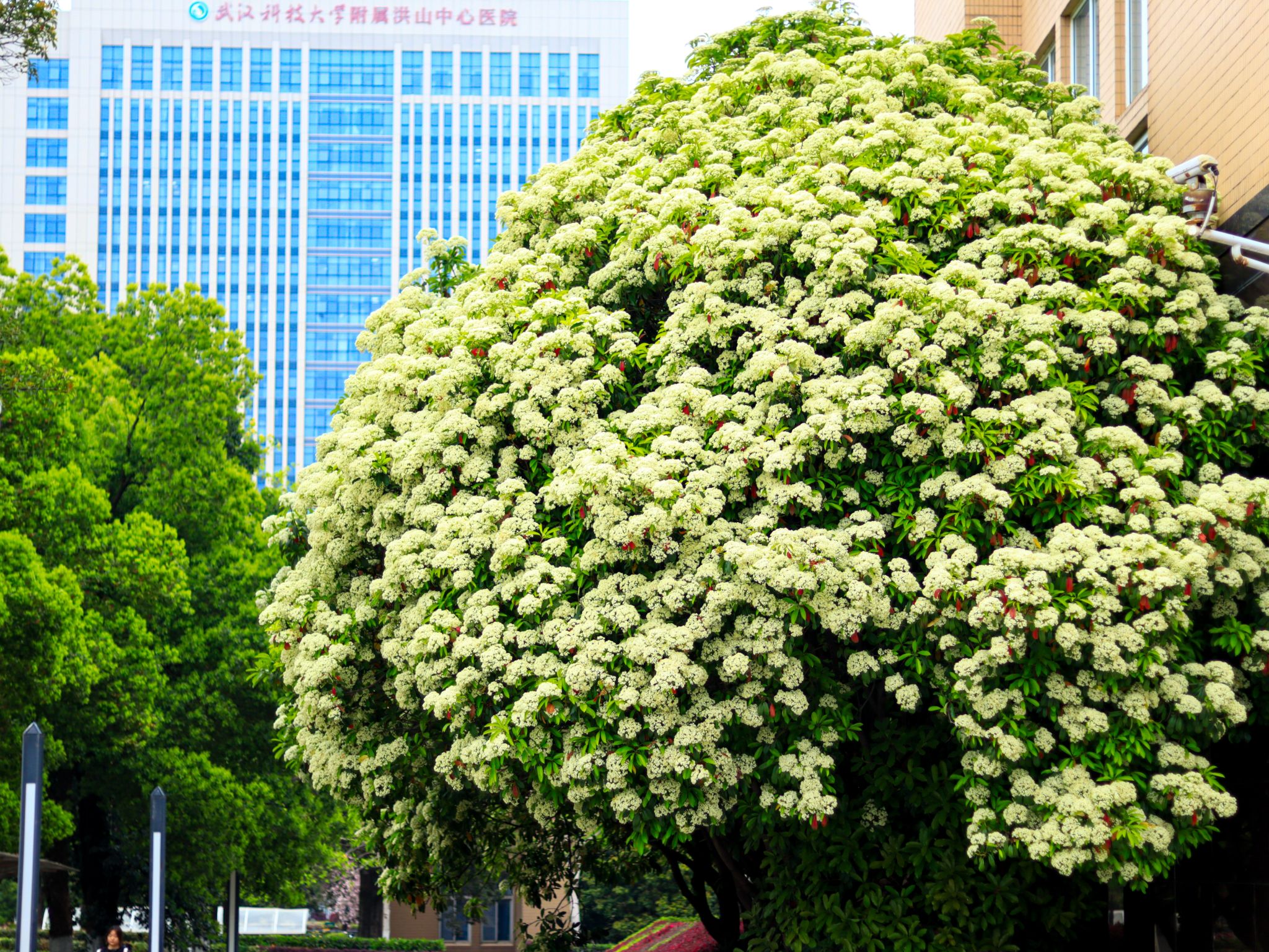 石楠花是蔷薇科石楠属常绿灌木或小乔木,别名千年红、扇骨木。叶片革质,长椭圆形,春季开花,白色小花密集成顶生复伞房花序,虽花形小巧,但花量繁多。石楠花喜光耐旱,抗病虫害能力强,常作为城市绿化树种,可净化空气、隔离噪音其花语是“孤寂、庄严”。花期在4-5月,鸭脖教一楼、教二楼周边和沁心岛可见。