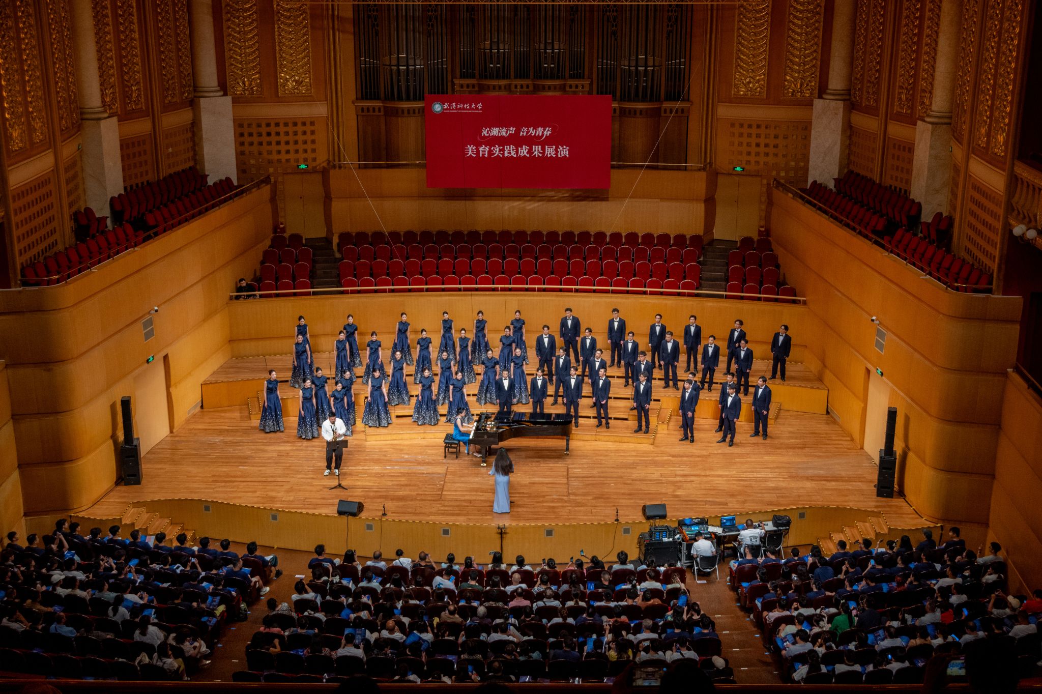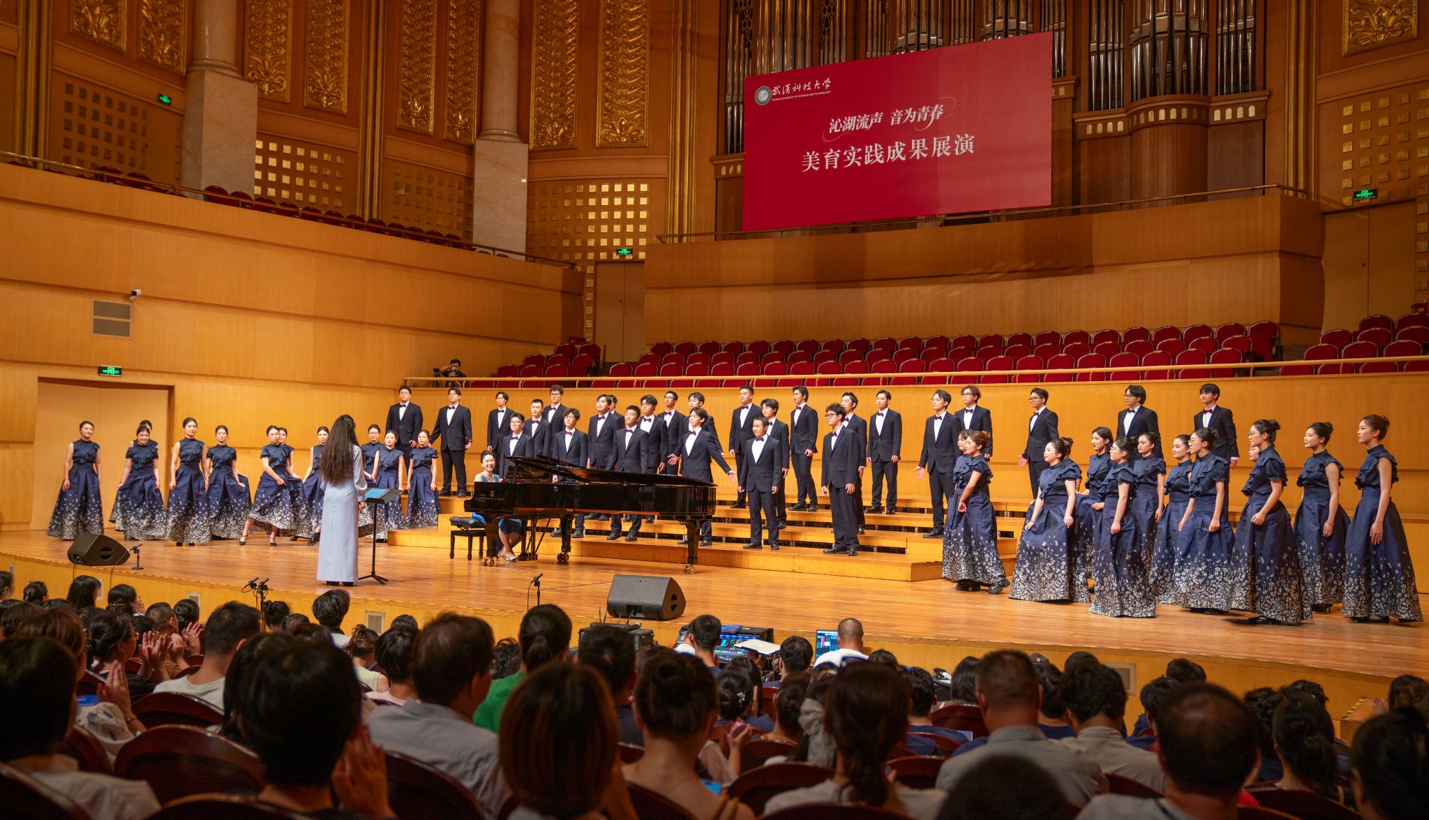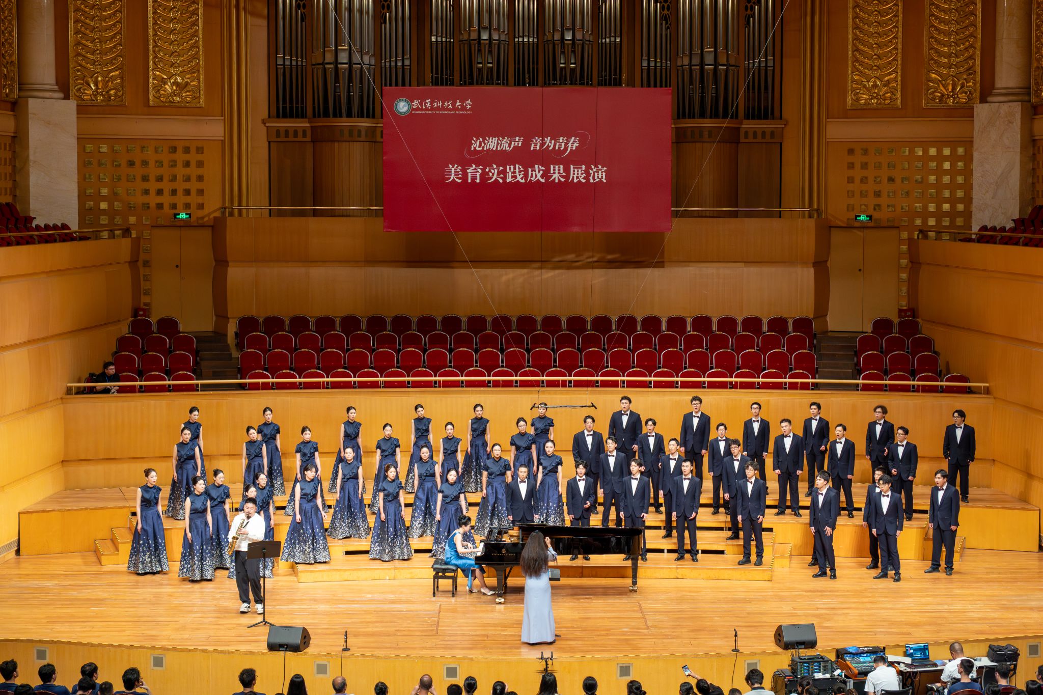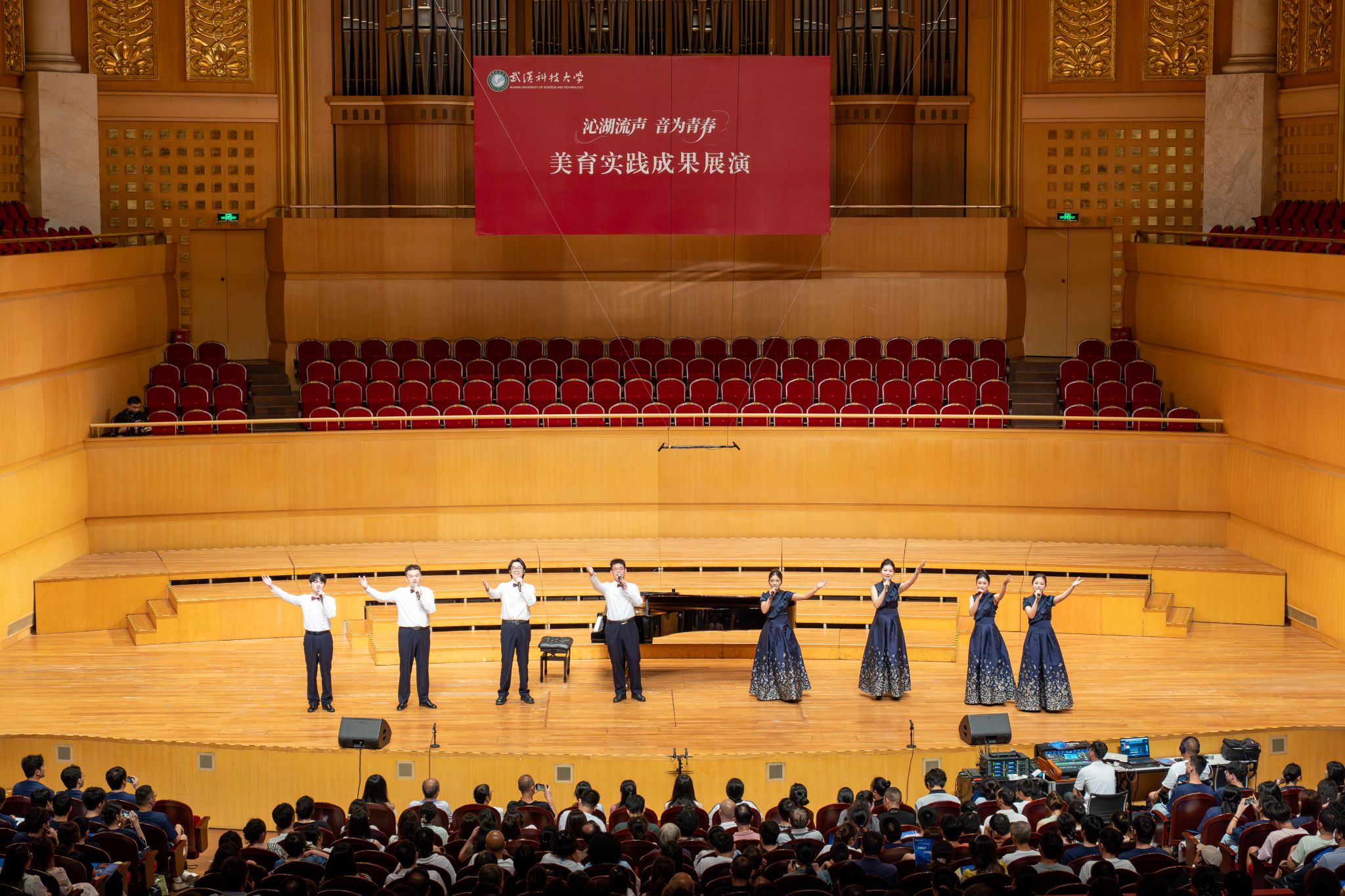 9月6日晚,鸭脖“沁湖流声·音为青春”美育实践成果展演在武汉琴台音乐厅举行。校长倪红卫,党委副书记孙国胜,副校长吕勇、马腾,湖北省教育厅体育卫生与艺术教育处二级调研员姜贵君,湖北经济学院党委副书记汪达等出席活动,与数千余名师生、校友与音乐爱好者一同观看演出。