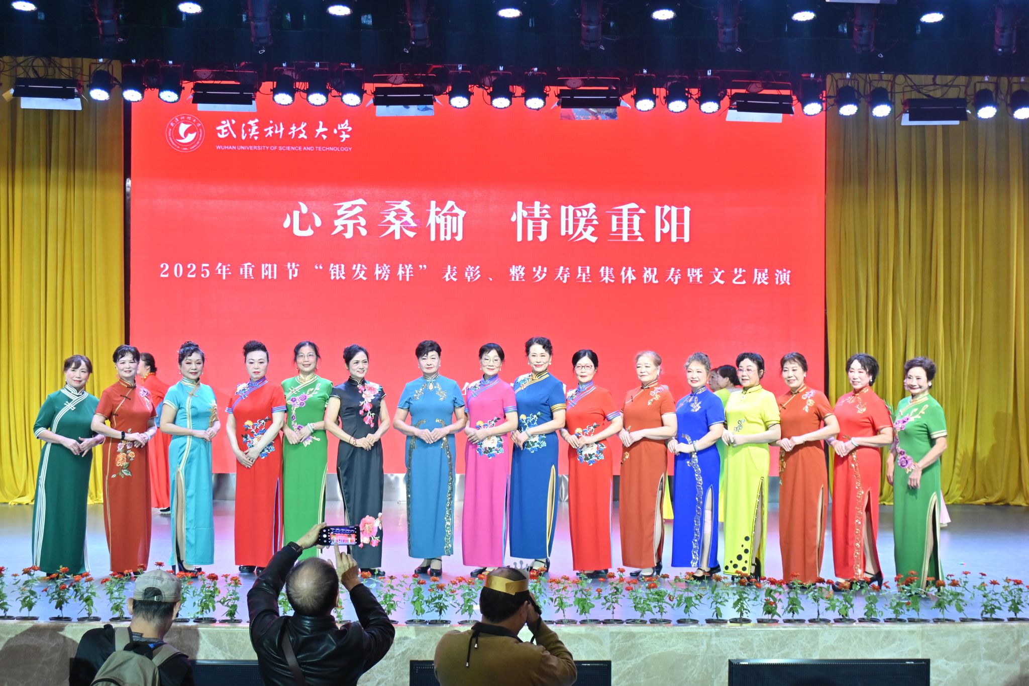 10月28日上午,学校在青山校区碧园会堂举行“银发榜样”表彰仪式暨重阳节集体祝寿活动,现场表彰首届“银发榜样”离退休教职工先进集体、个人,校领导为整岁寿星祝寿。文艺展演环节,京剧表演、湖北小板、时装秀等表演丰富多样、精彩纷呈。
