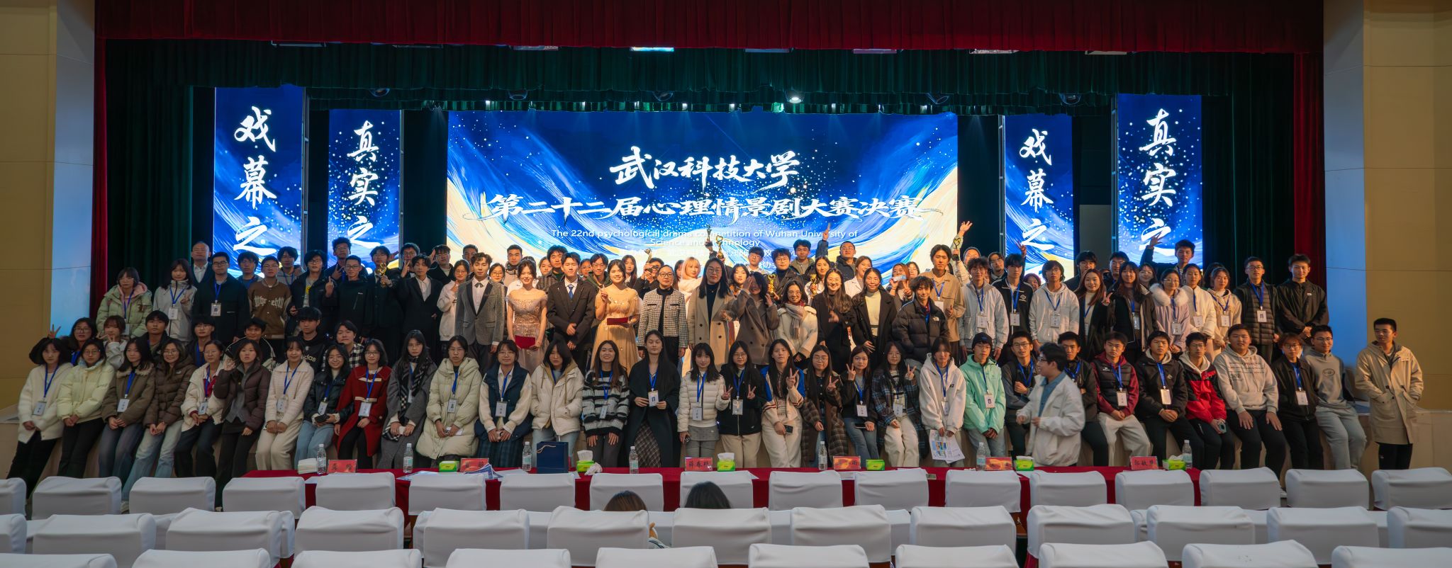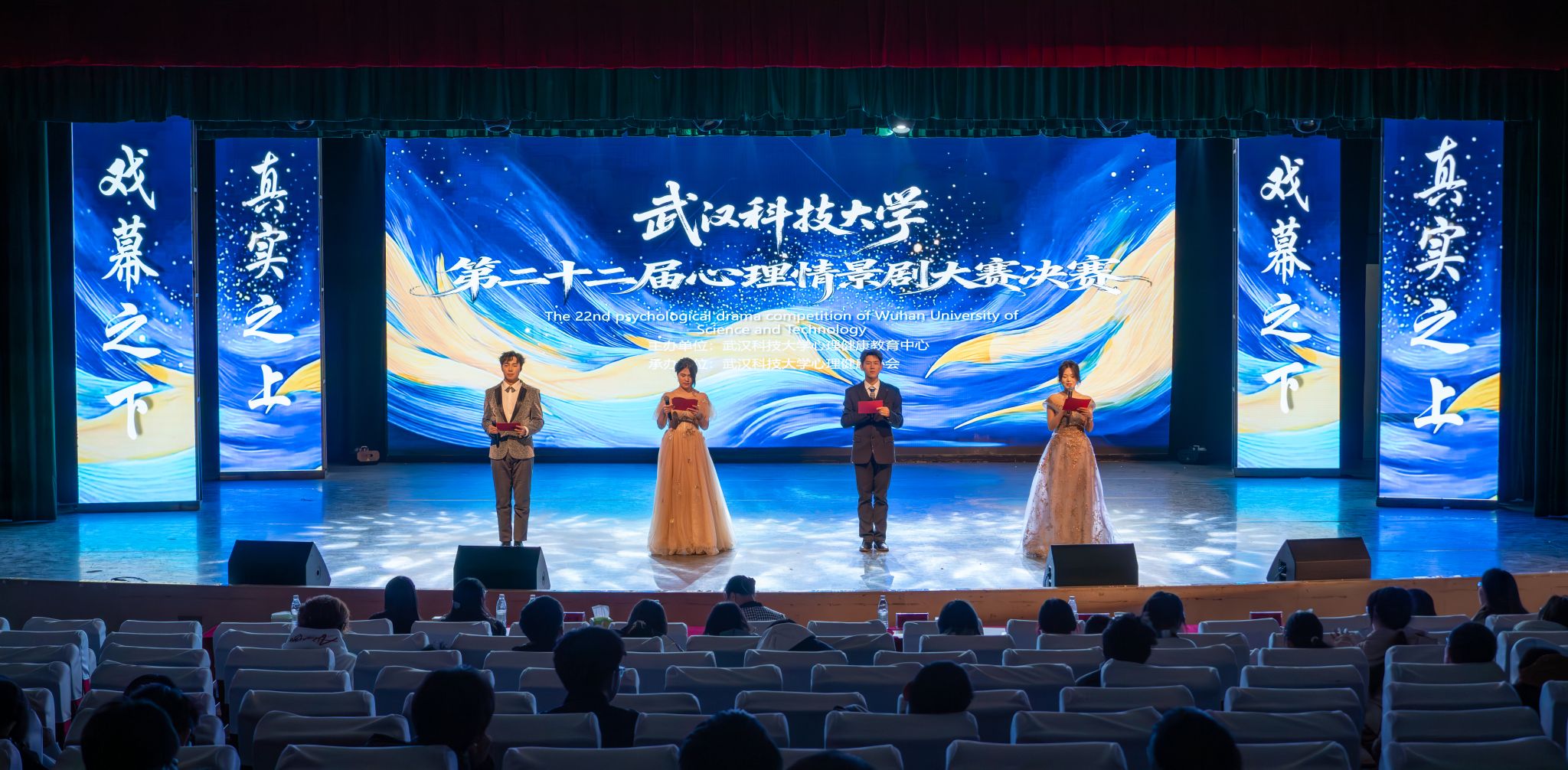 11月27日,鸭脖“戏幕之下,真实之上”第二十二届心理情景剧大赛决赛在沁湖礼堂举行。来自医学部、机械工程学院、法学与经济学院、冶金与能源学院、外国语学院的6支参赛队伍入围决赛。决赛评出了一、二、三等奖、最佳男女主角奖、最佳编剧、导演奖。(孙正恒)