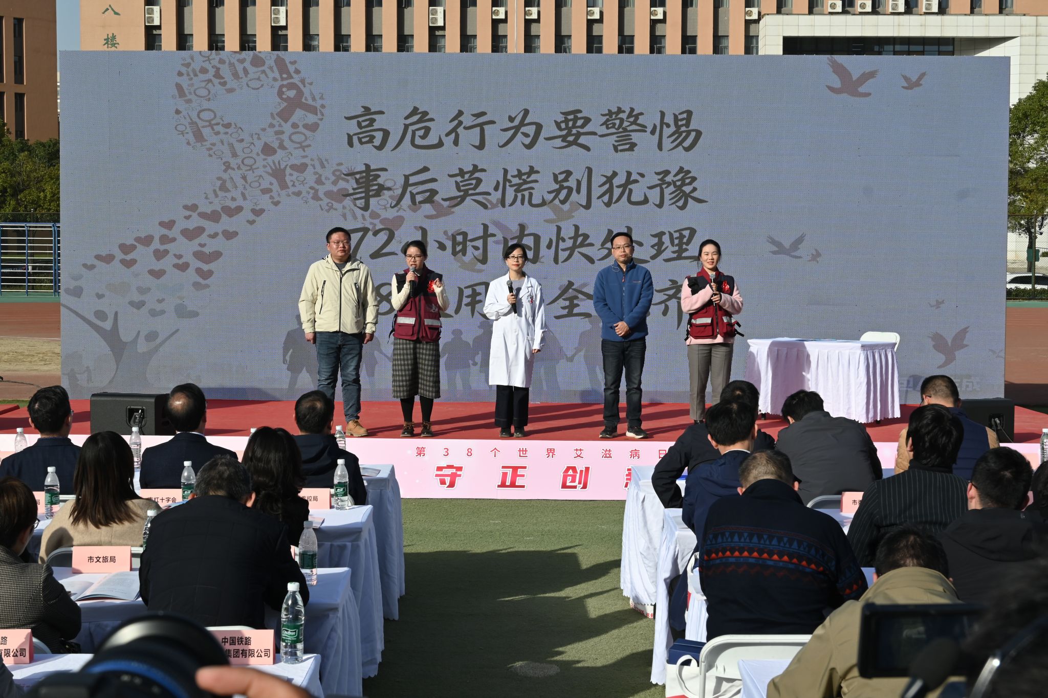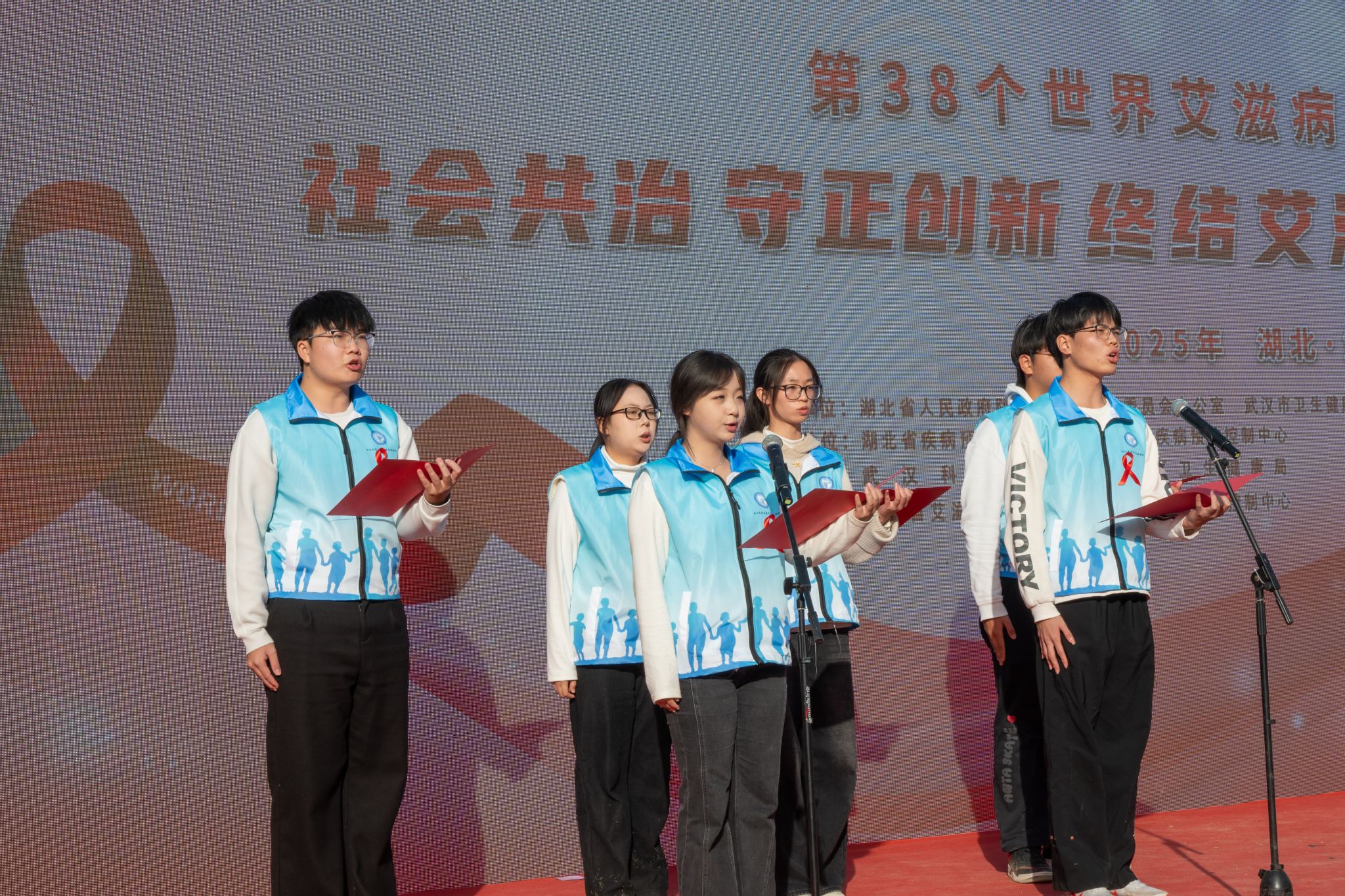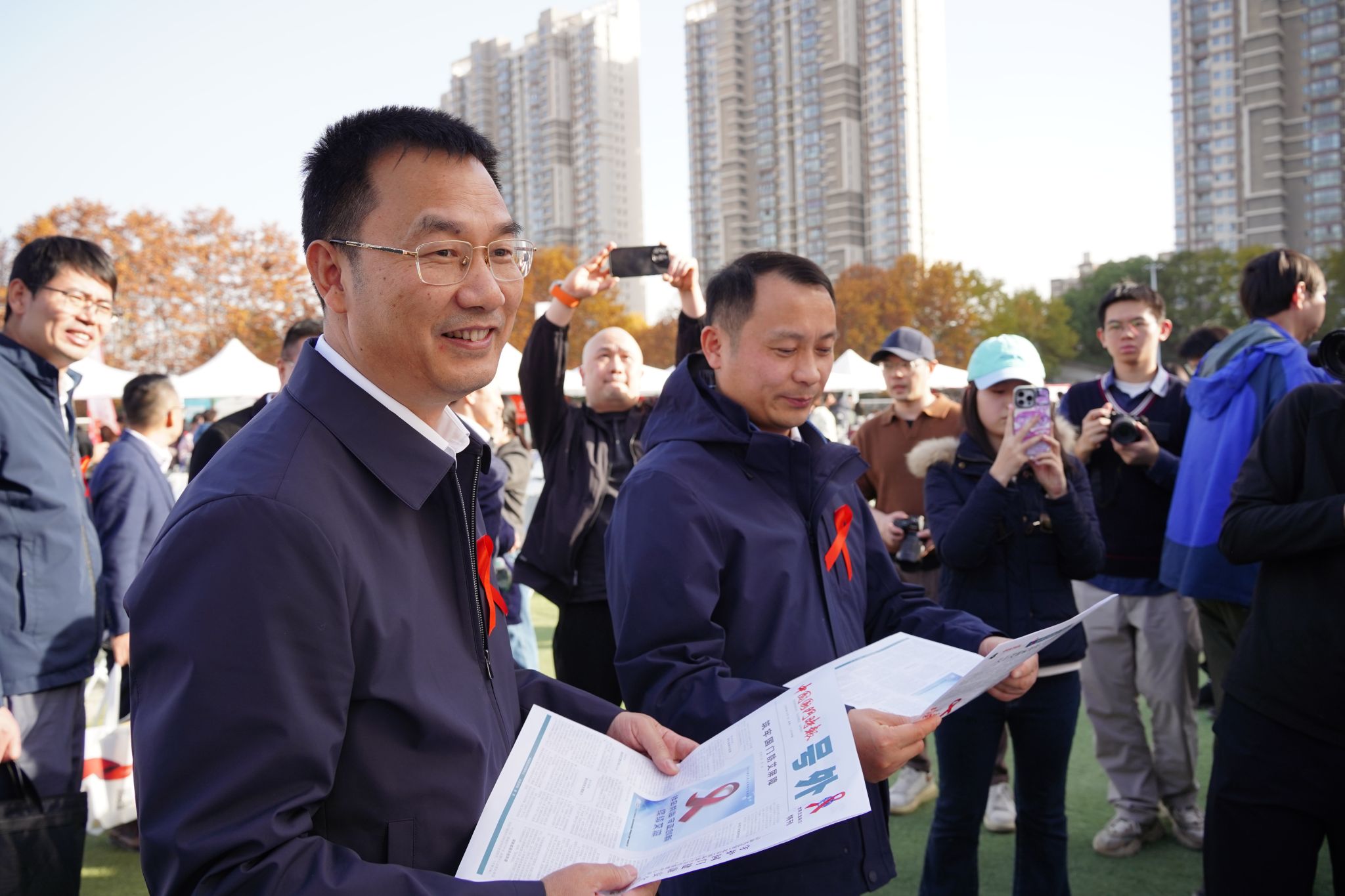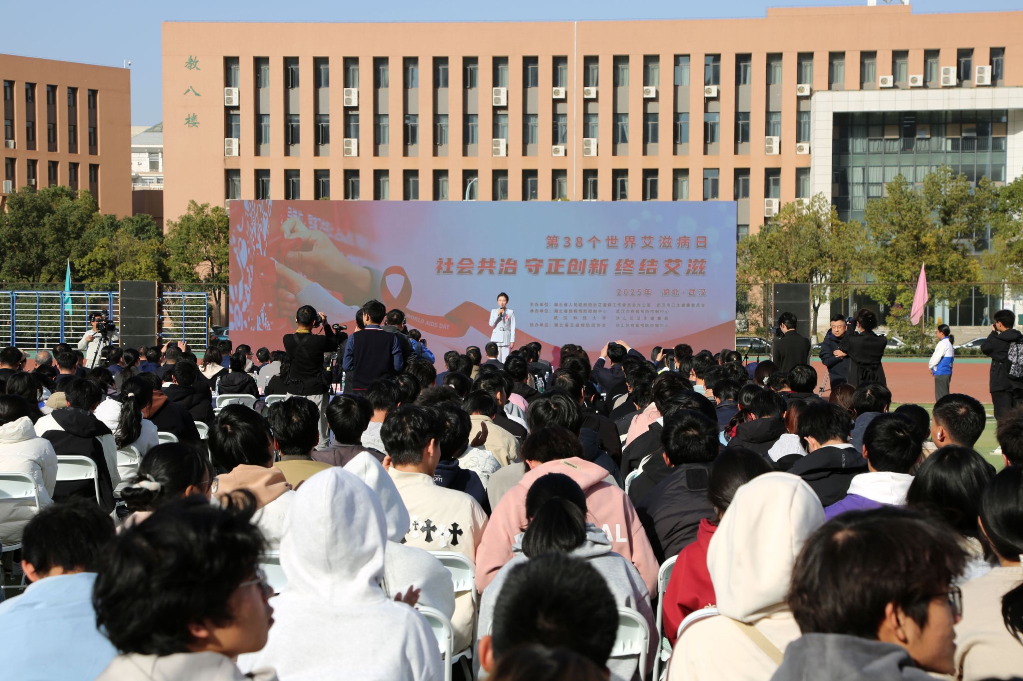 11月27日,湖北省第 38 个“世界艾滋病日”主题宣传活动在鸭脖黄家湖校区南区体育场举办。鸭脖、市卫健委、省政府防艾办和其他相关单位负责人参加启动仪式。启动仪式后,高校学生代表宣读倡议书,团省委、团市委为志愿者授旗。湖北省疾病预防控制中心等单位、企业在现场搭建展台,为师生们答疑解惑、提供健康建议。(孙正恒)
