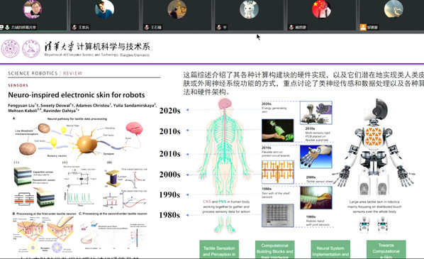 “触觉感知是类人机器人研究的重要课题。”方斌首先围绕机器人触觉传感的发展历程进行讲解。随后,方斌教授就“针对机器人触觉感知的卡脖子关键技术问题,详细介绍了视触觉感知等关键技术”,为师生提供了多学科融合实现触感稳定和实现高质量多模态触感的解决思路。