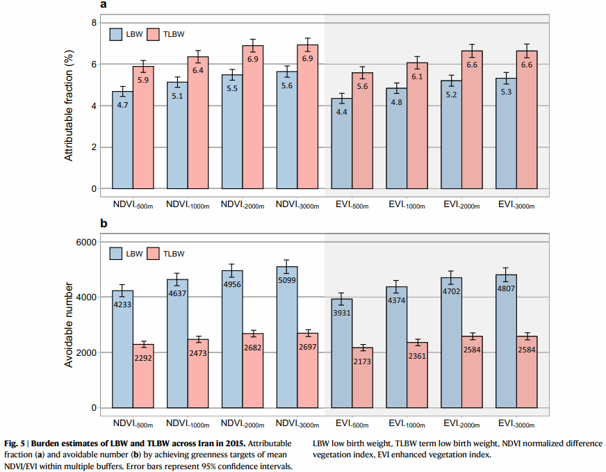 研究利用伊朗2013–2018年全国749家医院的400万母婴对数据,探讨了不同植被指数(NDVI、EVI)和缓冲区范围下(500米、1000米、2000米和3000米)产妇孕期绿地暴露与胎儿低出生体重(LBW)风险之间的流行病学关联,并通过反事实分析框架量化了增加绿地覆盖可避免的LBW数目。