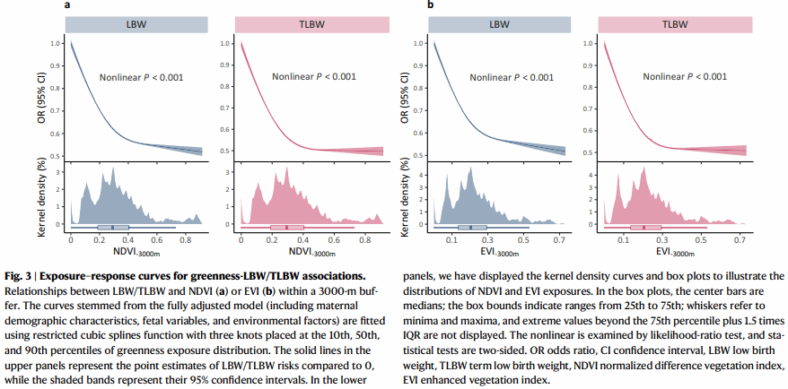 研究结果显示:不同缓冲区NDVI/EVI绿地暴露与LBW/TLBW均呈现显著的非线性关联(Nonlinear P<0.001),暴露反应关系大致呈L形。在相对较低的绿地暴露下,绿地暴露的增加与LBW/TLBW风险的急剧降低显著相关,而在高绿地暴露下(如NDVI>0.4)风险下降效应显著减弱。其中,NDVI-3000m每增加0.1个单位,LBW和TLBW的风险比分别为0.911 (95% CI: 0.908–0.914)、0.885 (95% CI: 0.881–0.889)。2015年,若实现2013–2018年500–3000 m缓冲区的平均NDVI/EVI的绿化目标,可以避免3931–5099例LBW和2173–2697例TLBW的发生,占伊朗总LBW数的4.4–5.6%、总TLBW数的5.6–6.9%。上述研究发现可在国家甚至全球层面为评估绿地暴露的健康收益提供重要参考,并可为解决LBW风险的不平等性和促进环境公平提供有价值的科学证据。