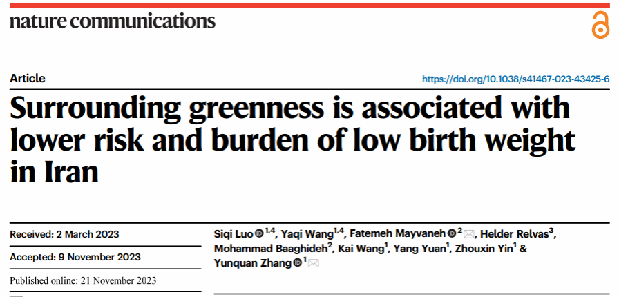 武科大网讯 近日,医学部公共卫生学院张云权老师团队在综合性期刊Nature Communications(IF2022=16.6)上发表原创研究论文Surrounding greenness is associated with lower risk and burden of low birth weight in Iran(https://www.nature.com/articles/s41467-023-43425-6)。论文(共同)第一作者为yabo鸭脖官网公共卫生学院硕士研究生罗思琦(2020级)、王亚奇(2022级),共同通讯作者为Fatemeh Mayvaneh博士和张云权老师,yabo鸭脖官网为第一作者单位。