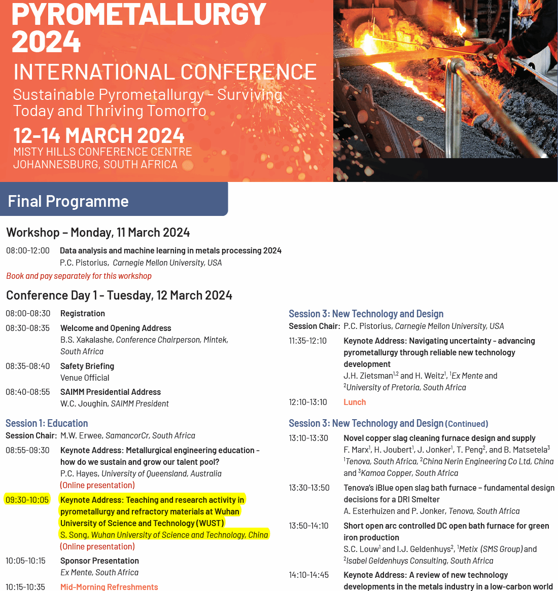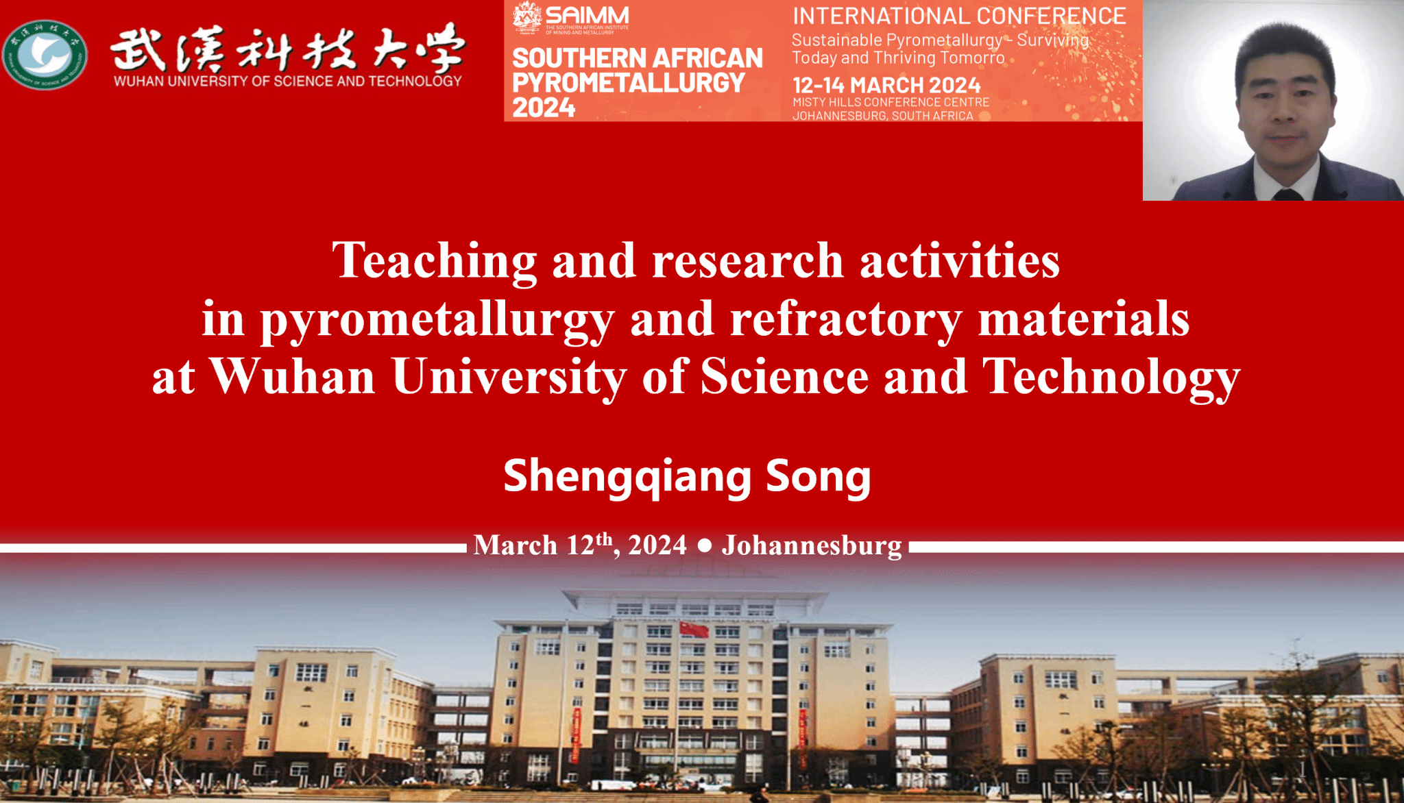 武科大网讯 3月12至14日,由南部非洲矿业与冶金学会(Southern African Institute of Mining and Metallurgy)举办的南部非洲国际火法冶金会议(SA Pyrometallurgy,2024)在南非约翰内斯堡召开。鸭脖材料学部教师宋生强受邀作大会特邀报告,介绍了鸭脖火法冶金及耐火材料领域的教学科研情况和中非合作进展。