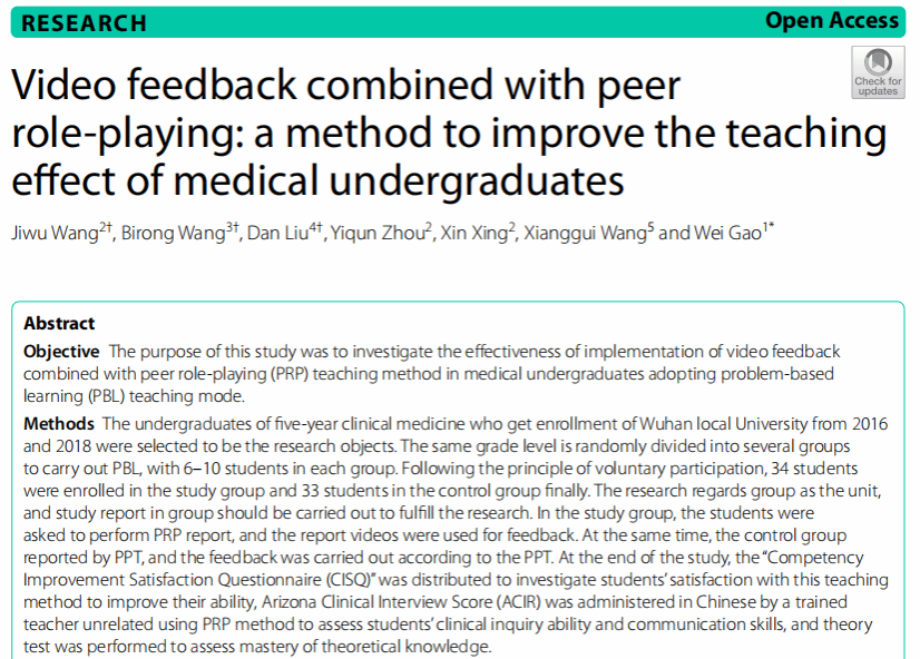 在教学中,反馈是学习过程的重要组成部分,但在医学教育中缺乏反馈是一个反复出现的问题,而高质量的反馈可以促进医学生的学习和成长,以及个人职业发展。在本研究中,团队选取了采用小班教学的临床医学五年制本科生共67人,分成研究组和对照组。以小组为单位,采用“组中组”的形式,在研究组中利用视频反馈与同伴角色扮演相结合的教学方法。研究结果显示该教学方法在医学本科生临床医学教育中是有效的,它可以激发学生主动学习的兴趣,提高人际交往能力,提高学习效率和临床知识技能,提高成为一名真正医生的信心。