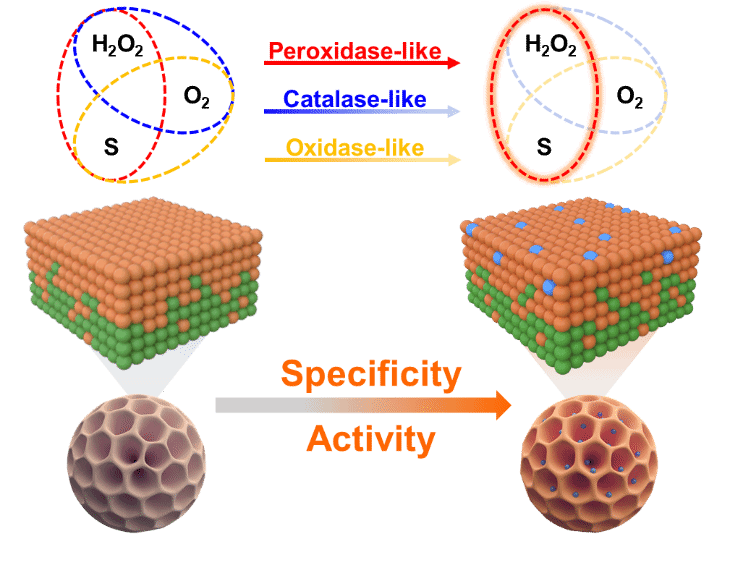 该研究通过痕量异金属Bi的掺杂,特异性提升了核壳介孔Pd@Pt纳米酶的类POD活性。其中,原子级的组分调控不仅可有效防止掺杂金属原子的聚集,并且超低浓度的掺杂金属和贵金属载体在原子水平上的强相互作用可以显著修饰活性位点的电子结构,从而特异性的提高其催化活性。研究表明,微量Bi掺杂的Pd@Pt介孔纳米球(Pd@PtBi2)的类POD活性比Pd@Pt提高了4倍以上。此外,Pd@PtBi2的类OXD和类CAT活性没有明显增强,有效防止了被测液样中溶解O2的干扰和底物H2O2的不良消耗,有利于保证传感的灵敏度和准确性。基于此,开发了基于Pd@PtBi2的传感平台实现了AChE活性的灵敏检测。并进一步利用Pd@PtBi2和AChE的级联催化,建立了OP比色生物传感器。该传感器具有较高的灵敏度和抗干扰能力,检出限达0.06 ng mL-1。本研究为特异性高、类POD活性高的贵金属基纳米酶的设计提供了一种有效的策略,并将有效促进该类纳米酶在比色生物传感中的应用。(化工学院)