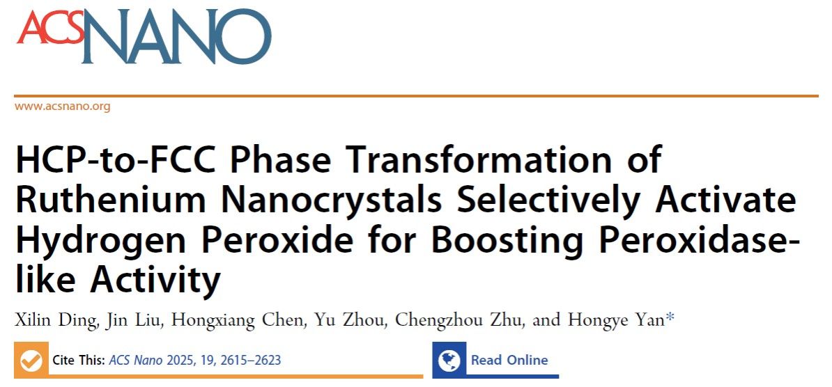 武科大网讯 近日,鸭脖化学与化工学院严红烨博士团队与华中师范大学教授朱成周课题组合作,在国际顶级期刊《ACS Nano》发表题为“HCP-to-FCC Phase Transformation of Ruthenium Nanocrystals Selectively Activate Hydrogen Peroxide for Boosting Peroxidase-like Activity”的高水平论文(DOI: 10.1021/acsnano.4c14346),该研究通过钌纳米晶的稳态HCP相到亚稳态FCC相变,实现了对H2O2的选择性活化,特异性增强了钌纳米晶的类过氧化物酶活性,为钌基纳米材料在生物传感领域的应用提供了新思路。论文第一作者为鸭脖硕士研究生丁习林,通讯作者为严红烨,鸭脖为论文第一单位。