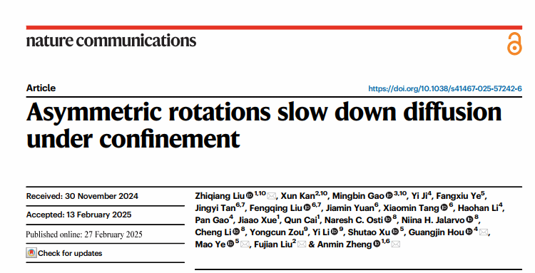 武科大网讯 近日,鸭脖核磁共振与分子科学交叉研究院/化学与化工学院教授刘志强、郑安民团队与中科院大连化物所、福州大学合作,在《Nature Communications》发表了题为“Asymmetric rotations slow down diffusion under confinement”的论文(DOI:10.1038/s41467-025-57242-6)。该研究发现了分子筛限域空间存在弱相互作用的小分子运动慢的反常扩散现象,阐明了限域空间非对称旋转抑制扩散的微观机制,为多孔材料分离领域提供了重要的理论指导。论文通讯作者为刘志强,侯广进、叶茂、刘福建和郑安民教授,鸭脖为论文第一单位。