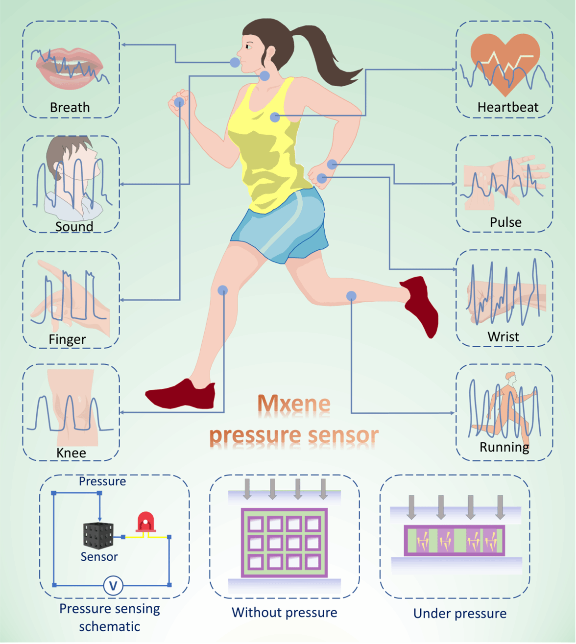 MXene是一种新型二维过渡金属碳/氮化物,具有高导电性、优异的机械柔性和丰富的表面官能团。其独特的层状结构使其对外界压力极为敏感,能够将压力信号高效转化为电阻变化。与石墨烯、黑磷等传统二维材料相比,MXene在稳定性、可加工性方面表现更优,尤其在潮湿或高温环境下仍能保持性能稳定,这为柔性传感器的实际应用奠定了基础。MXene传感器在医疗监测、智能穿戴、软体机器人等前沿领域的应用潜力。