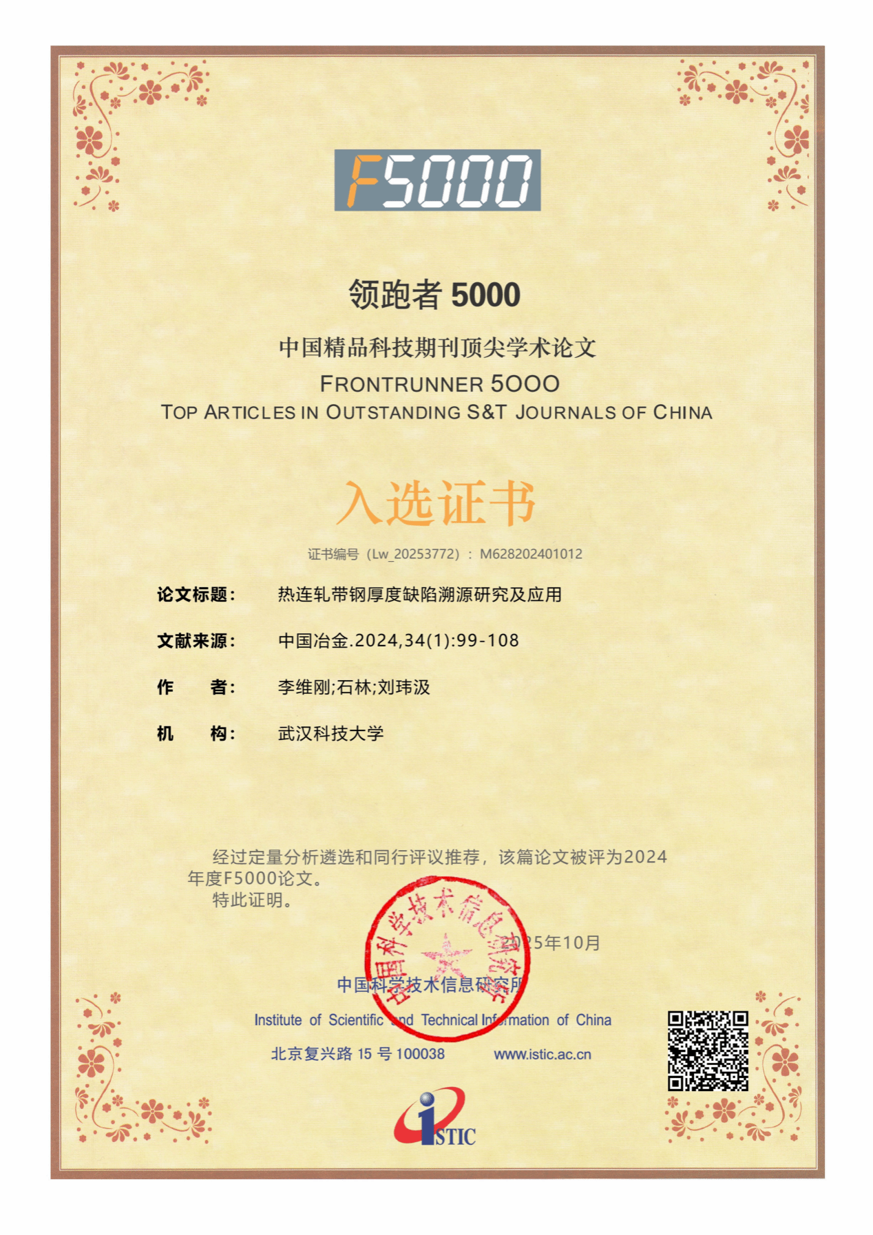 武科大网讯 近日,国家科学技术部中国科学技术信息研究所(以下简称“中信所”)公布了2024年度“领跑者5000——中国精品科技期刊顶尖学术论文(F5000)”入选名单。鸭脖人工智能与自动化学院李维刚教授团队撰写的《热连轧带钢厚度缺陷溯源研究与应用》成功入选。该文发表于《中国冶金》期刊,是该刊本年度入选的13篇顶尖论文之一。