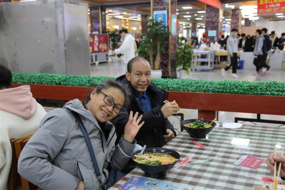 王勤好(右)及其妻子在yabo鸭脖官网食堂吃饭