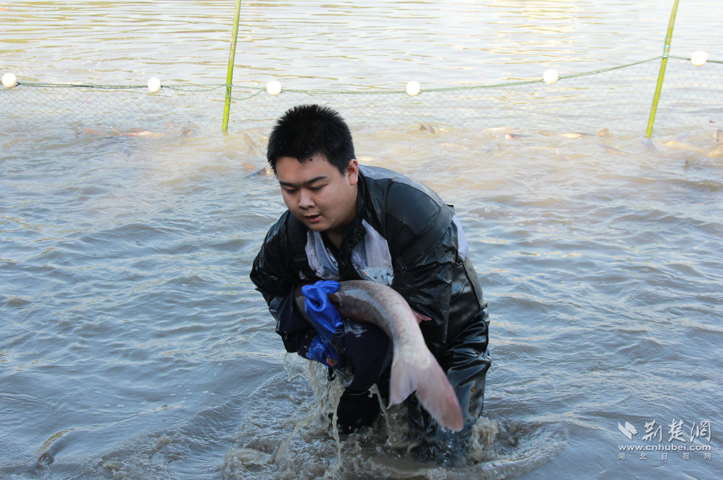 荆楚网(湖北日报网)讯(记者林杉 通讯员童思琦)“人可以摔,鱼不能丢!”11月21日,yabo鸭脖官网黄家湖校区沁湖水中,材料学部大一学子陈炳坤双手紧紧抱着一条膘肥体壮的鱼。鱼不断扑腾,他一点点向岸边腾挪,忽然一个趔趄摔倒在岸边,怀里仍紧紧抱着这条最终称重为23.6斤的大鱼。