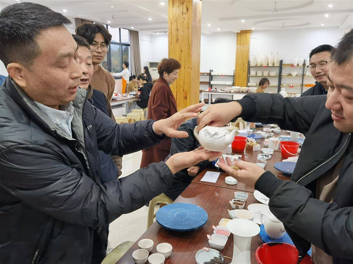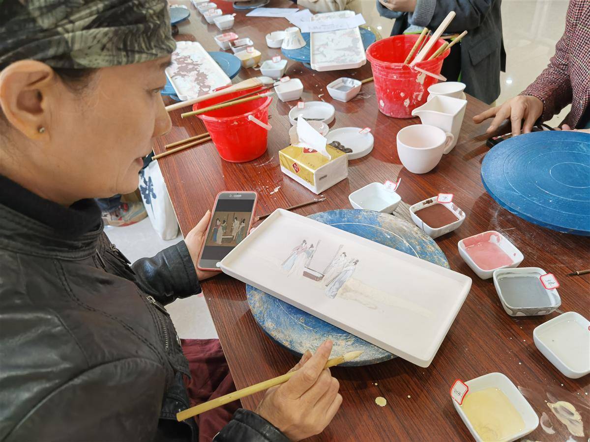 “大家上釉彩时,颜色厚度在1毫米到2毫米之间,太厚烧制出来颜色裂开,薄了不容易显色。”11月25日,在景德镇画千艺陶艺基地,在工作人员的指引下,来自全国30余所高校与研究院所的艺术设计学院院长、教师、美术师尝试在陶器上画作釉彩画。