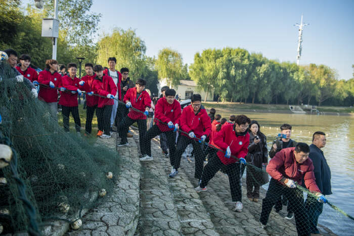 上午八时许,伴随着一阵高亢嘹亮的号子声,该校后勤集团的师傅们鱼贯入水,拾起凌晨沉入沁湖中的渔网,由北至南开始收网,岸上近百名学生代表及后勤保障部工作人员沿岸拉纤。九时许,来自各学院的16名学生代表下水捞鱼,各自从捕捞上来的鱼中挑选一条大鱼,上岸称重后选出“捕鱼王”。