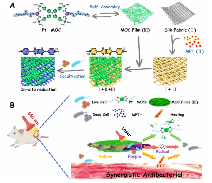 金属-有机环/笼(MOCs)作为一种潜在的可替代抗生素的抗菌候选材料,因其优异的抗菌性能而备受关注。然而,纳米MOCs在可加工性和可迁移性方面的困难限制了其实践应用。王晓强等研究人员开发了具有实时感染指示和高时空精度的新型伤口愈合敷料(图1)。采用多级自组装厘米级PtMOC膜(III)与阳离子染料(MPT)染色后的真丝织物(I+II)创新性组合(图1A),实现在宏观尺度上合理地应用PtMOC膜,并有效控制治疗输出。真丝织物上的阳离子染料MPT与细菌共培养后发生明显的颜色变化(从浅黄色变为深紫色),原位还原到其自由基形式,可用于实时监测伤口感染(2h内即可出现明显变色现象)。此外,MPT自由基在660nm激光照射下表现出良好的光热效应,可以诱导和控制PtMOC膜多级组装结构的分解,有效提高了抗菌效率,促进感染创面快速愈合(图1B)。这项工作为厘米级金属-有机环/笼(MOCs)材料的宏观实践应用、细菌实时监测和促进伤口愈合提供了新的思路。