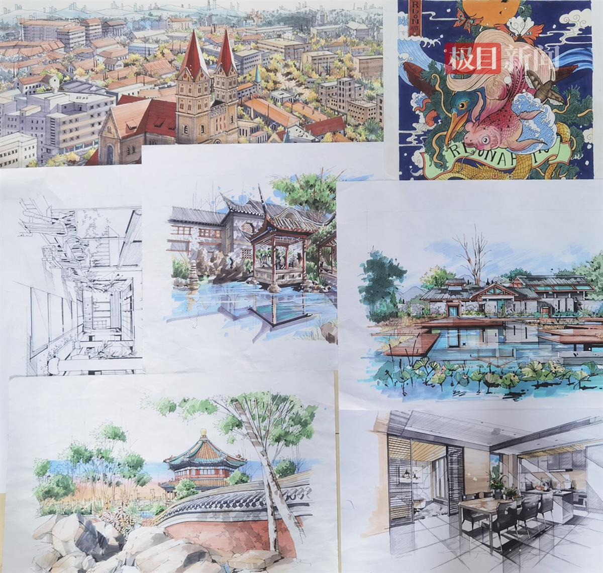 大二课程繁忙,张雨玺还兼顾班长,她挤出时间观看江南大学的环境设计网课,掌握专业所需手绘技能,自学CAD等5种建模渲染软件。张雨玺积极参加学校绘画比赛,获得过学校樱花节绘画组一等奖、涂鸦大赛非专业组第一等。