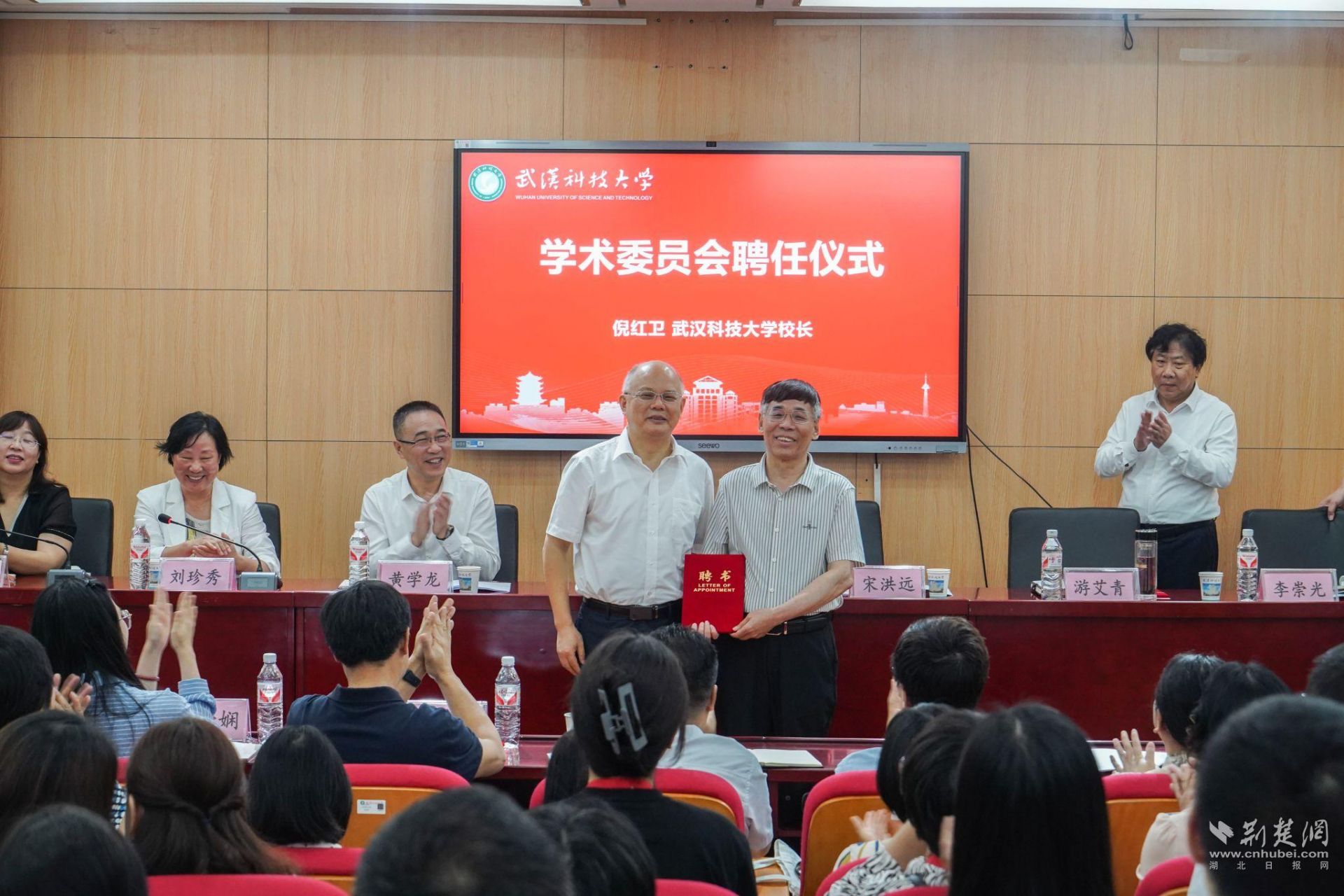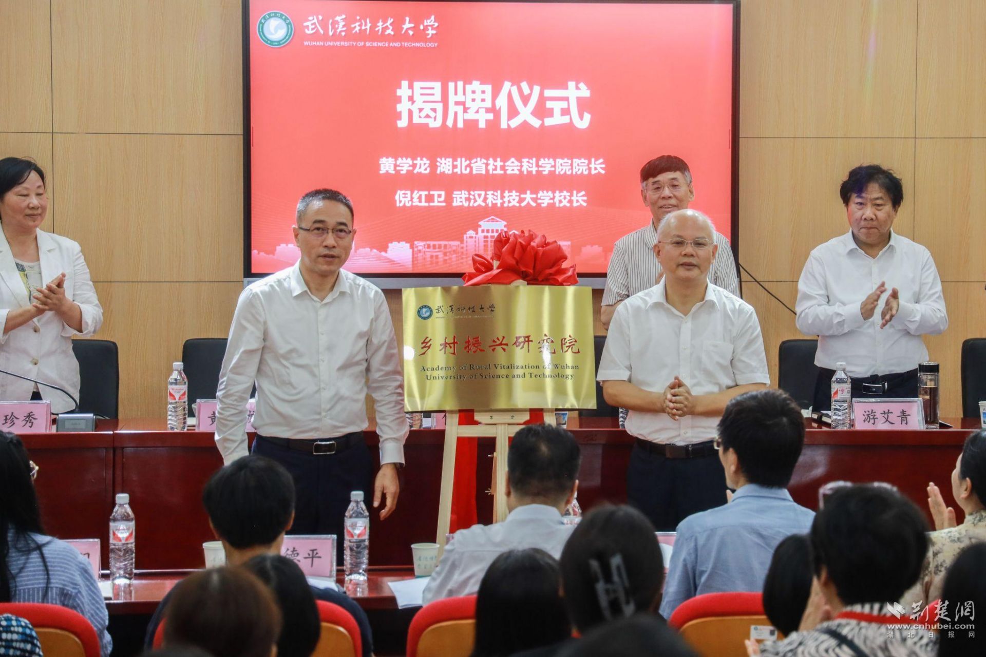 黄学龙和倪红卫为乡村振兴研究院揭牌。倪红卫为乡村振兴研究院学术委员会主任宋洪远以及李崇光、游艾青、邹薇、向德平、彭玮、许成祥、管家庆、刘文波等八名学术委员颁发聘书。