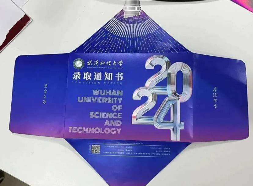 武科大2024年录取通知书延续学校特有的“钢铁品质”和科技感,以“钢铁”为主题颜色呈现钢铁淬火时的蓝紫渐变色通知书从背面整体展开后呈现钢包溅射铁花的效果,寄托着对新一代探索者的殷殷期盼。封面数字“2024”钢铁视觉质感由AI生成,折射出武科大深厚的科技底蕴,展现着武科大钢筋铁骨的精神气质。