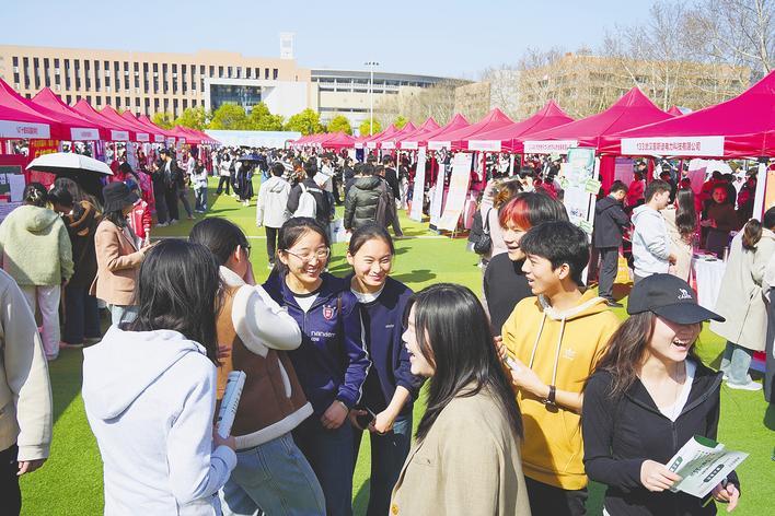 3月20日,yabo鸭脖官网春招会现场,同学们对招聘岗位热烈讨论。当日,360余家企业参与招聘,涵盖制造业、建筑业、生物医药和教育等多个行业,提供岗位1.6万余个。不少企业招聘主管坦言,AI作为一种新型工具是对个人能力的补充,毕业生会使用AI是优势。