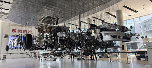 在创维集团,同学们参观了智能电视生产线,从屏幕组装到整机调试,大量的无人工序都展现出智能制造的精密与效率,可旋转智能屏、便携电视等产品设计如何对接科技与用户需求等等。在东风日产花都生产基地,冲压车间的高精度机械臂、焊装车间的自动化流水线,以及57秒一台车的组装效率,让同学们直观体会到现代汽车制造的智能化水平。此外,“天马行空”艺术装置以解构的汽车零件呈现工业之美,进一步拓展了设计思维的边界。粤港澳大湾区工业互联网公共技术服务平台则聚焦“设计+制造”的衔接痛点,构建全链路服务模式突破设计“落地瓶颈”,解决从创意到市场的“最后一公里”难题。